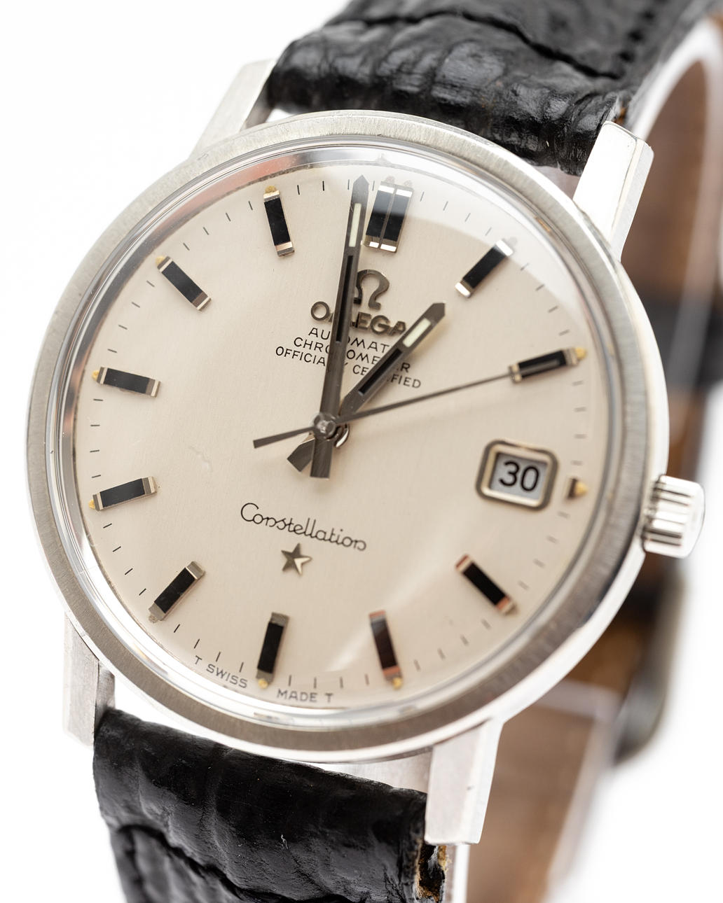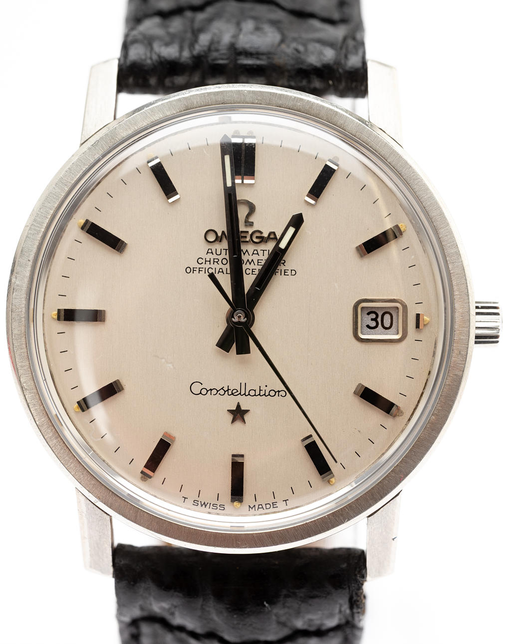 Omega “Constellation”, ref No. 168.018. Caliber No. 564 Stainless steel case, silver dial with hour, minute and second hands, date at '3' clock, plastic glass, leather strap with pin buckle. automatic movement. Dimensions approx. Diameter Ø 35 mm. The clock was ticking at the time of the review, Stockholm's auction shop does not guarantee functionality.