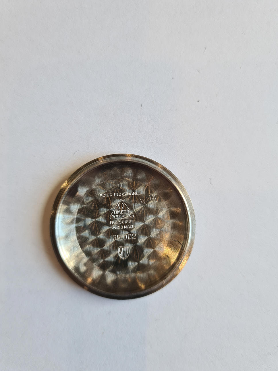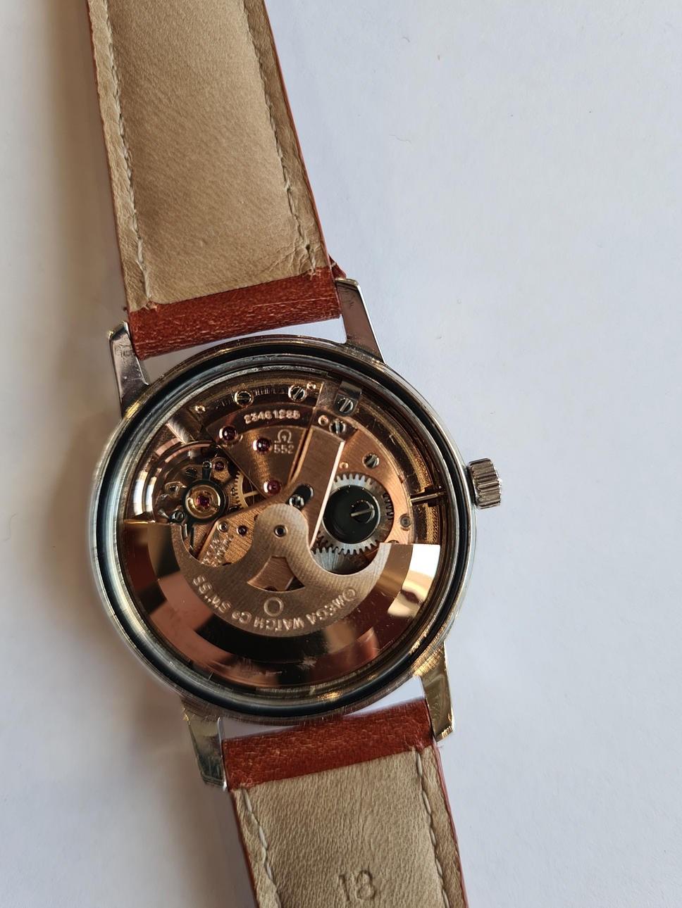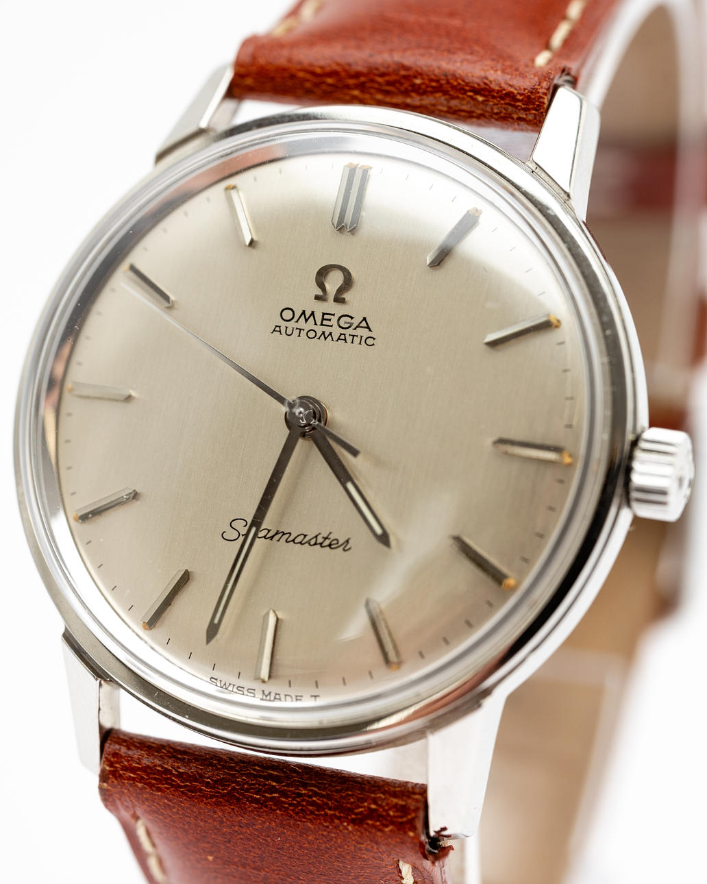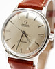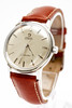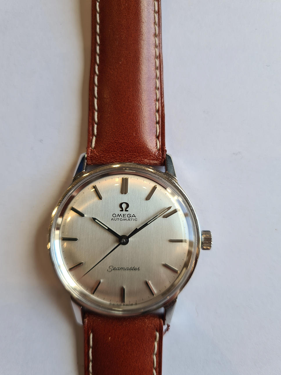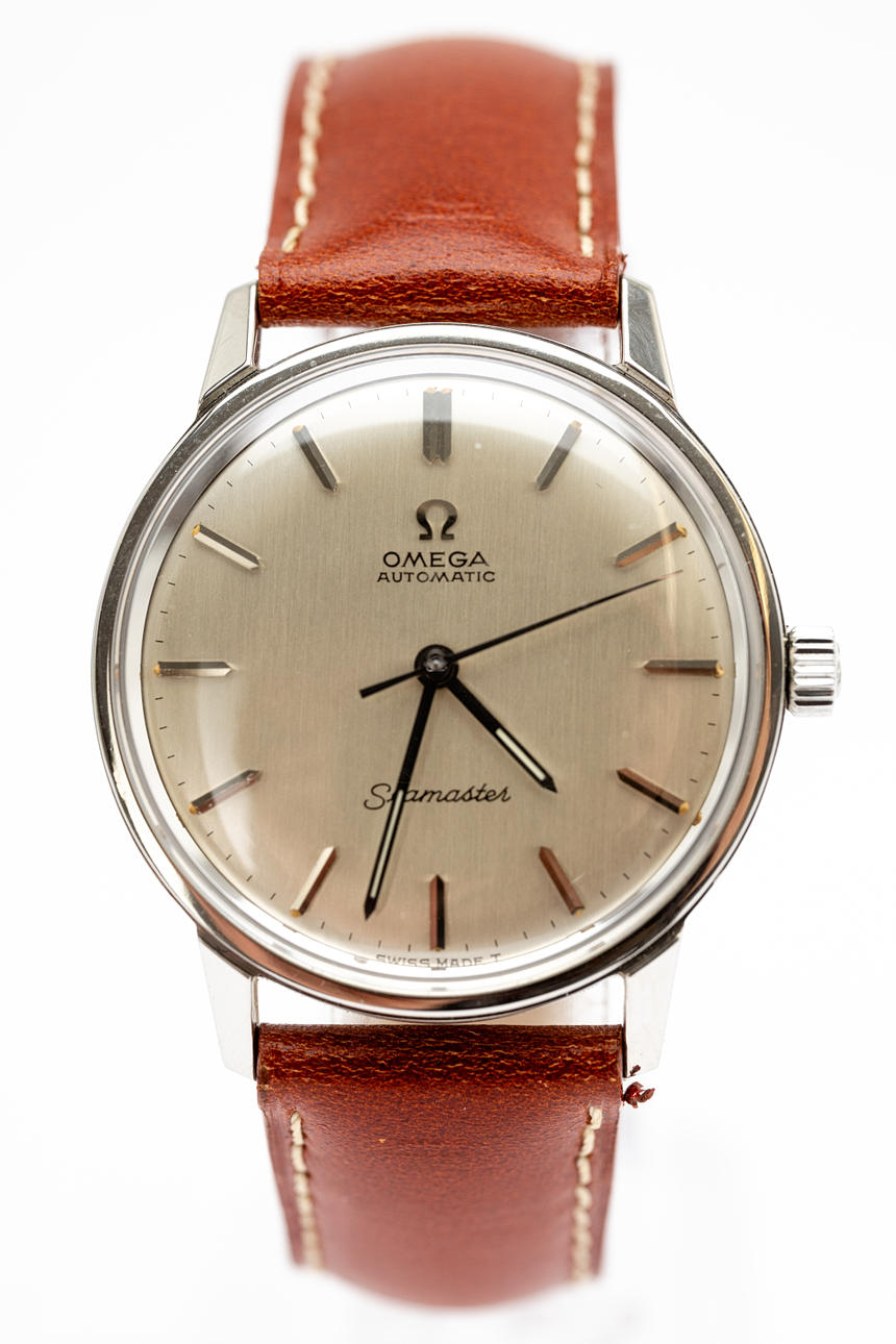 Omega “Seamaster”, ref No. 165.002. Caliber No. 552 Stainless steel case, silver dial with hour, minute and second hands, plastic glass, leather strap with pin buckle not from Omega. automatic movement. Dimensions approx. Diameter Ø 34 mm. The clock was ticking at the time of the review, Stockholm's auction shop does not guarantee functionality.