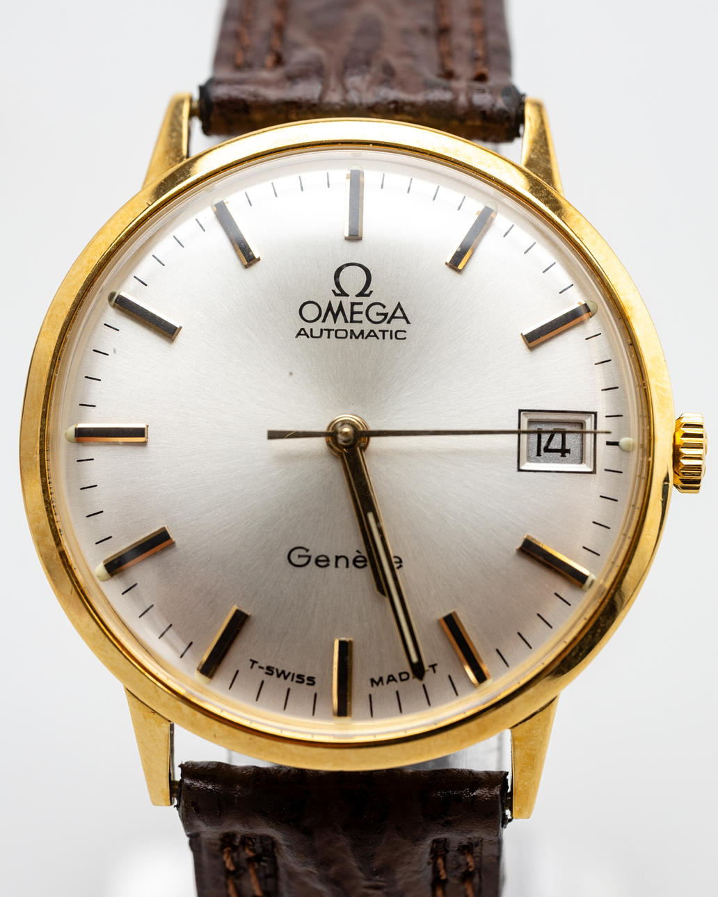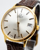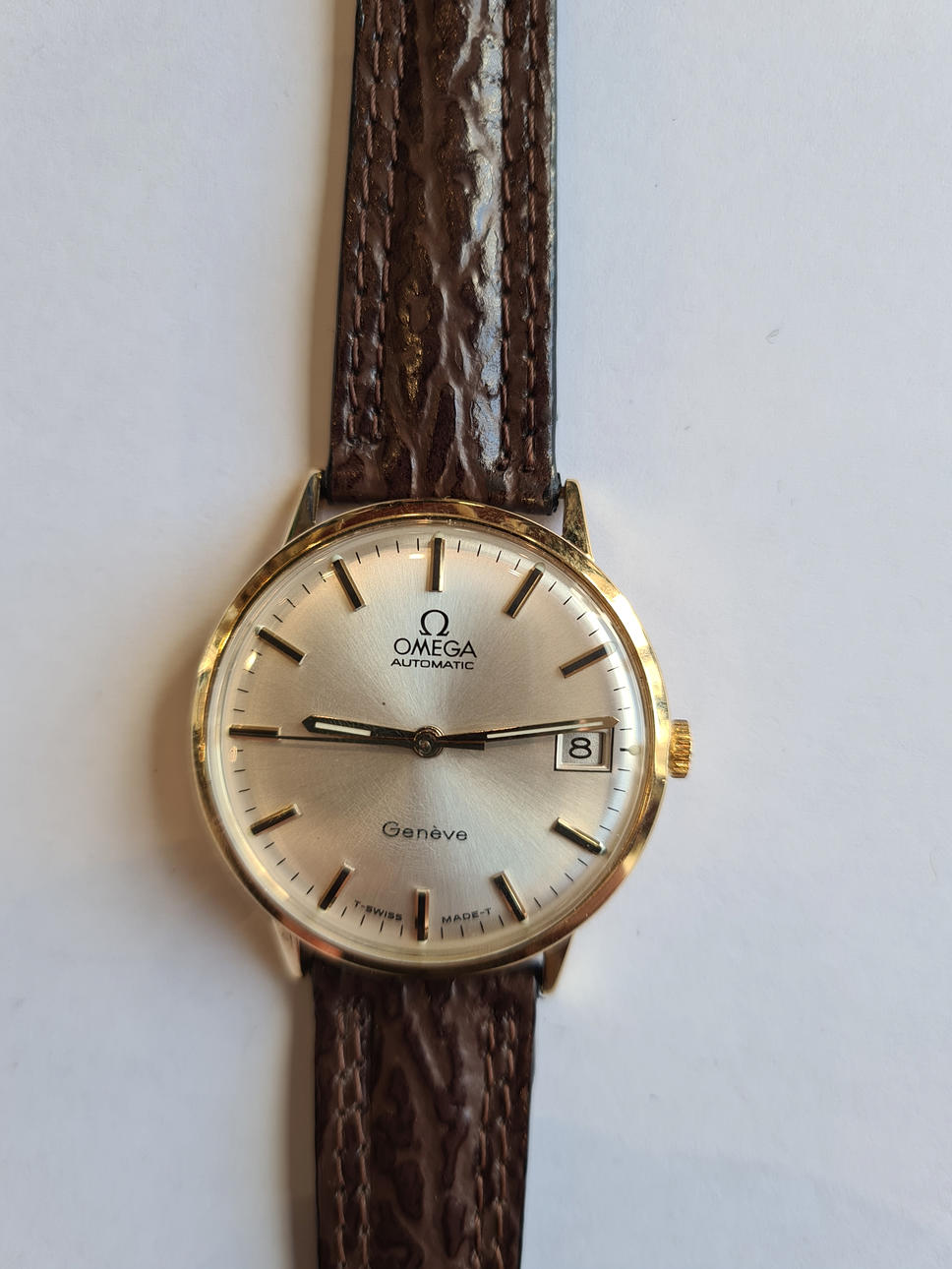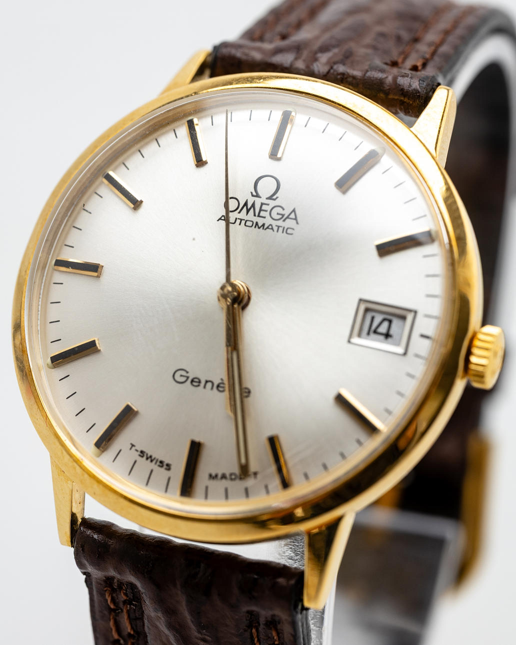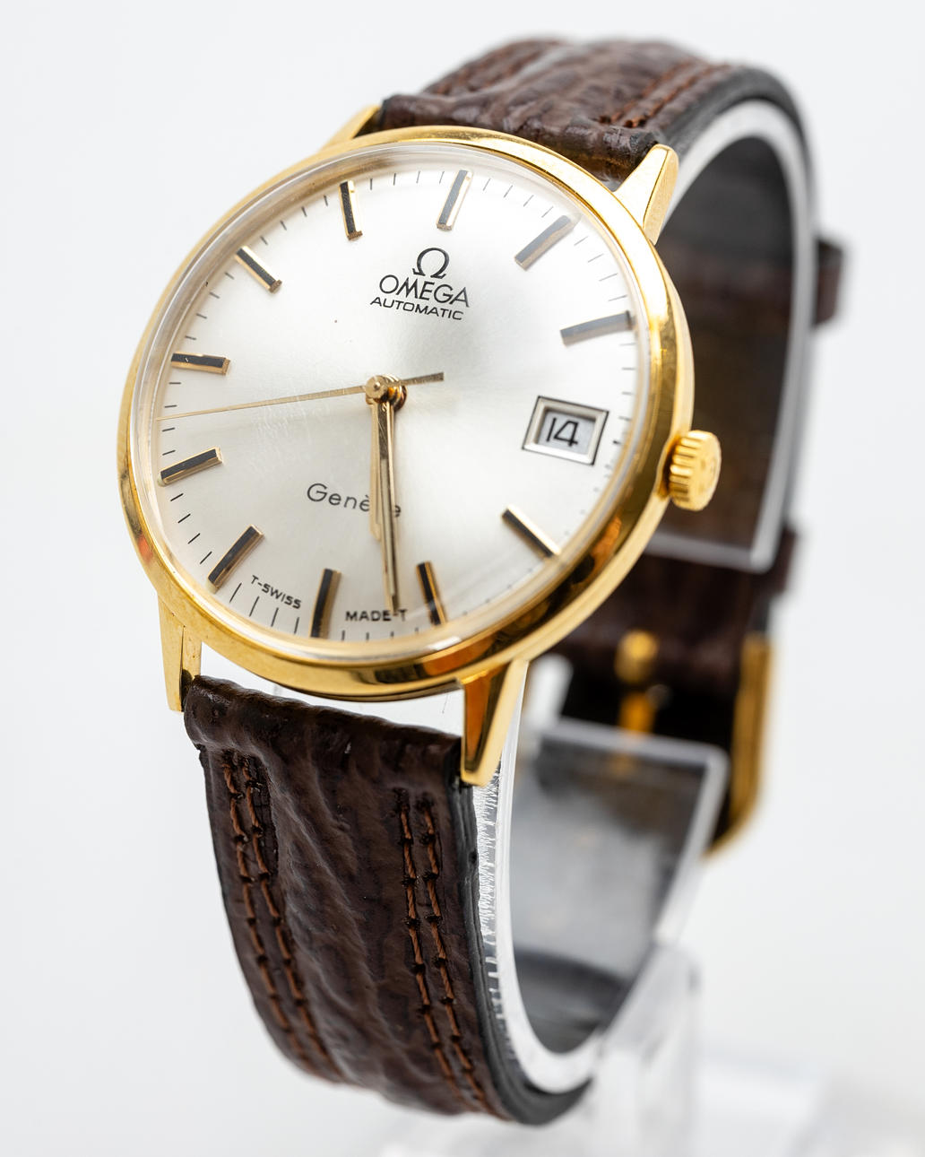 Omega men's bracelet watch, ref. 162.041, 18kt case. Gold, silver dial with minutes, hour and second hands, date at '3' clock, plastic glass, leather strap with pin buckle not from Omega, automatic movement cal. 565 Dimensions approx. Diameter Ø 33 mm. The clock was ticking at the time of the review, Stockholm's auction shop does not guarantee functionality.