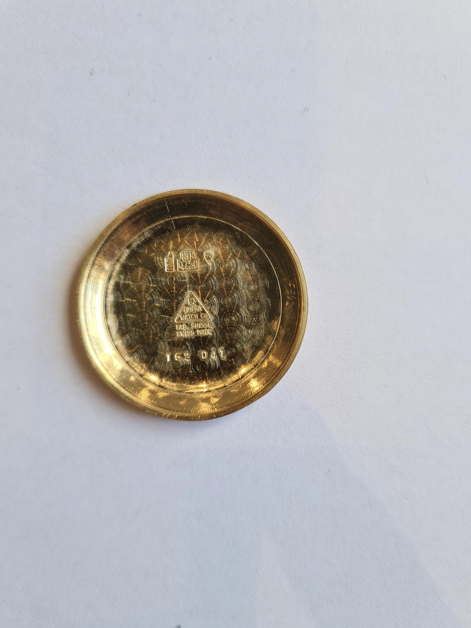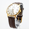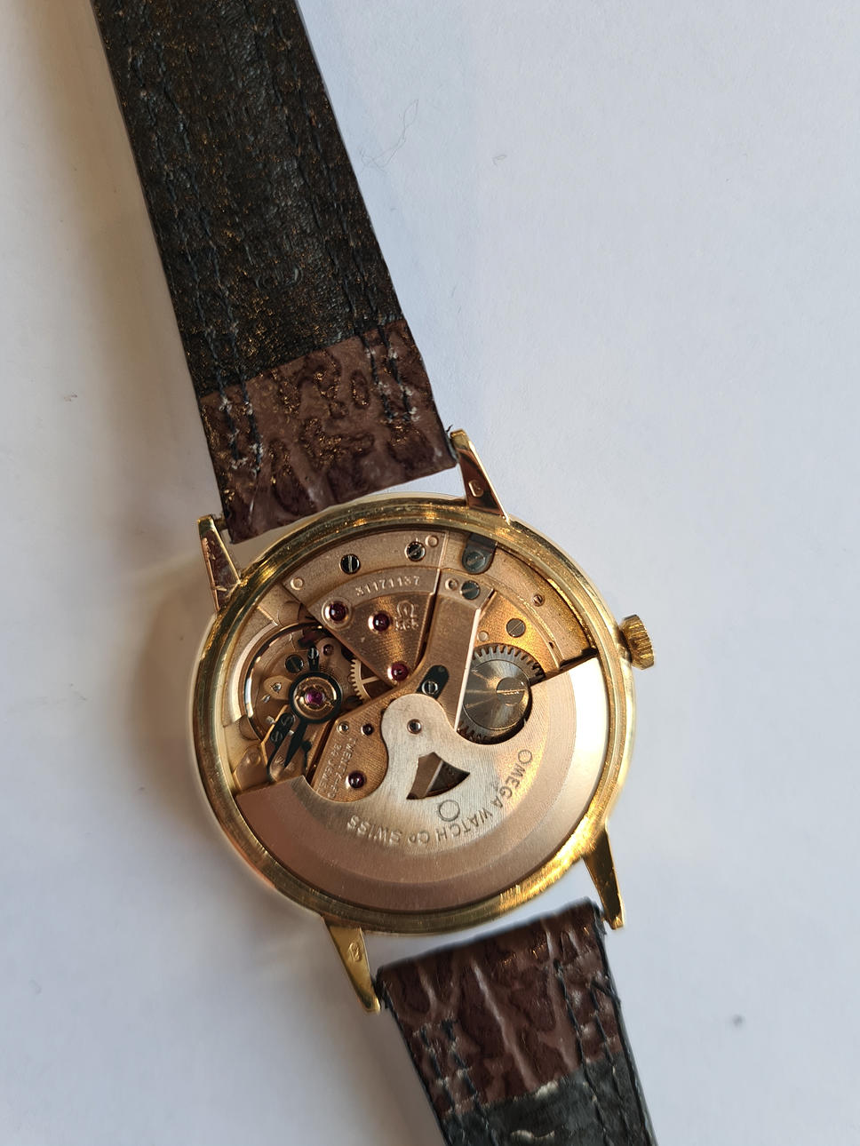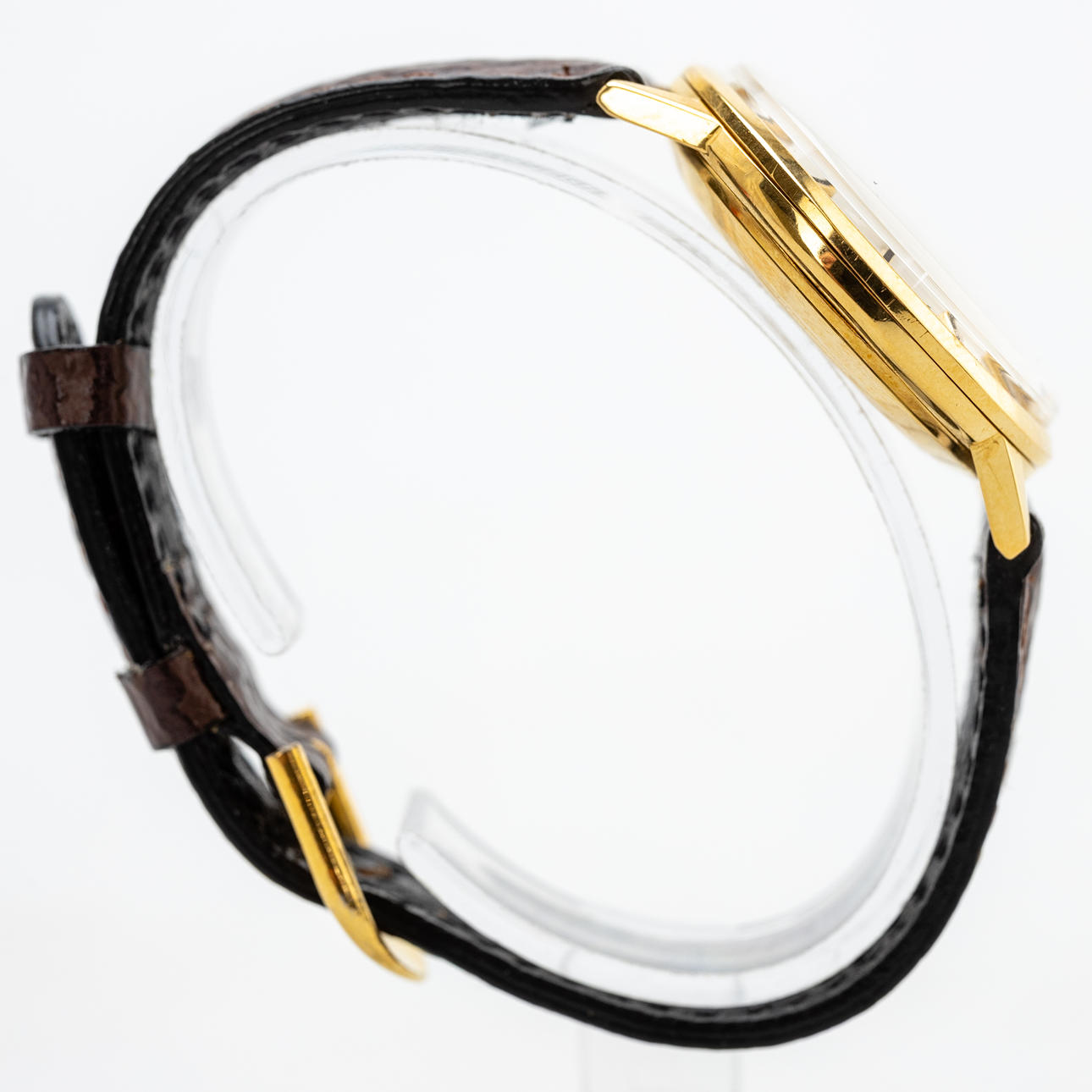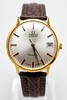 Omega men's bracelet watch, ref. 162.041, 18kt case. Gold, silver dial with minutes, hour and second hands, date at '3' clock, plastic glass, leather strap with pin buckle not from Omega, automatic movement cal. 565 Dimensions approx. Diameter Ø 33 mm. The clock was ticking at the time of the review, Stockholm's auction shop does not guarantee functionality.