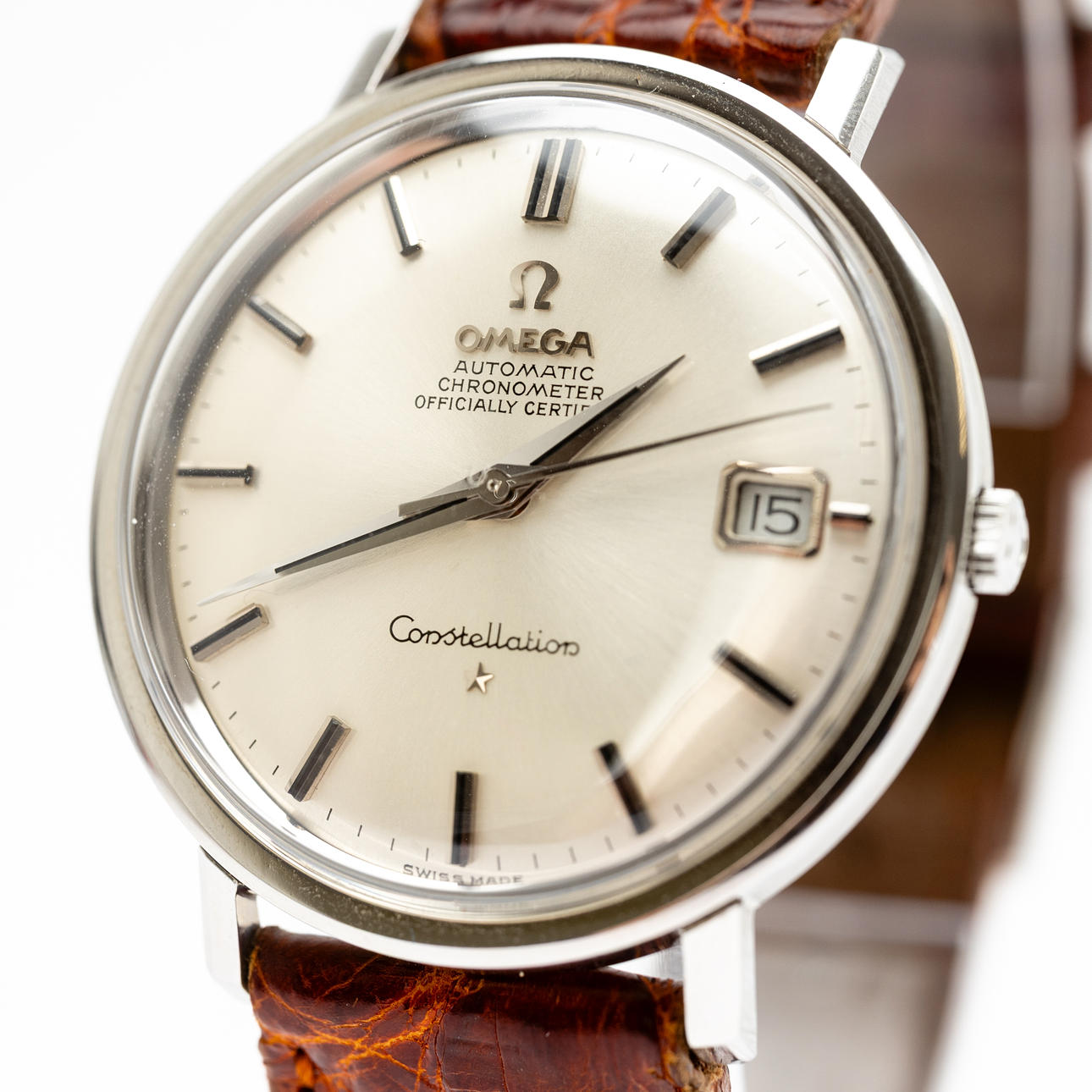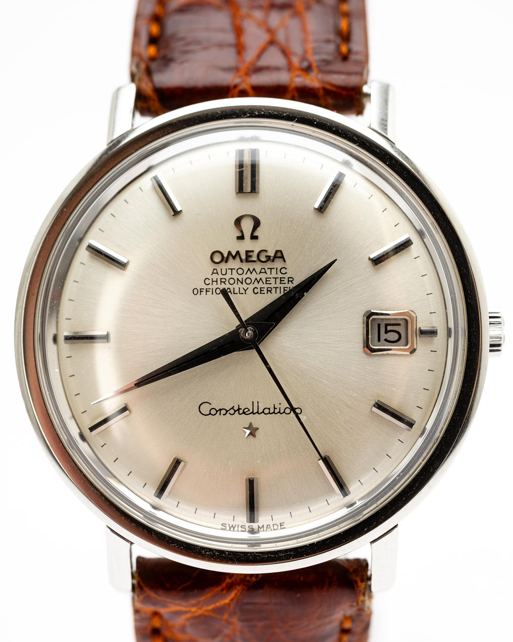 Omega “Constellation”, ref No. 168.004 Caliber No. 561. Stainless steel case, silver dial with hour, minute and second hands, date at '3' clock, plastic glass, leather strap with pin buckle. automatic movement. Dimensions approx. Diameter Ø 35.5 mm. The clock was ticking at the time of the review, Stockholm's auction shop does not guarantee functionality.