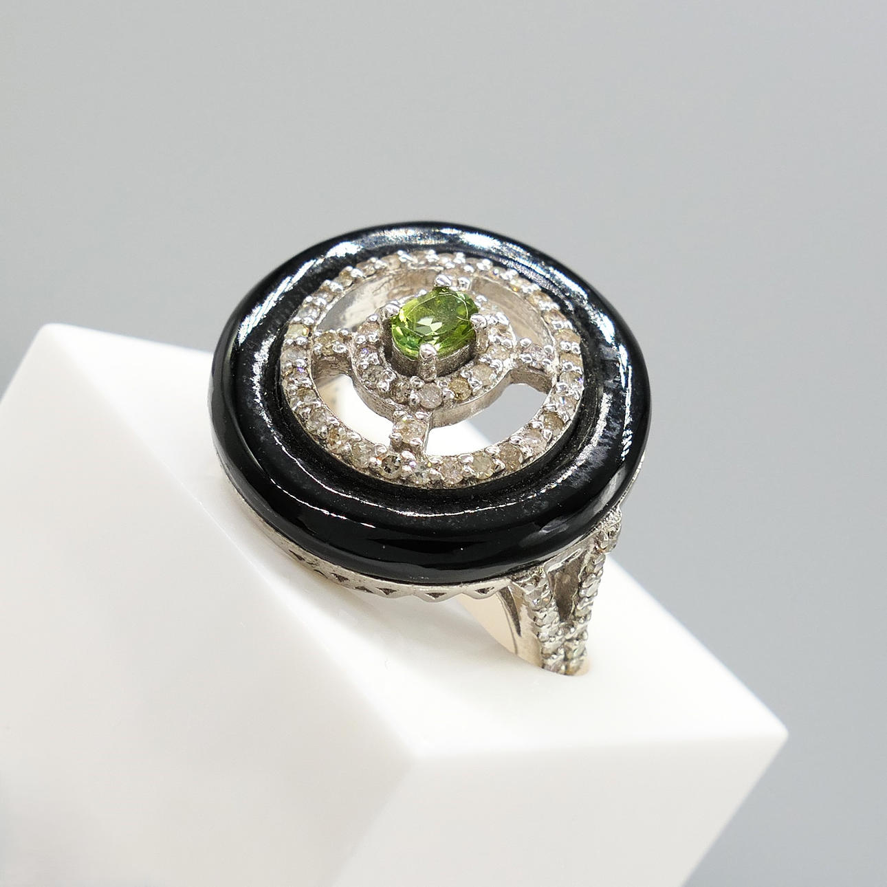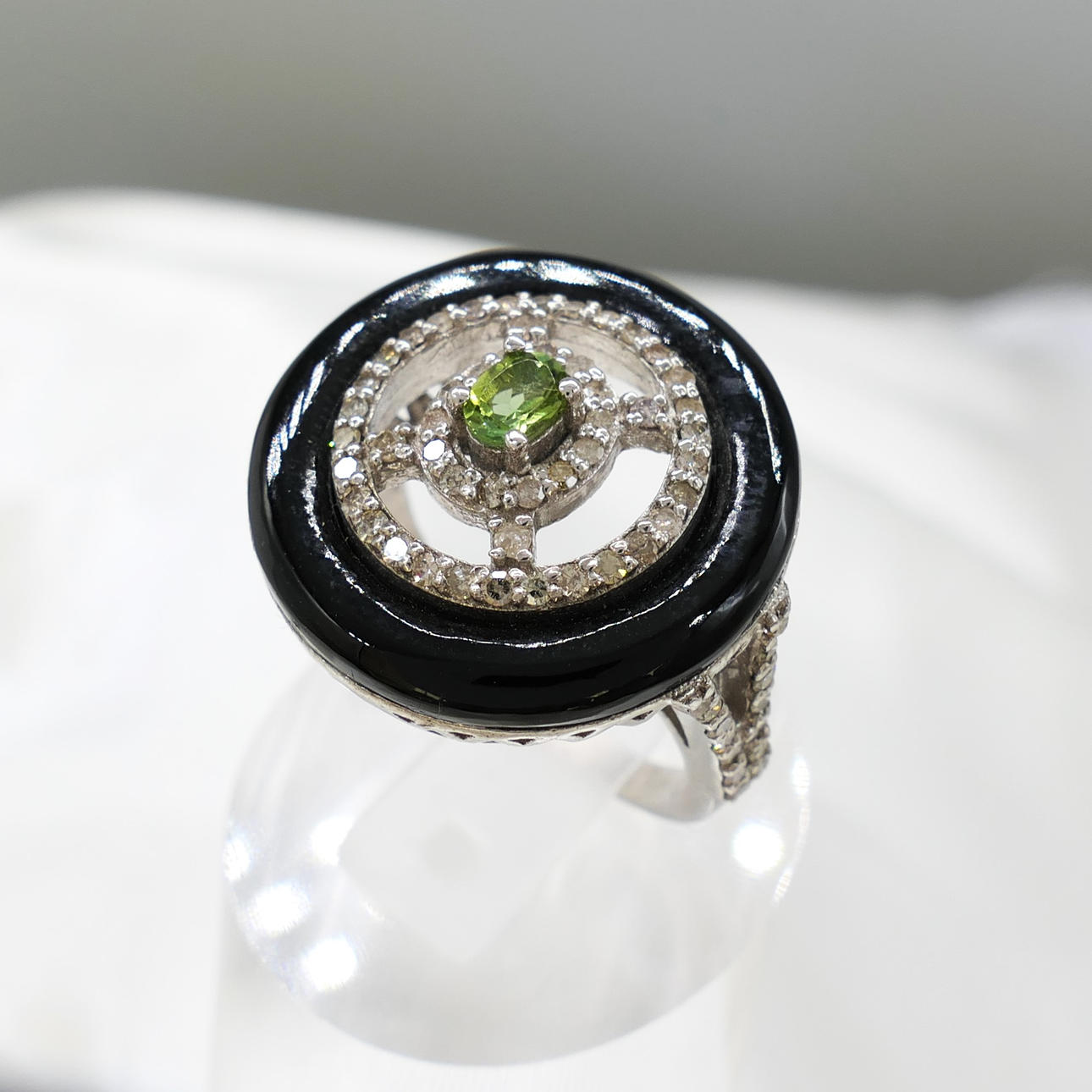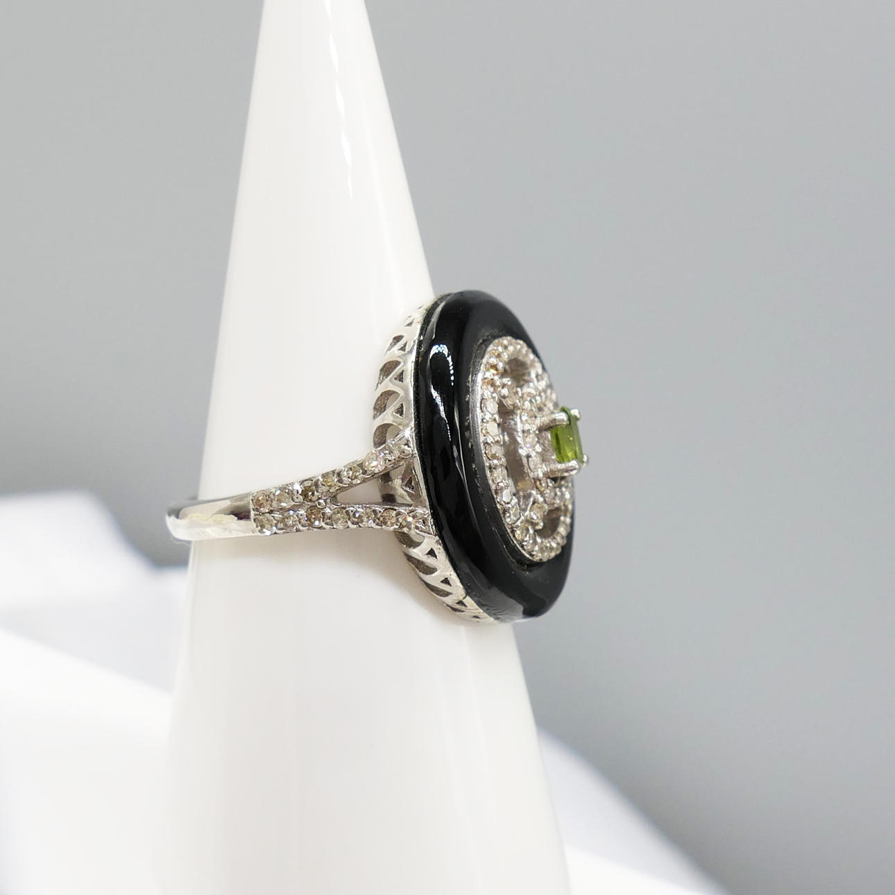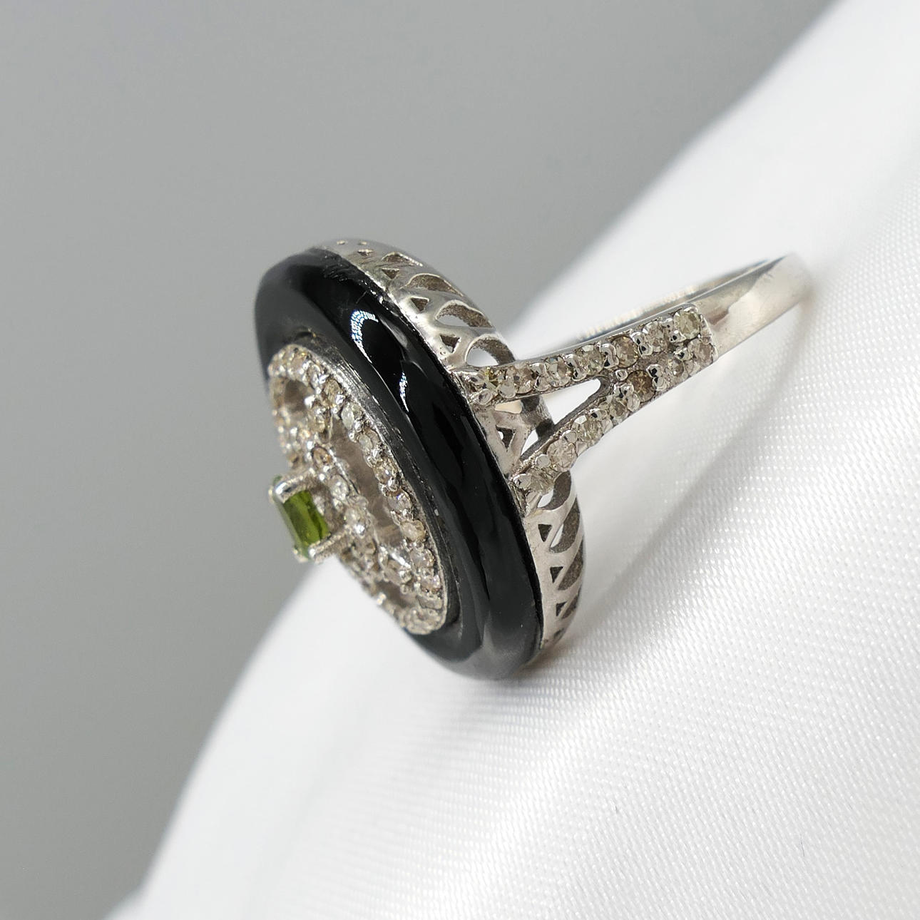 An attractive black onyx, green tourmaline and diamond dress ring in sterling silver