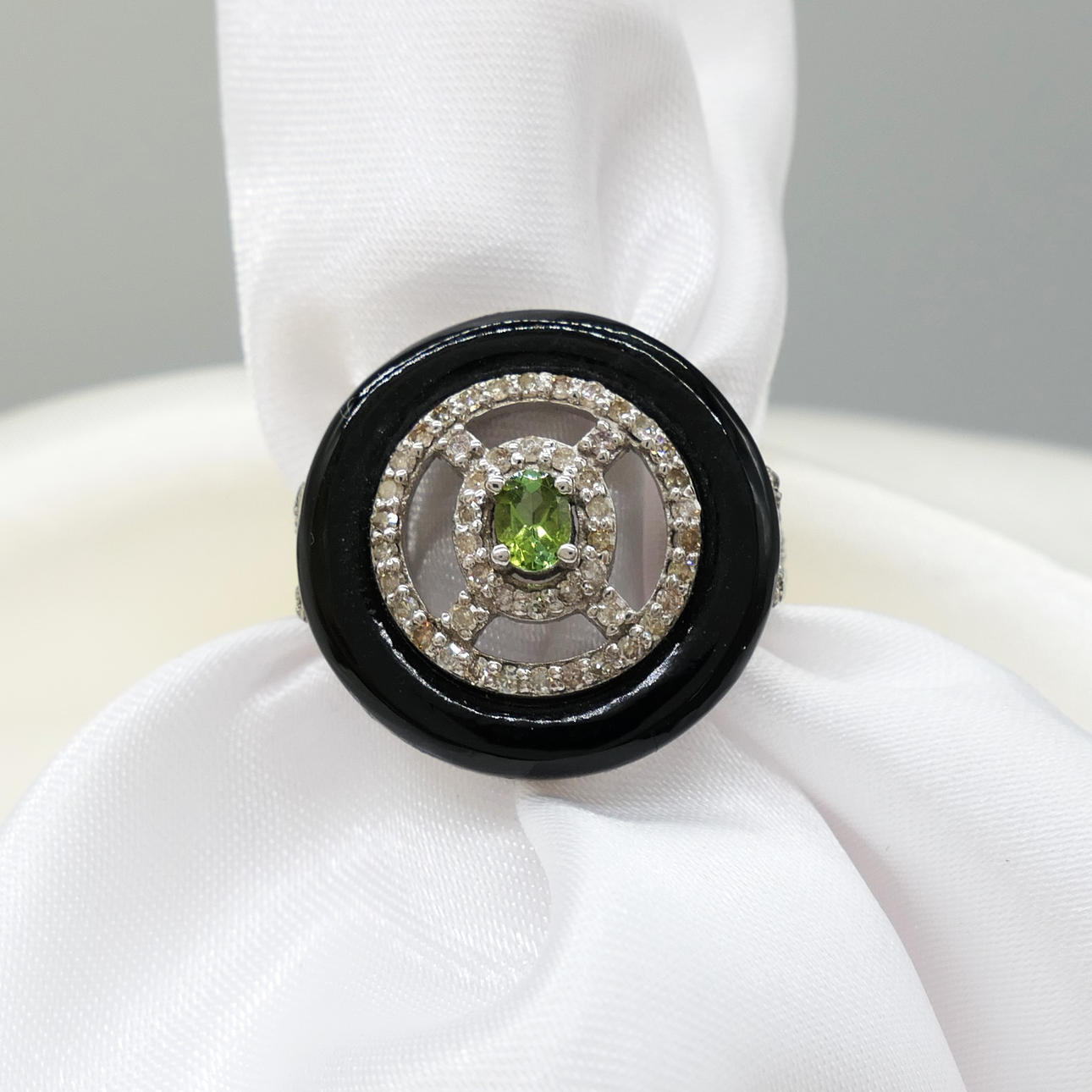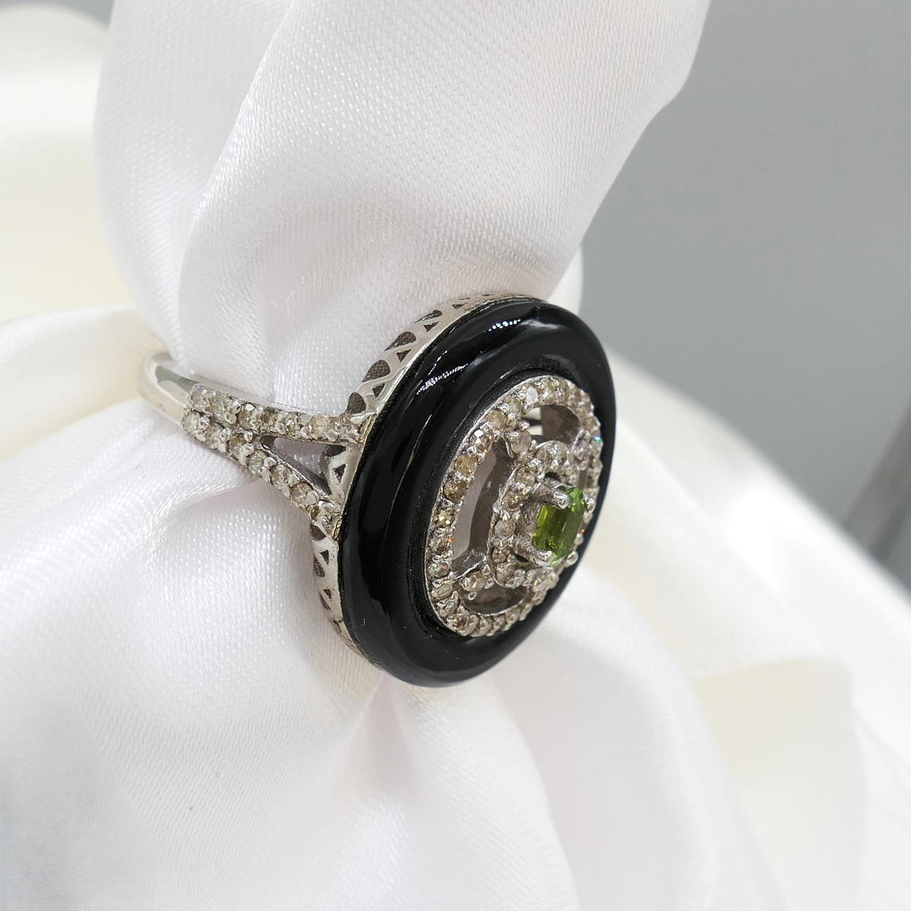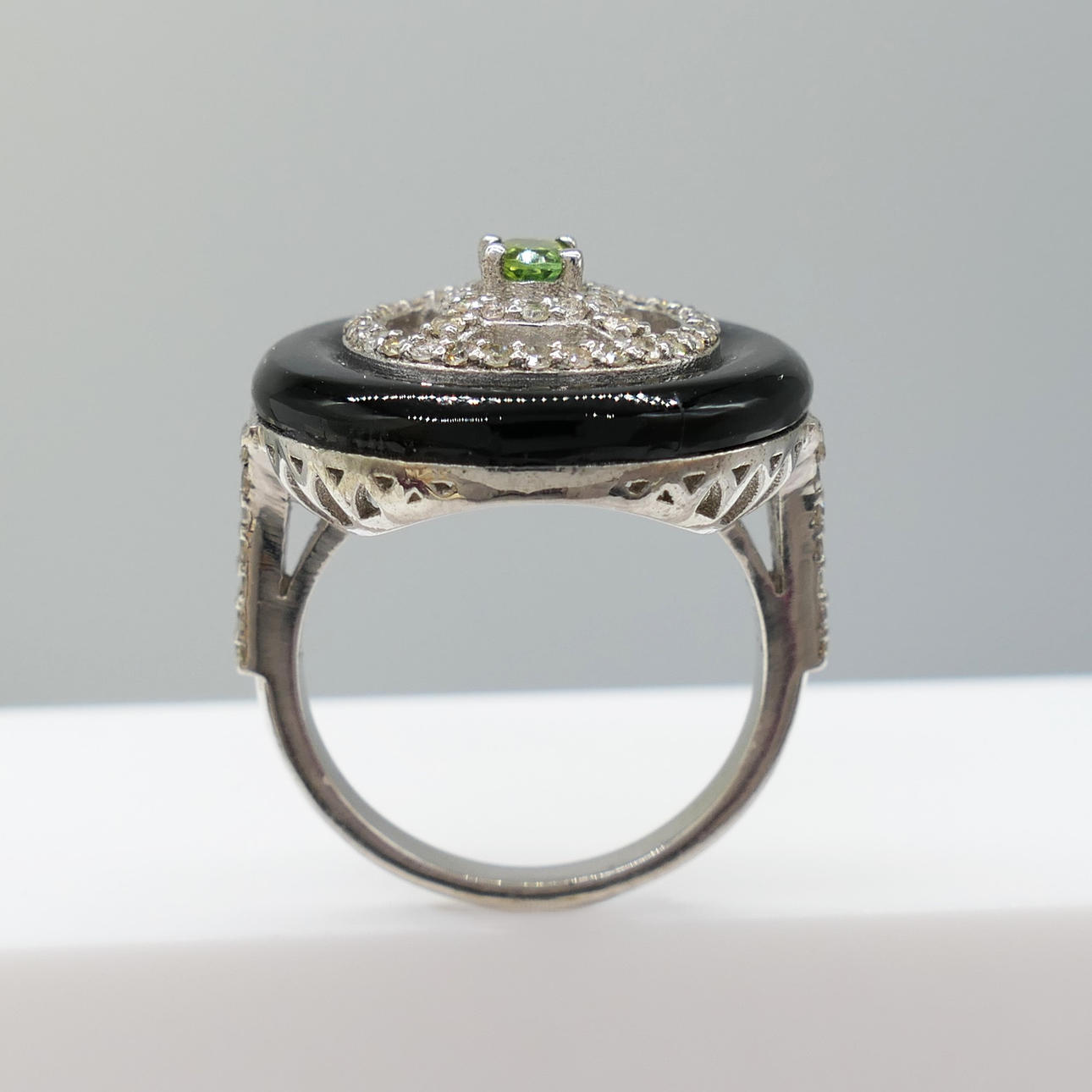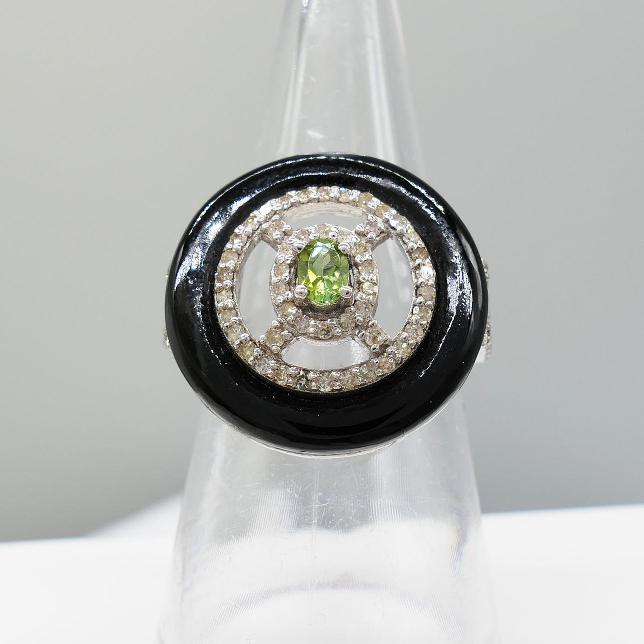 An attractive black onyx, green tourmaline and diamond dress ring in sterling silver
