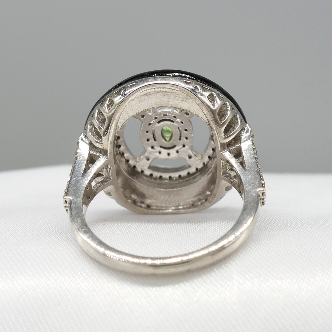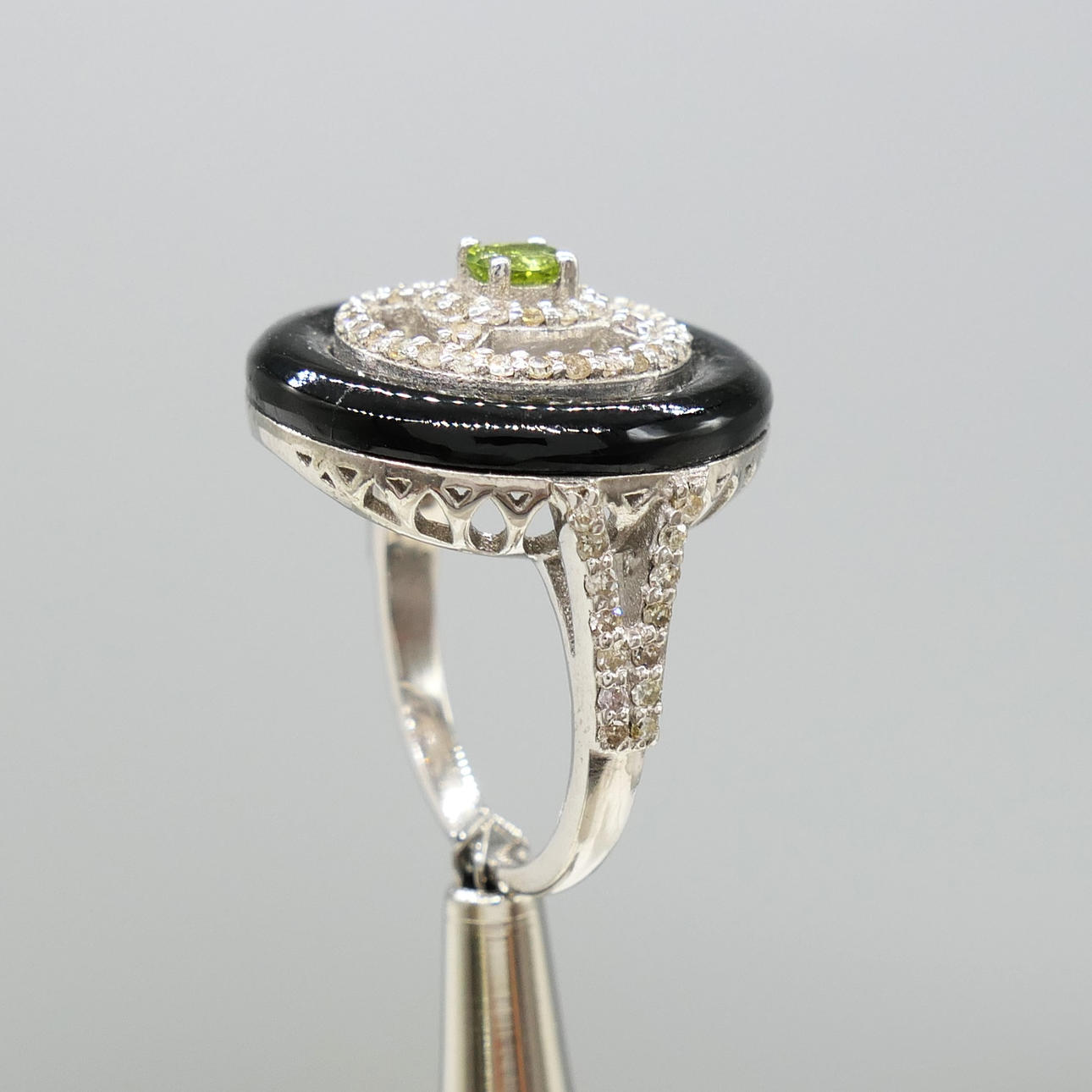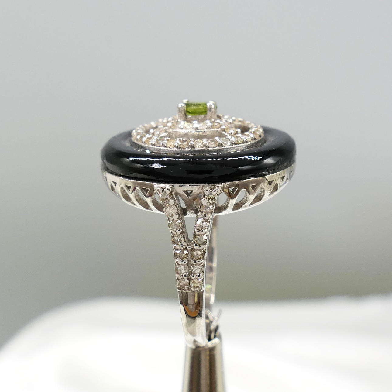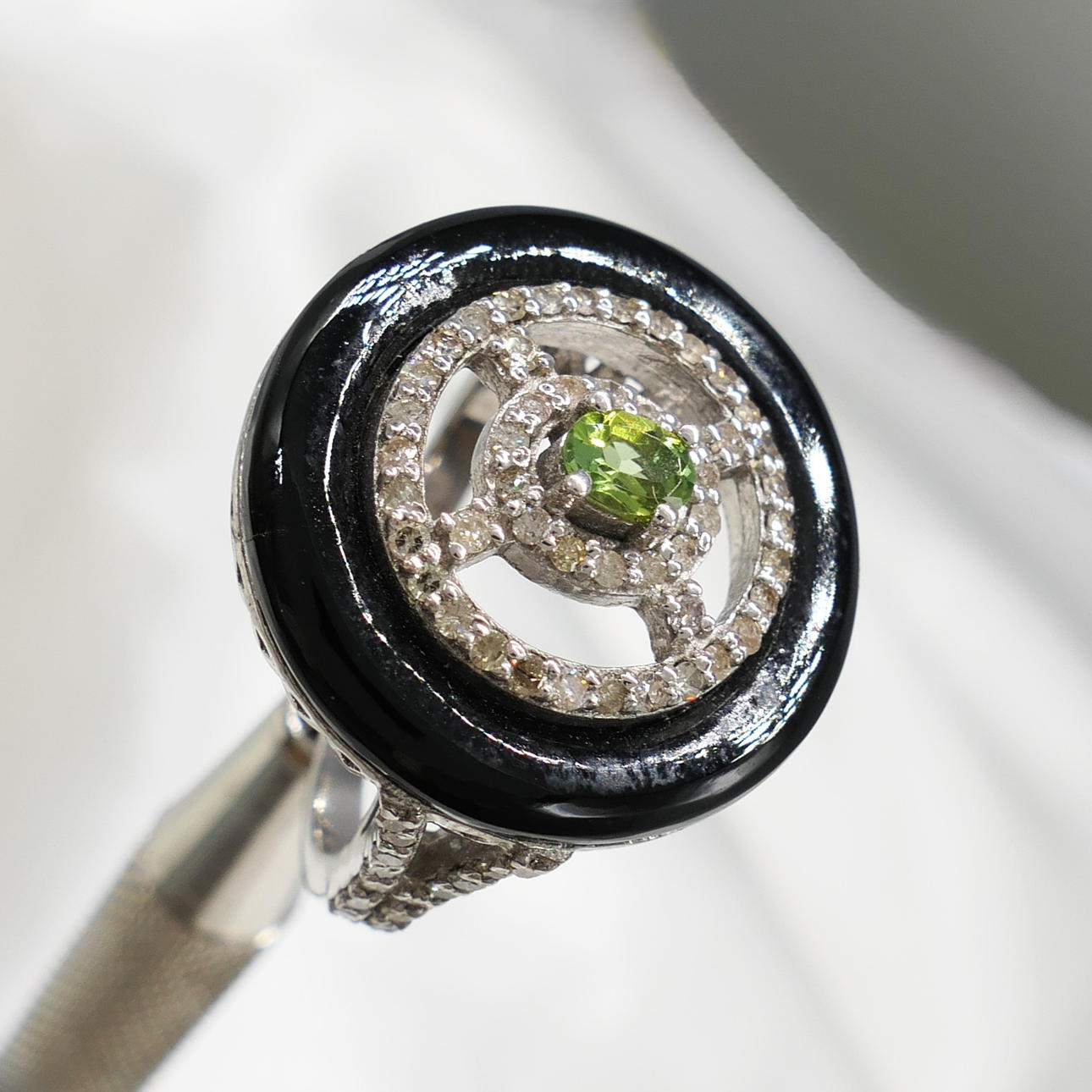 An attractive black onyx, green tourmaline and diamond dress ring in sterling silver