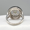 Design: target style; filigree style to sides; diamonds set to the shoulders; ring head diameter 20mm