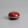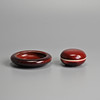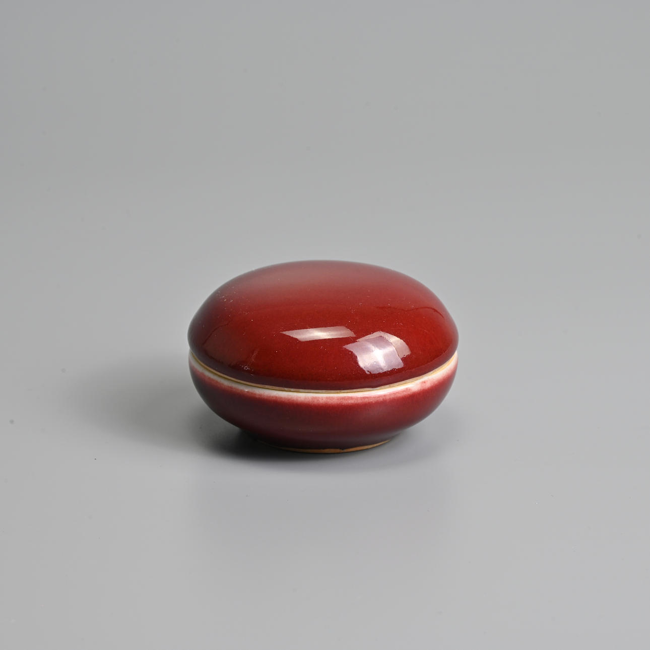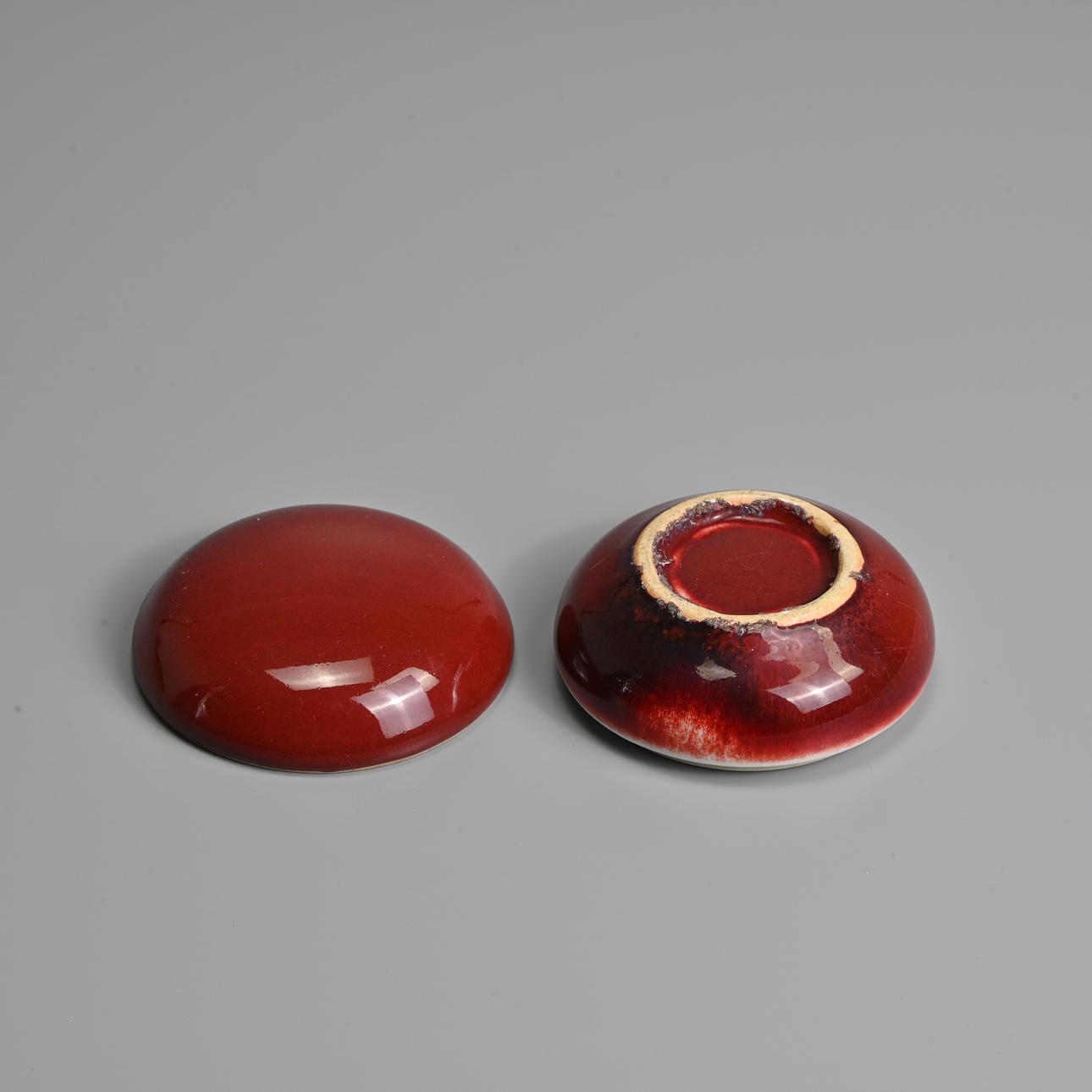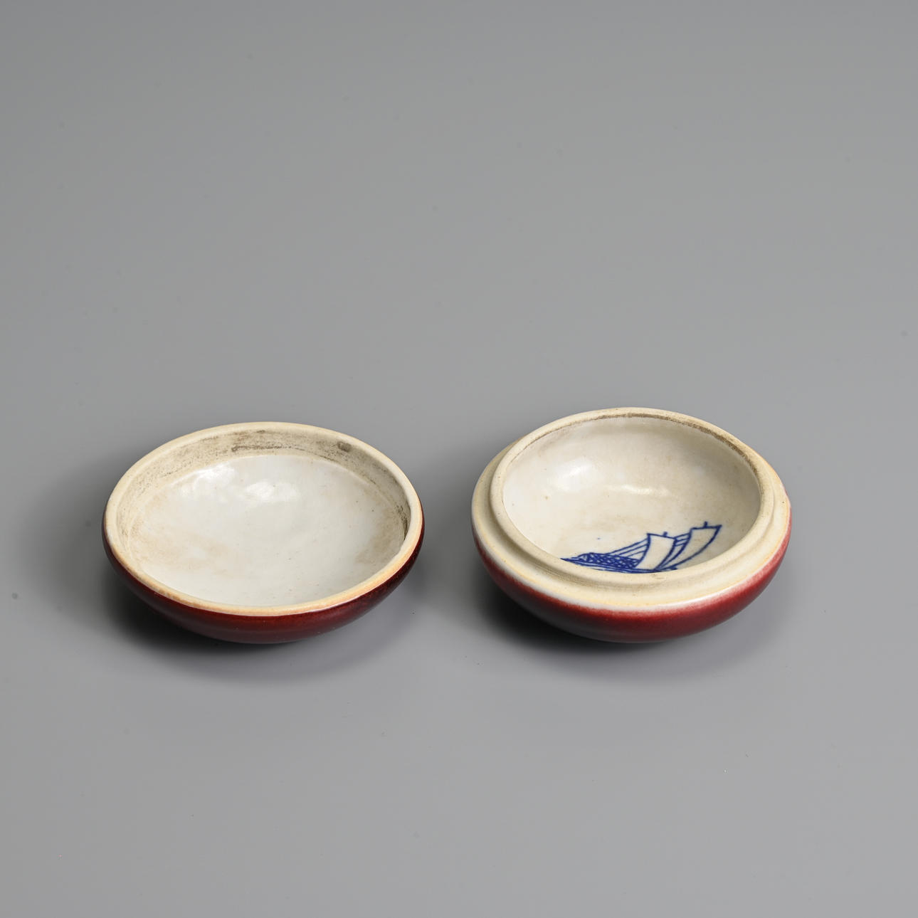 To include a brush washer of compressed form covered in a deep red glaze stopping short of the unglazed concave base; Together with a small circular red glazed box and cover, with blue and white interior featuring a boat. 7cm and 11cm diam.
