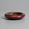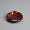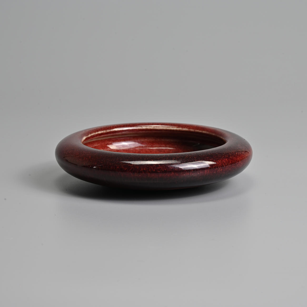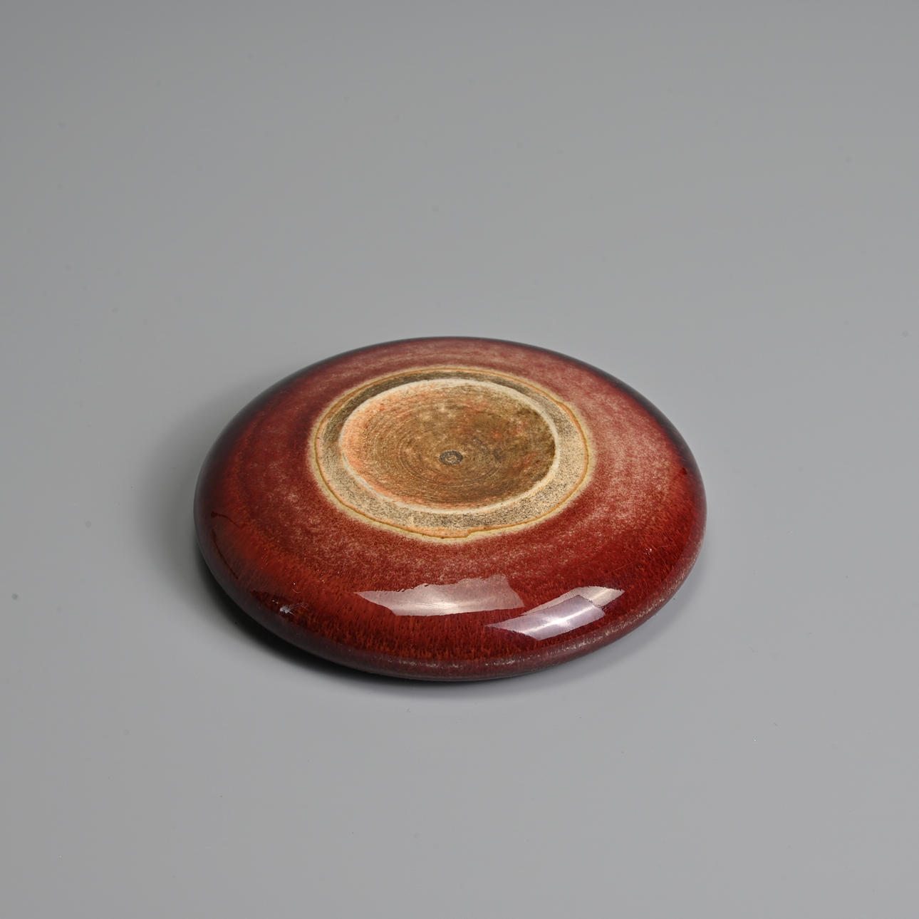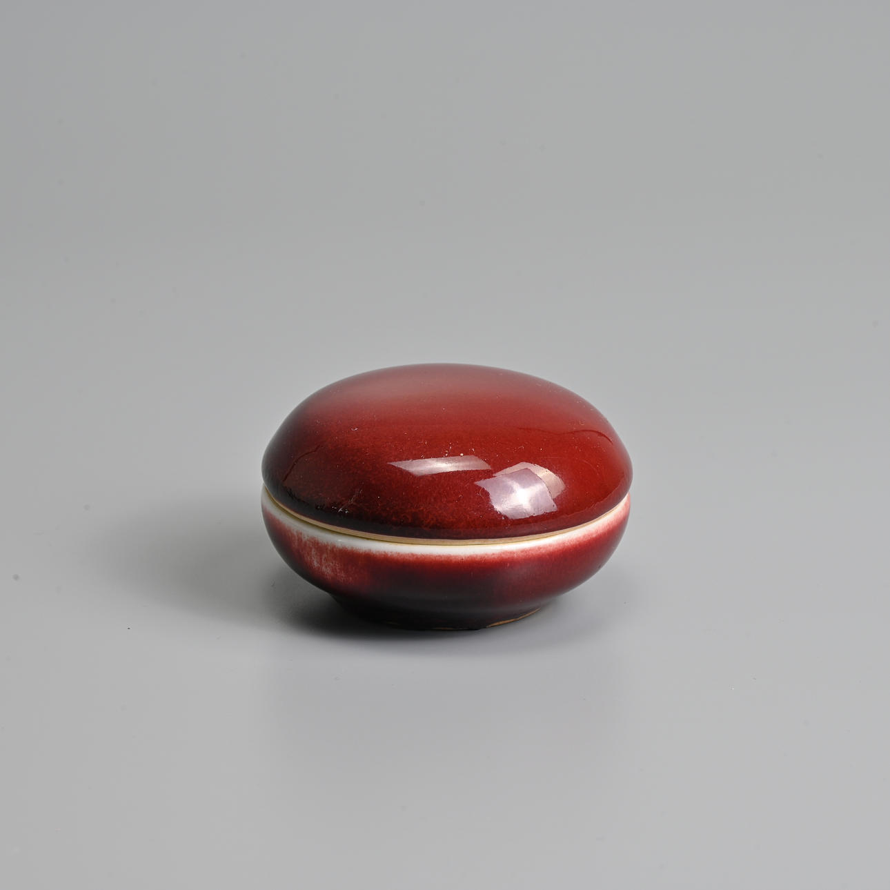 To include a brush washer of compressed form covered in a deep red glaze stopping short of the unglazed concave base; Together with a small circular red glazed box and cover, with blue and white interior featuring a boat. 7cm and 11cm diam.