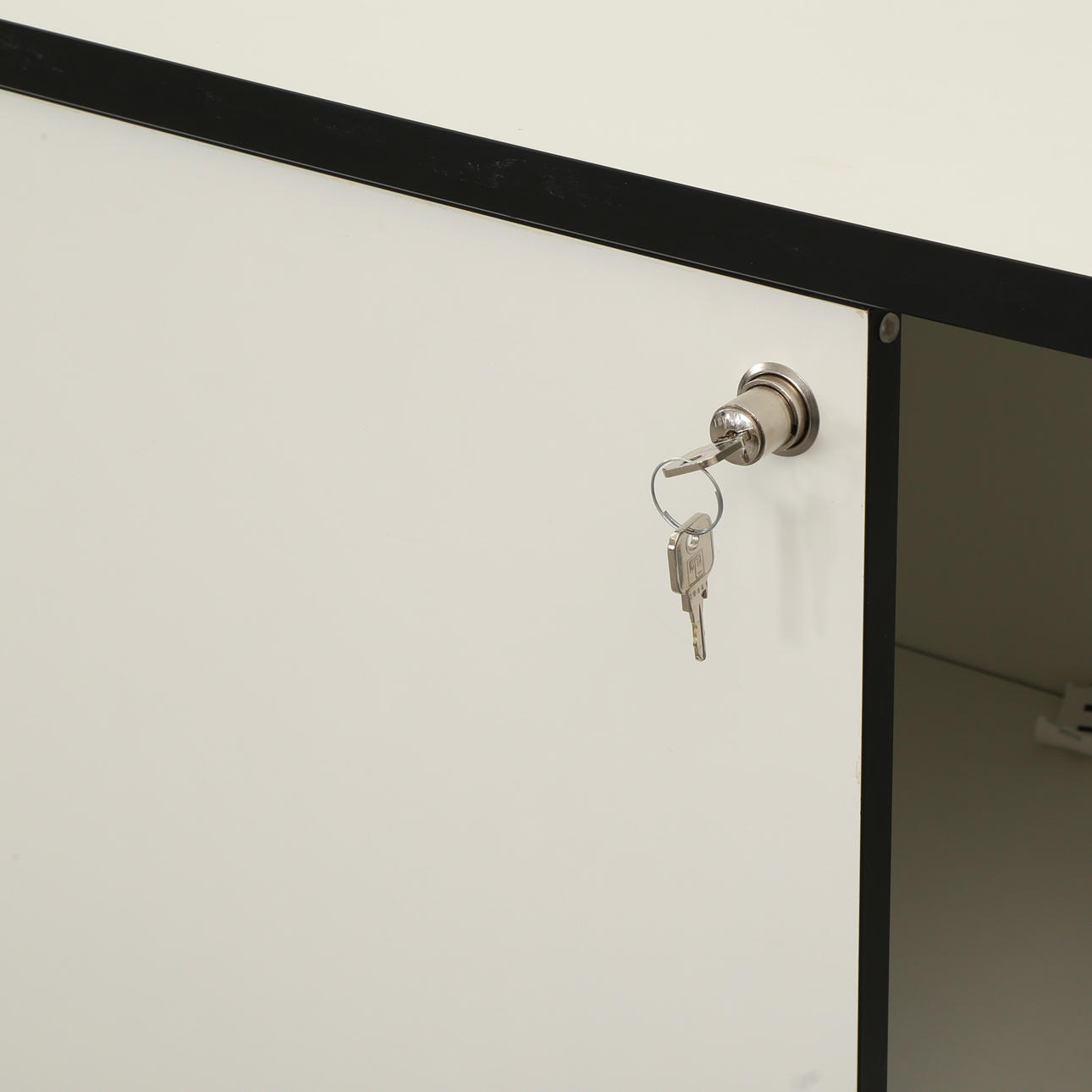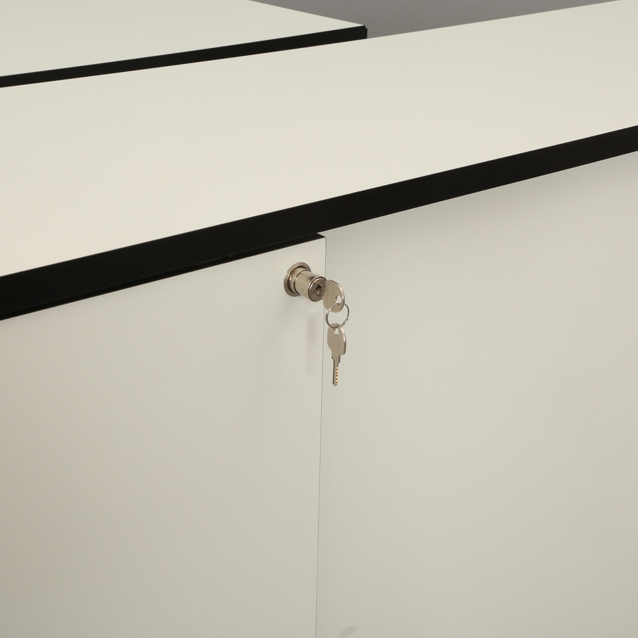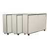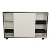 Three cabinets of white laminate with moldings of black laminate, front with two sliding doors, behind which shelves, one cabinet with racks for hanging folders. Finished on lockable wheels. Two lockers with locks, four keys included for these. The cabinets can be used freestanding as room dividers. H. 117, B. 178, D. 41 cm.