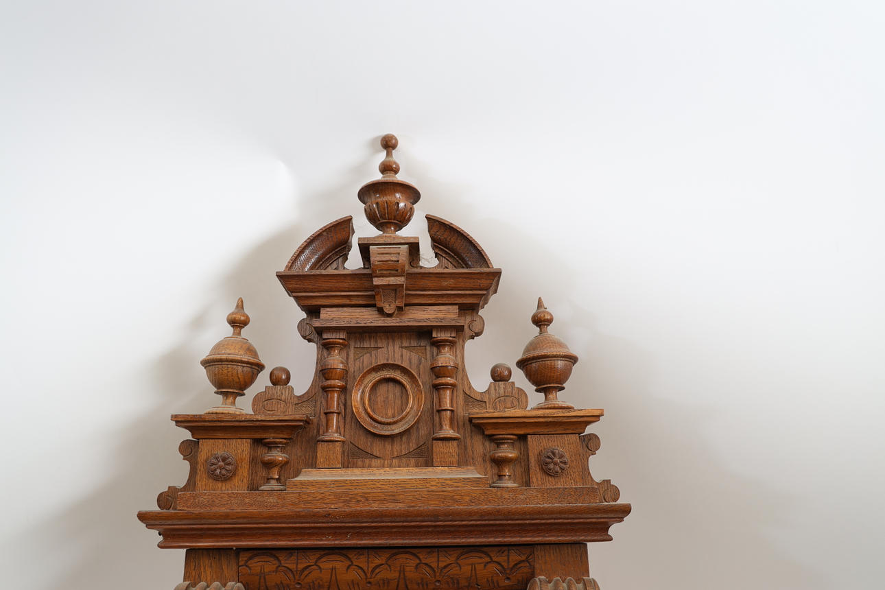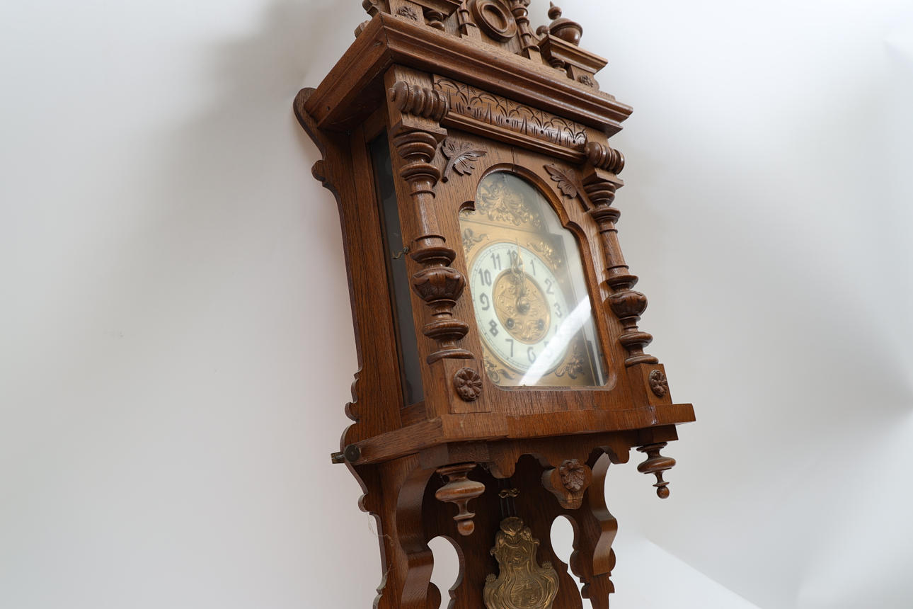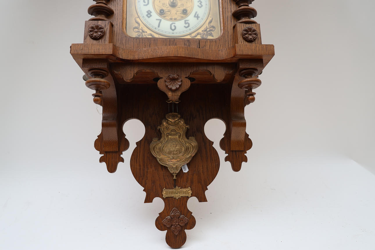 Oak, with turned decors. Partially gilded dial. Pendulum available. Height 115cm.