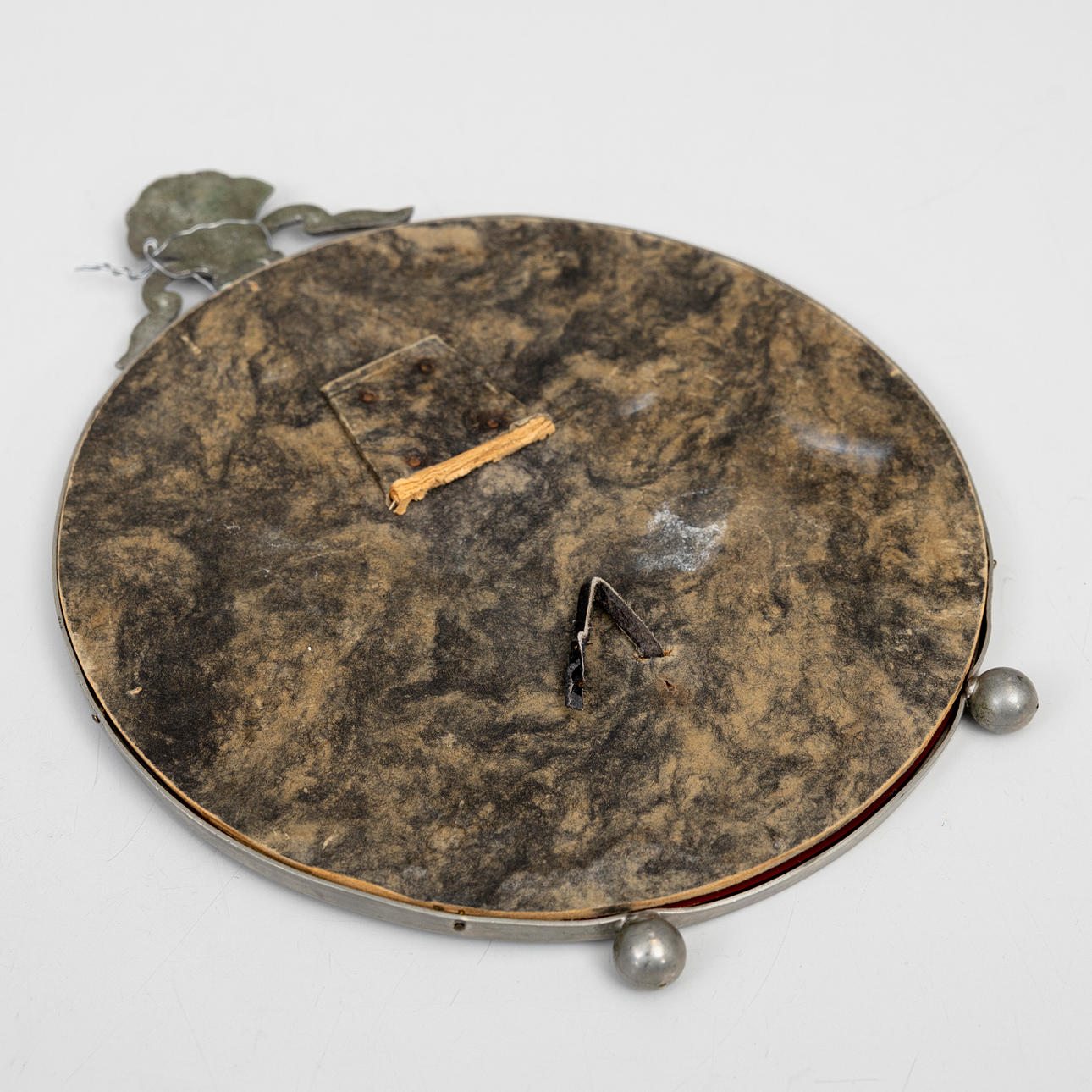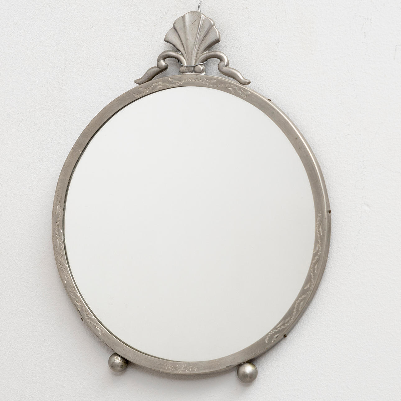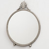Mirror in round shape with ball feet, fan-shaped crown, height approx. 16 cm.