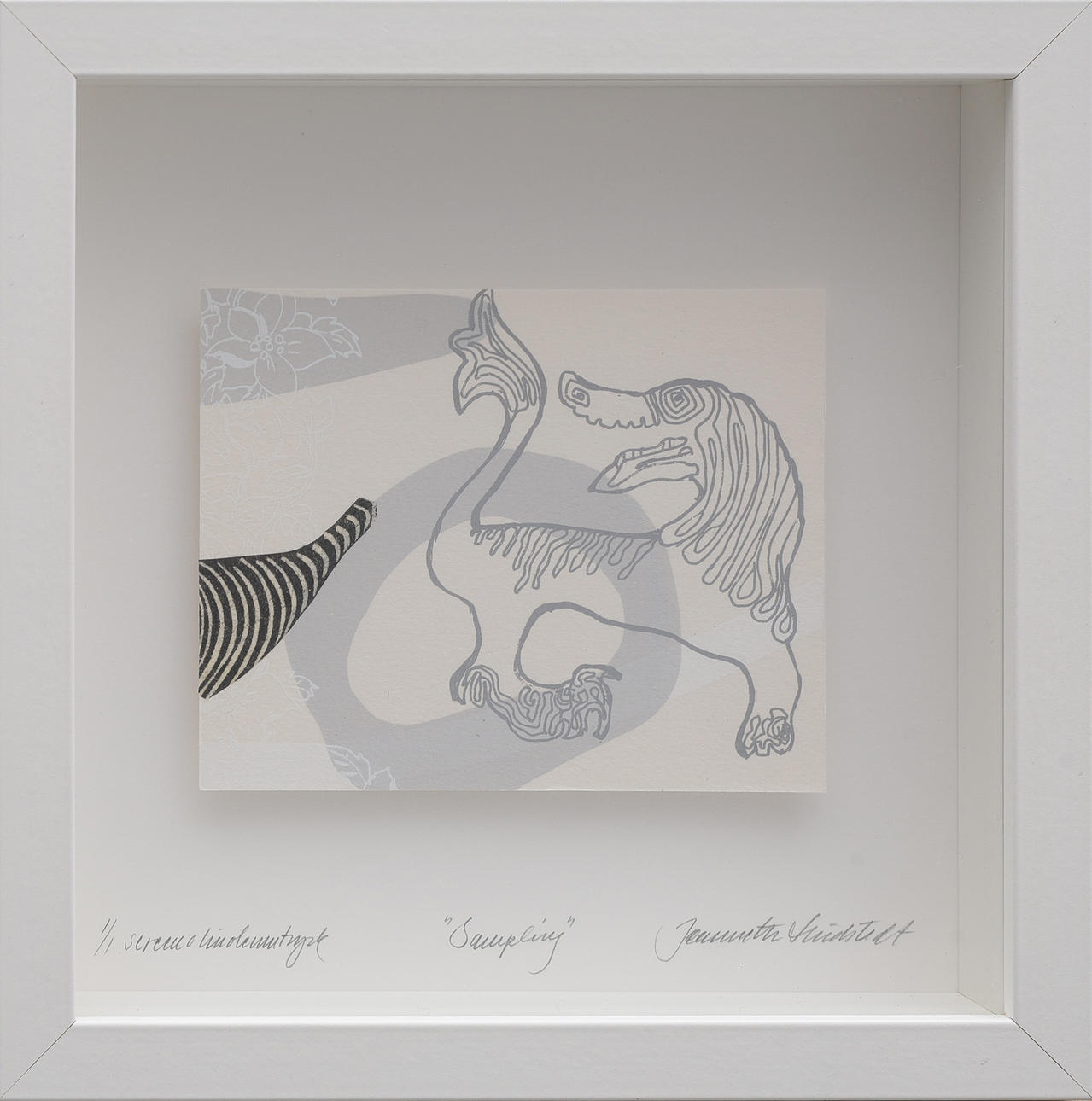 Screen and linoleum prints, signed and numbered 1/1, approx. 12x15 cm. Dimensions of the frames approx. 25.5x25.5 cm.