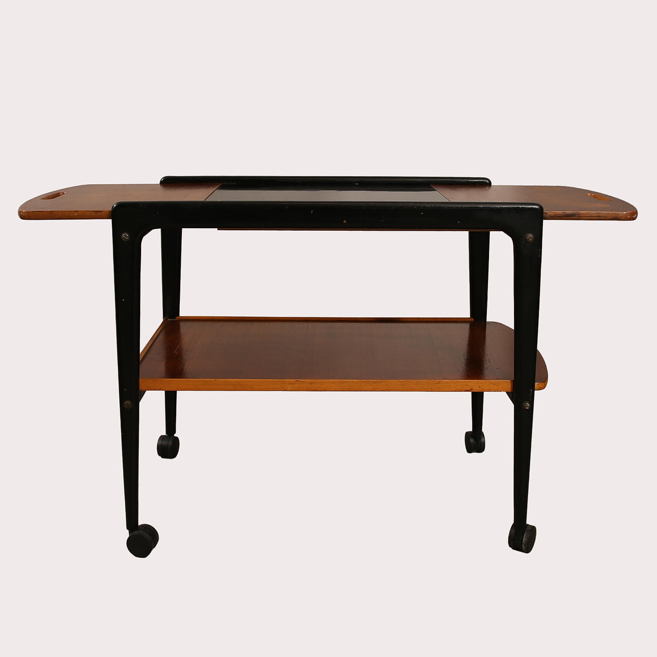 Teak and black laminate, sliding board, length 100 cm, width 42 cm, height 56 cm.