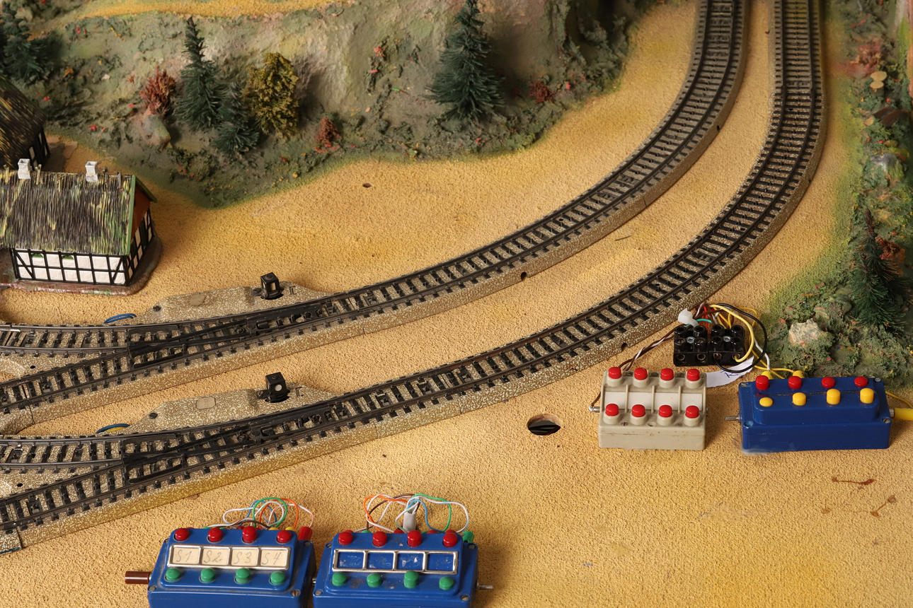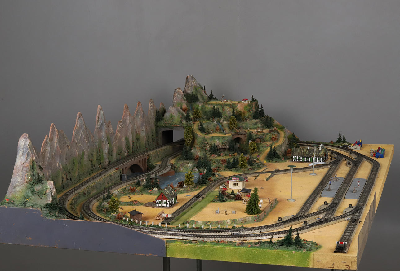 4965526. MODEL RAILWAY/TRAIN TRACK with housing mounted on board.