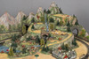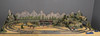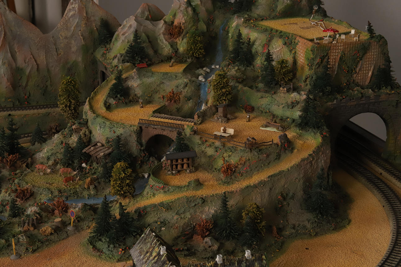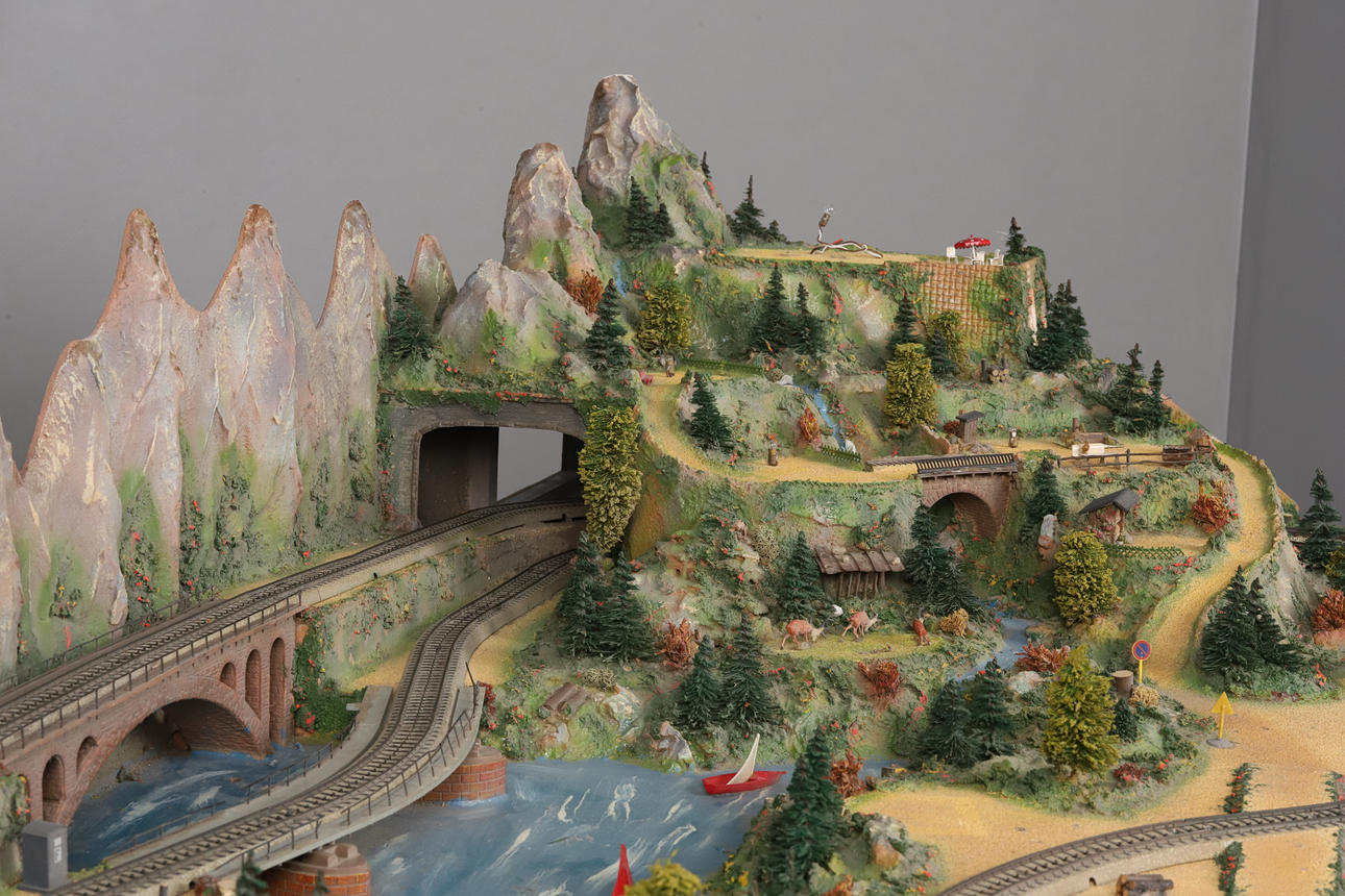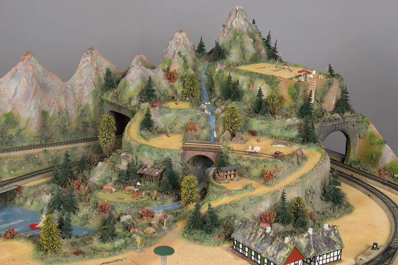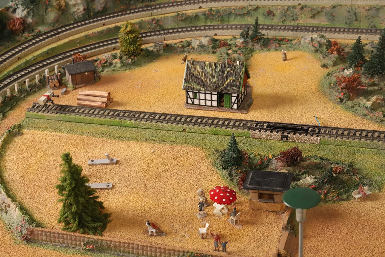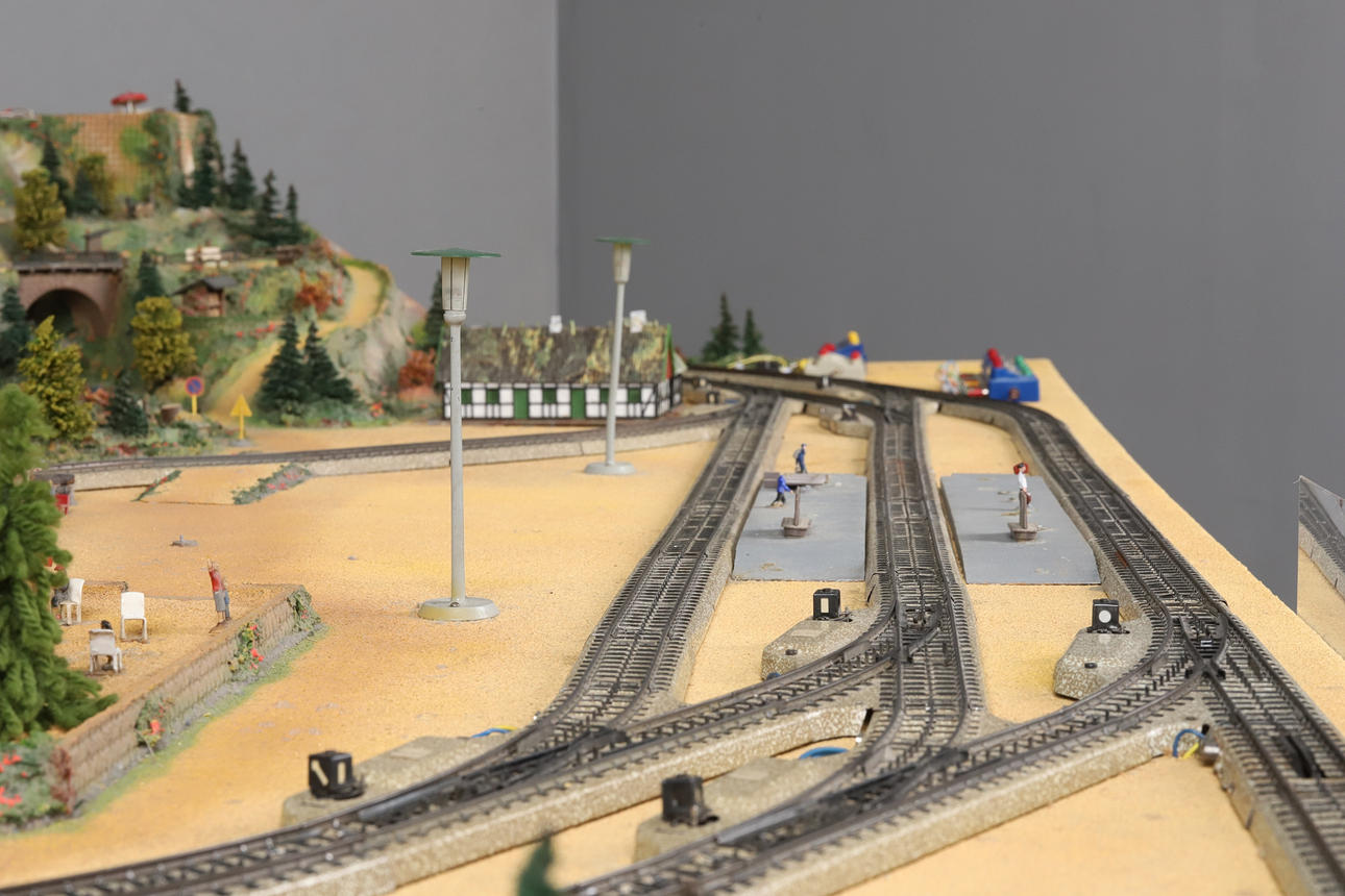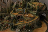 A detailed railway layout with various model buildings, trees.