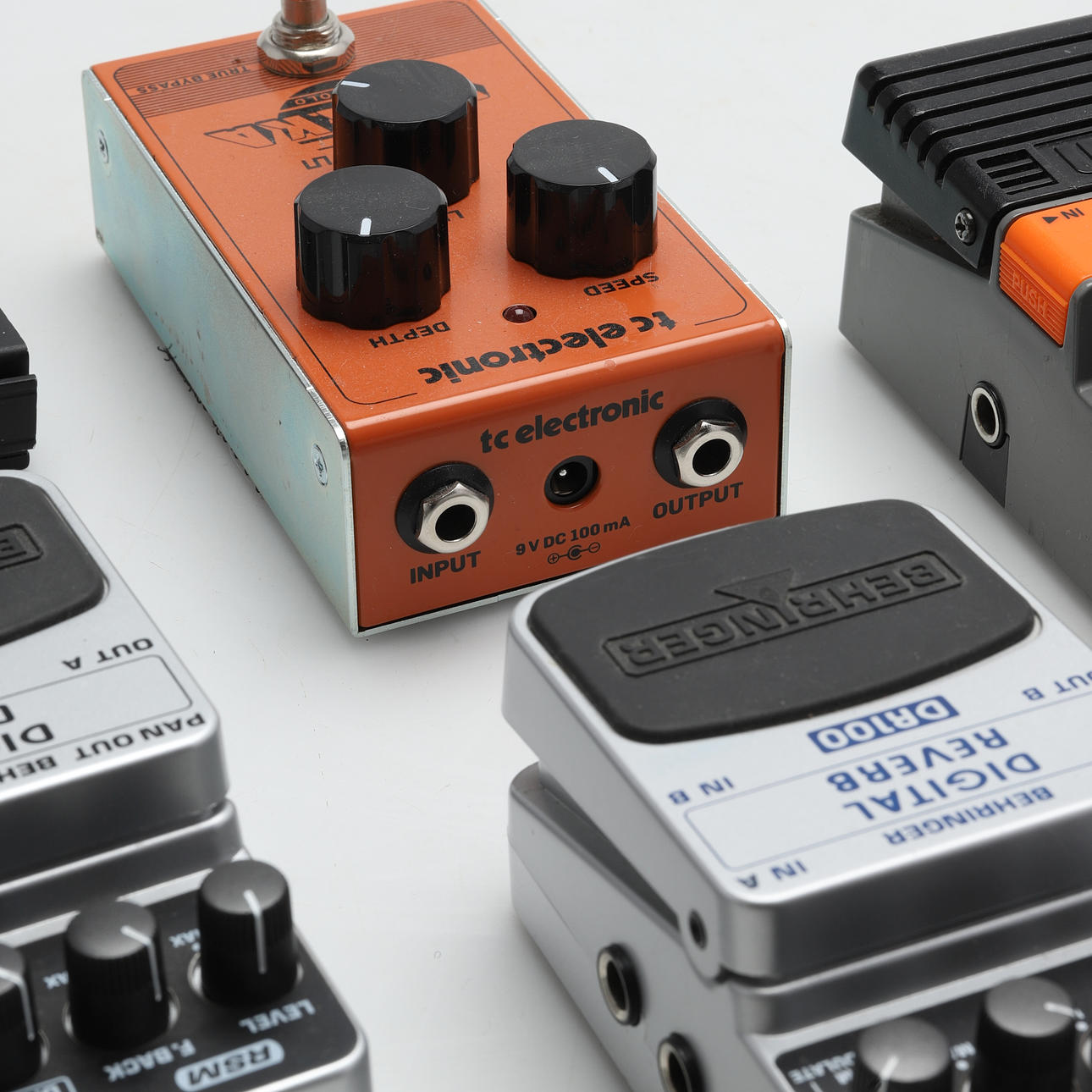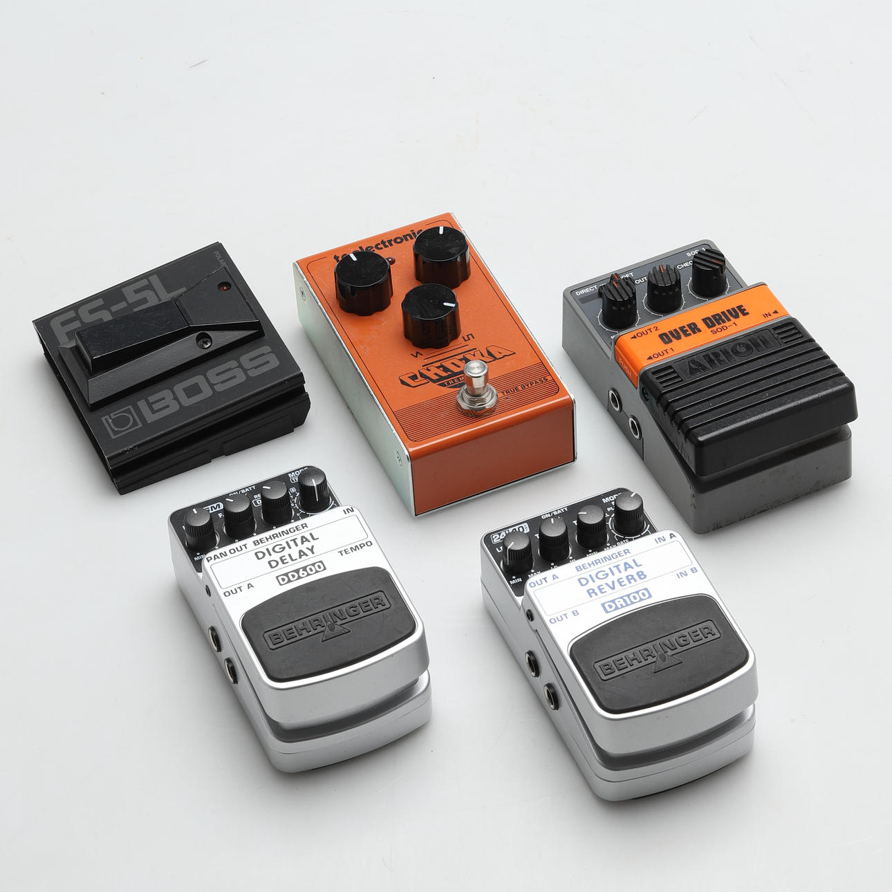 Arion SOD-1 Overdrive, TC Electronics Choka Tremolo, Behringer Digital Delay DD600, Behringer Digital Reverb DR100, and Boss FS-5L. 2 pcs in original cartons, Carton approx. 17 x 9 cm/pcs.