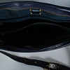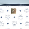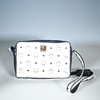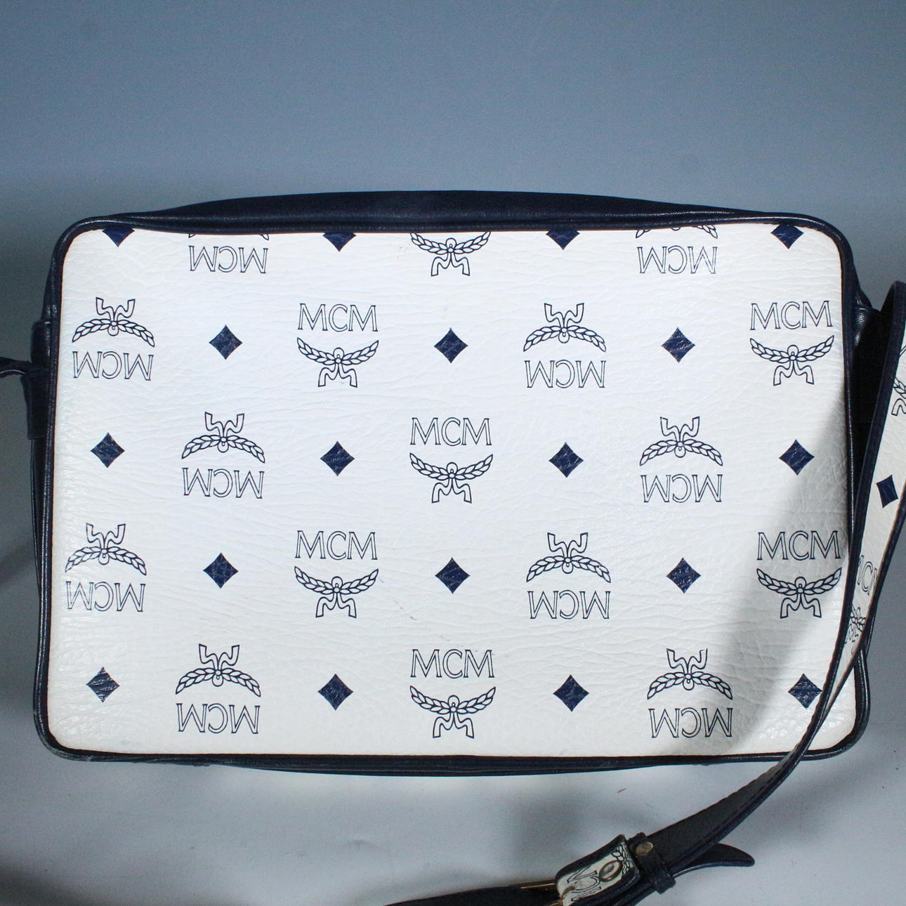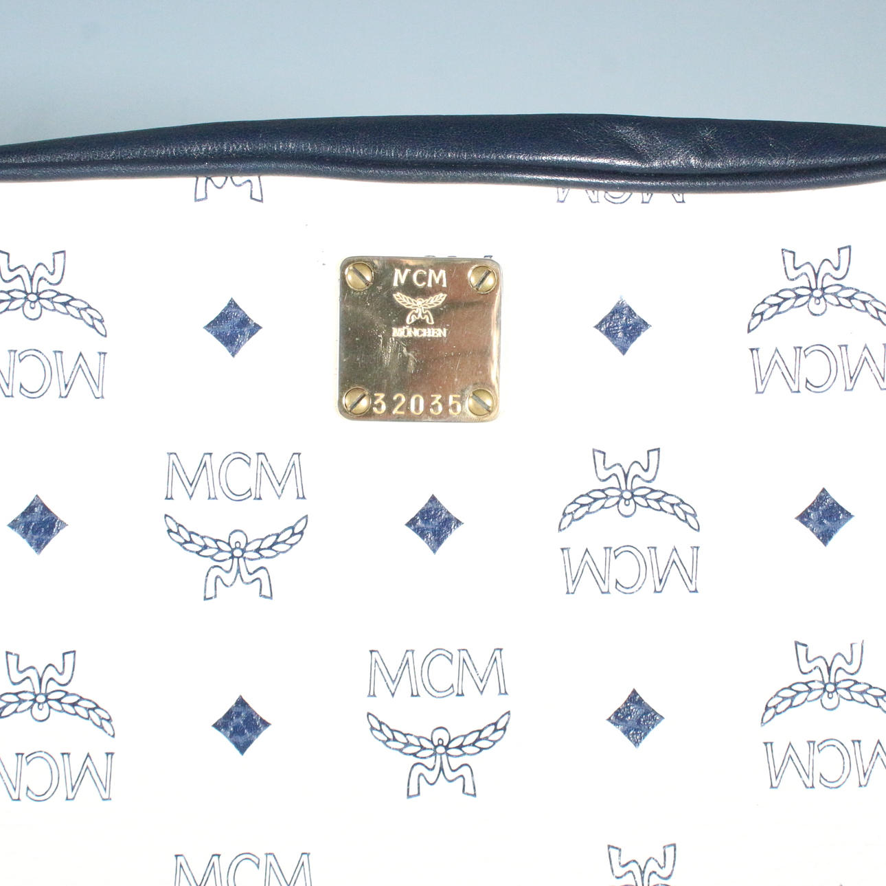 White and navy blue leather shoulder bag with MCM monogram print, MCM MUNICH badge on the front, 32035. Adjustable shoulder strap main compartment with zipper interior with a zippered side pocket.