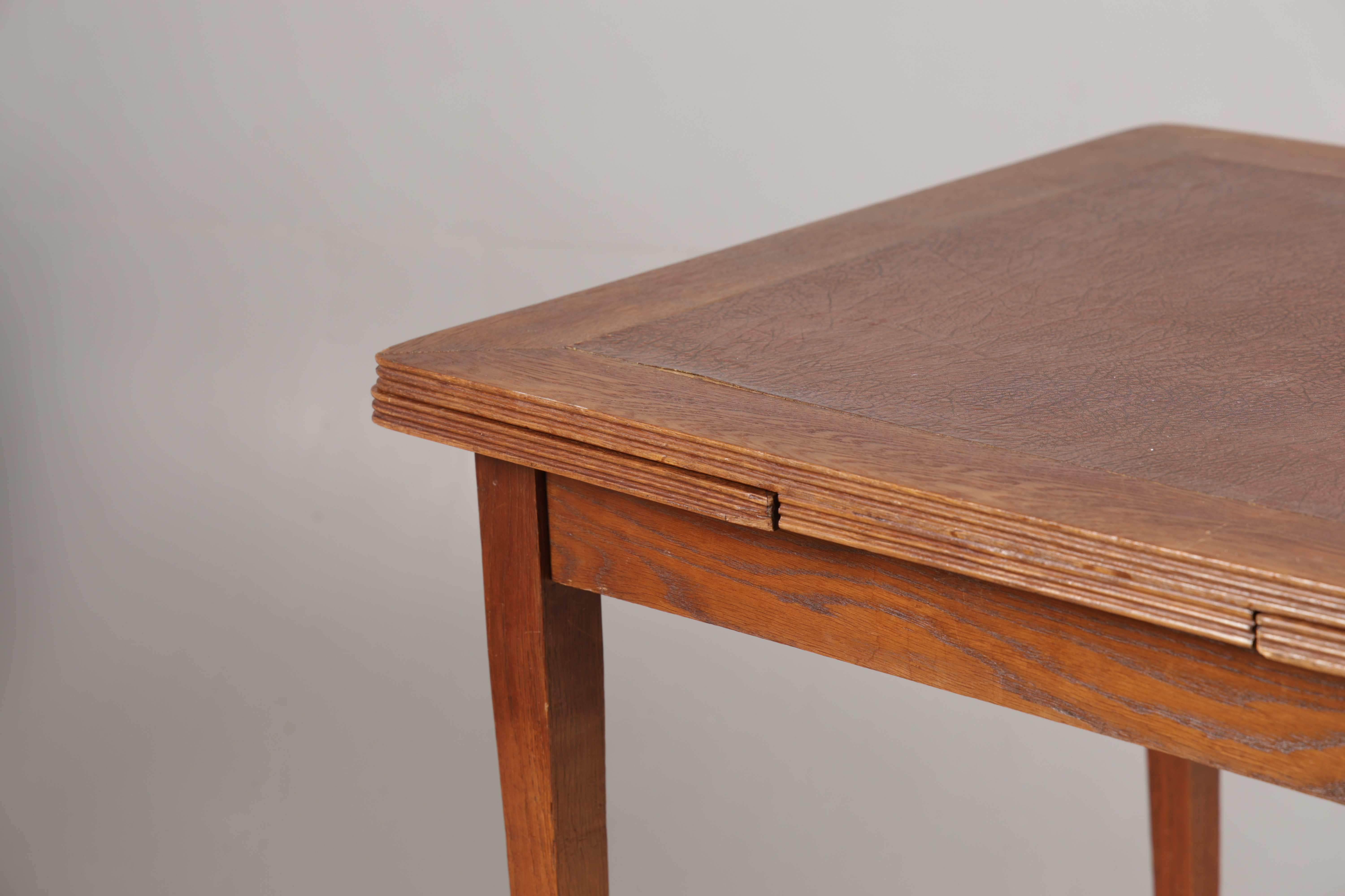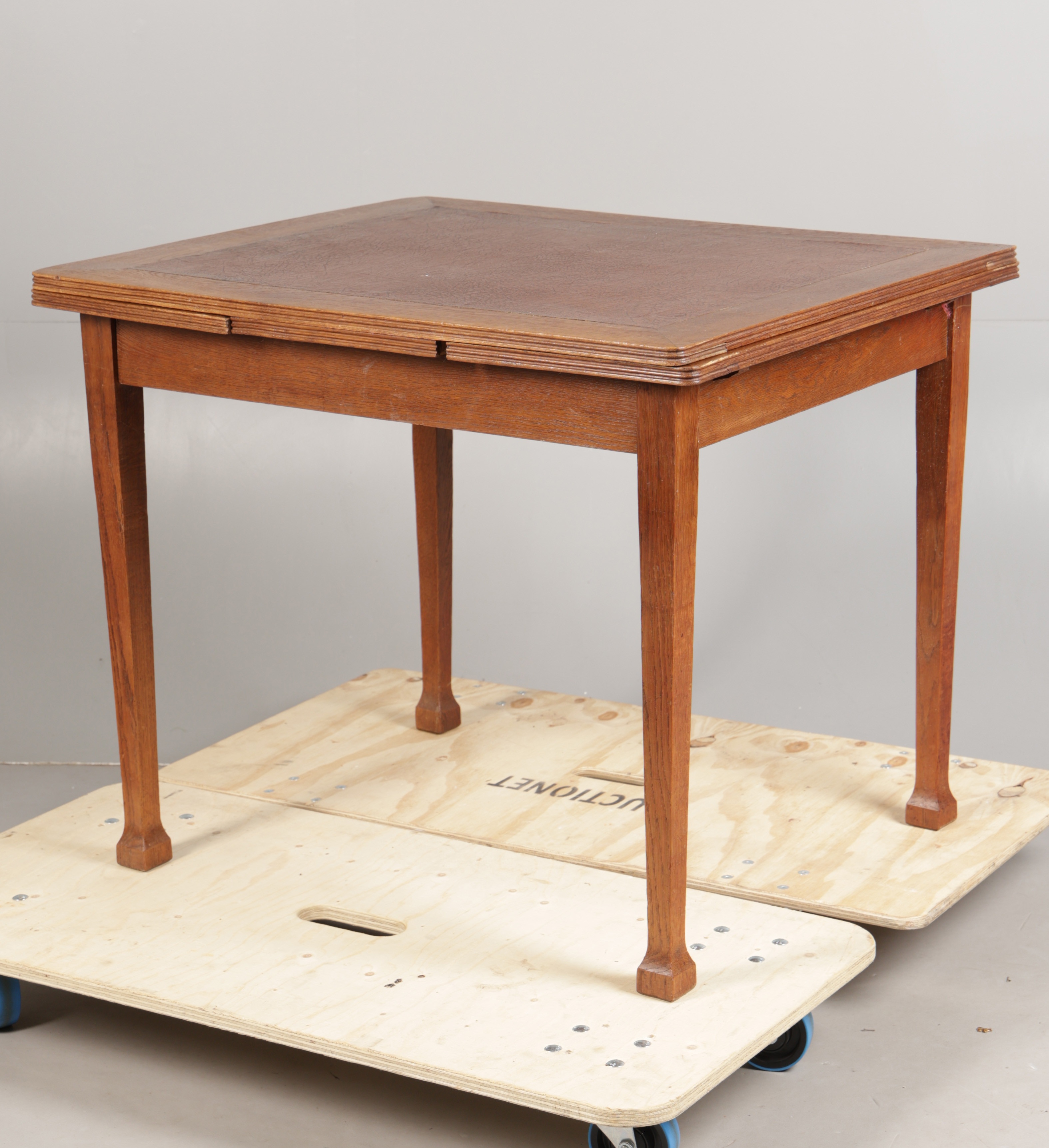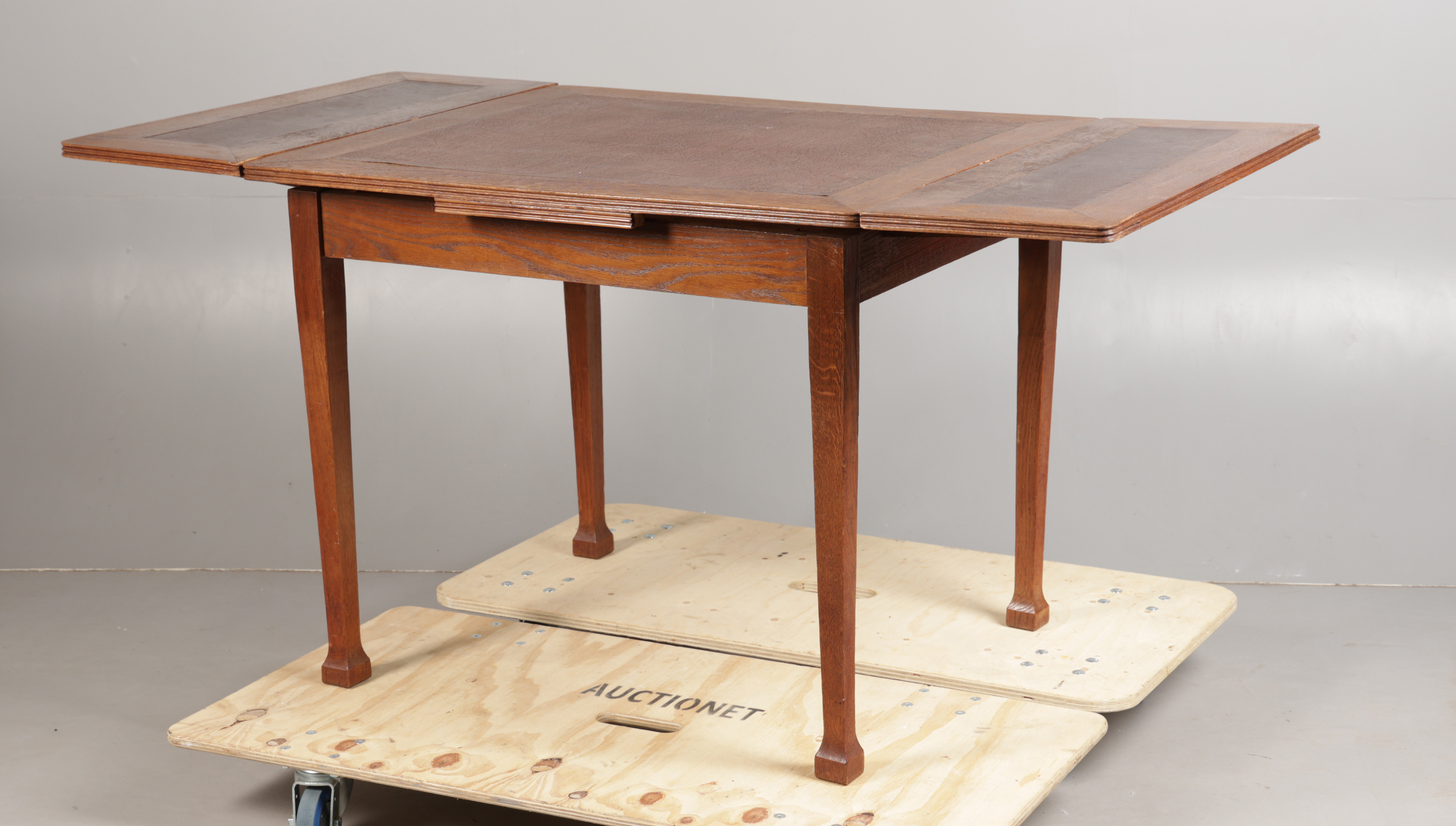 4966085. AN OAK AND LEATHER TOPPED DRAW LEAF TABLE.