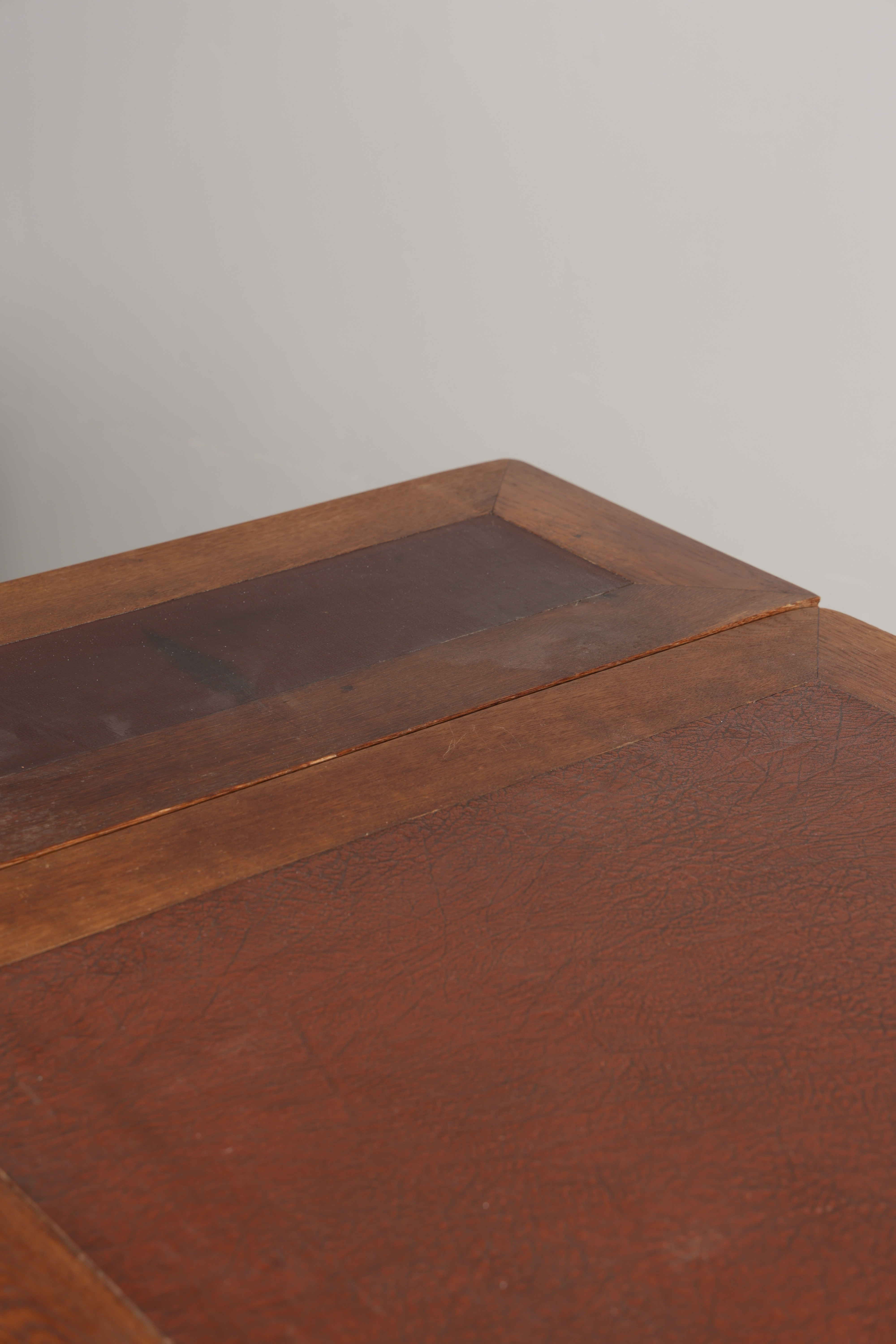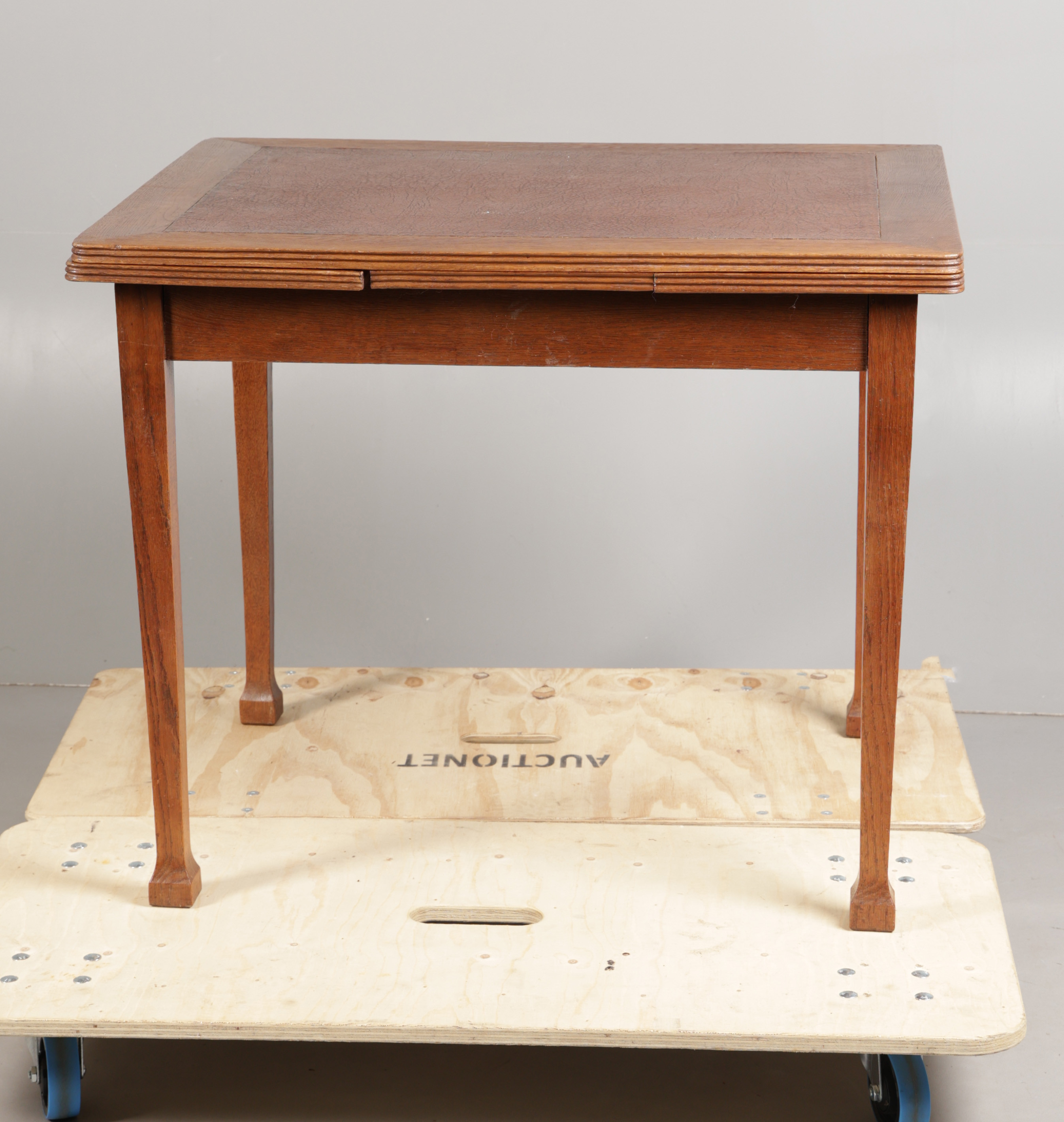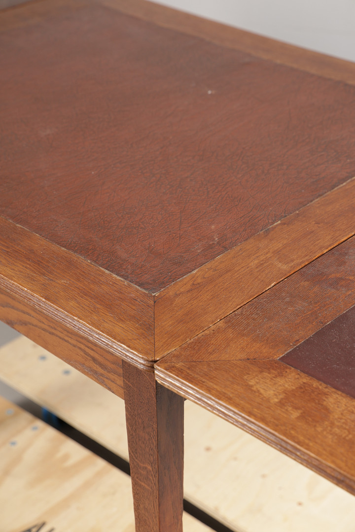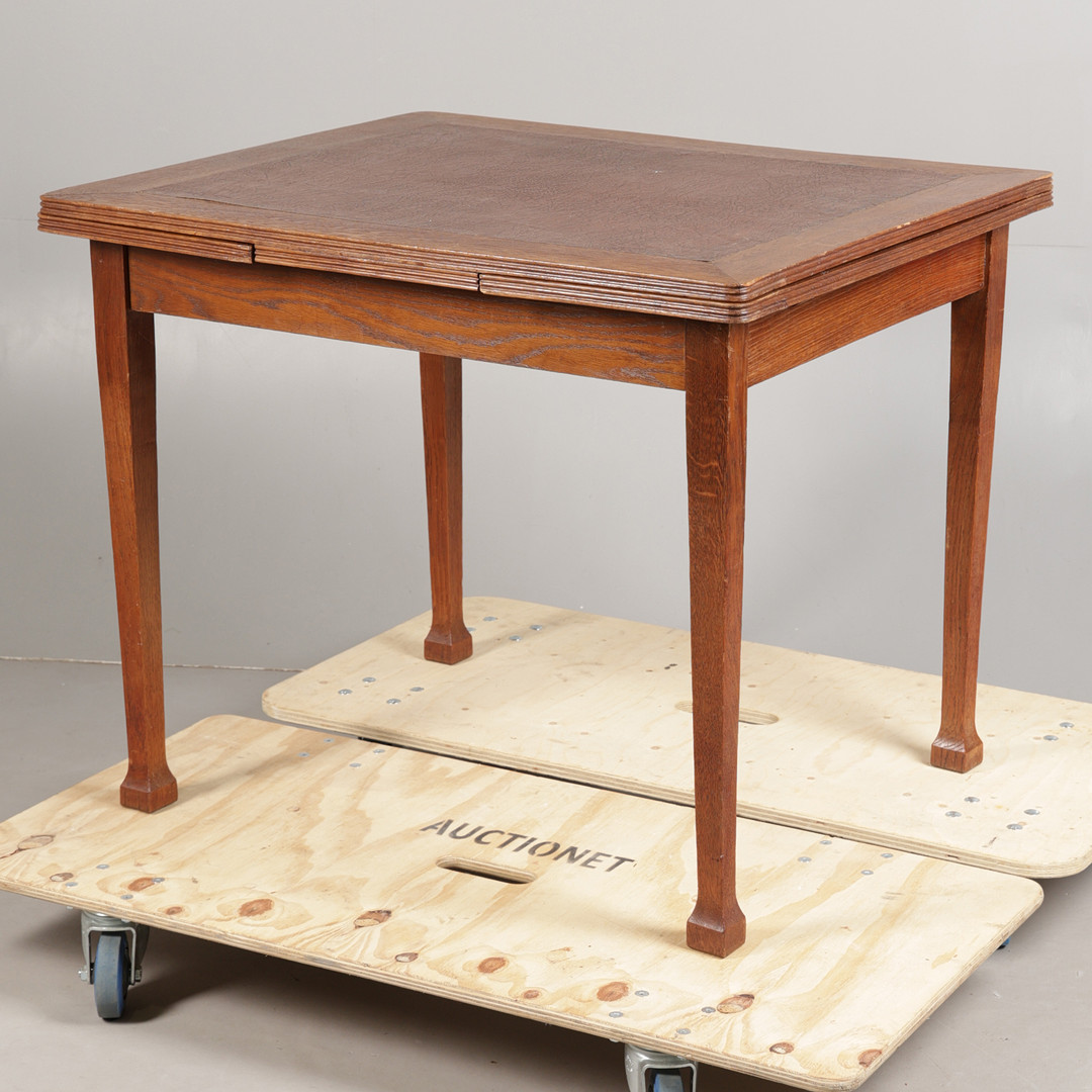 4966085. AN OAK AND LEATHER TOPPED DRAW LEAF TABLE.