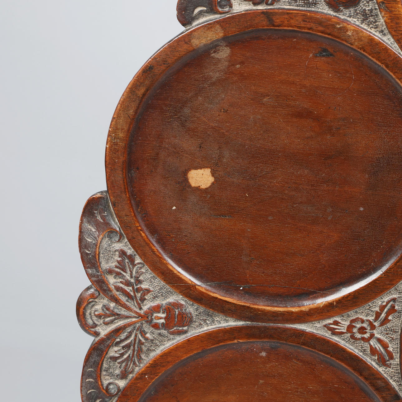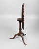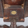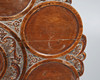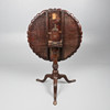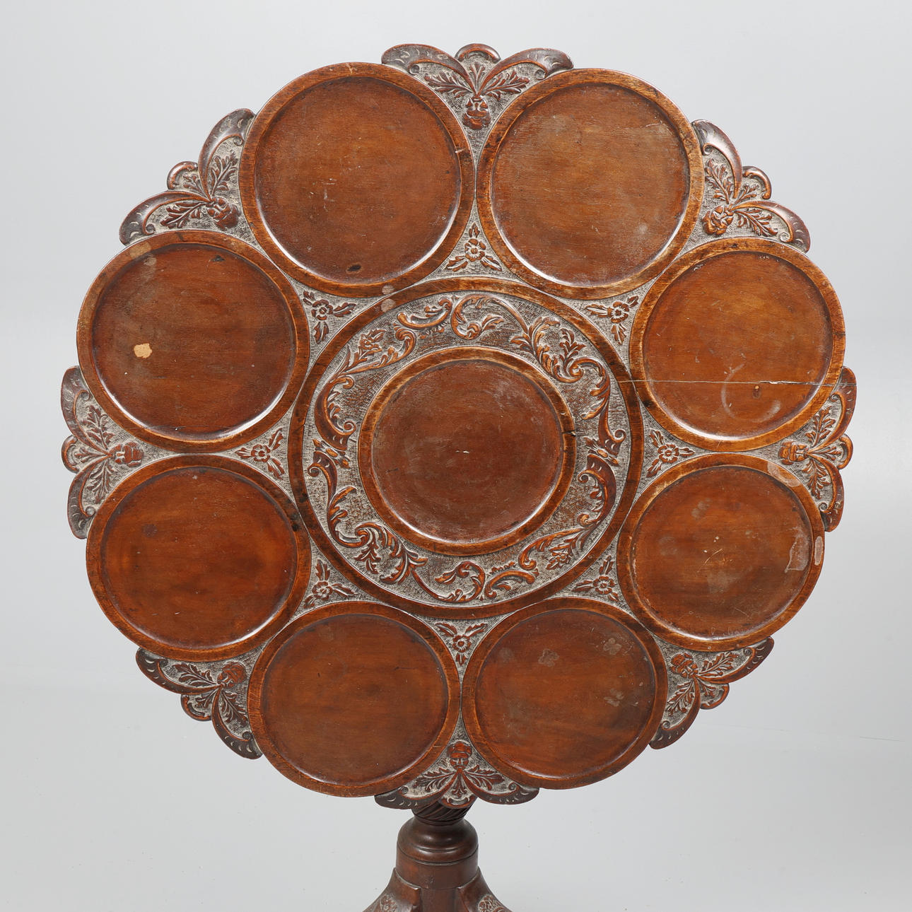 The one-piece tilting circular top carved with 9 circular wells, floral, scrolling foliate, and mask decoration, on a turned tapering ringed column with wrythen urn, 3 cabriole legs with carved flower pot, trumpet, and ribbon decoration, terminating in pad feet, with retailers plaque for S & H Jewell, 132 High Holborn, London, W.C., H.68.5 x Dia.73cm.