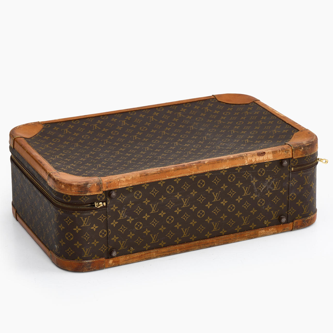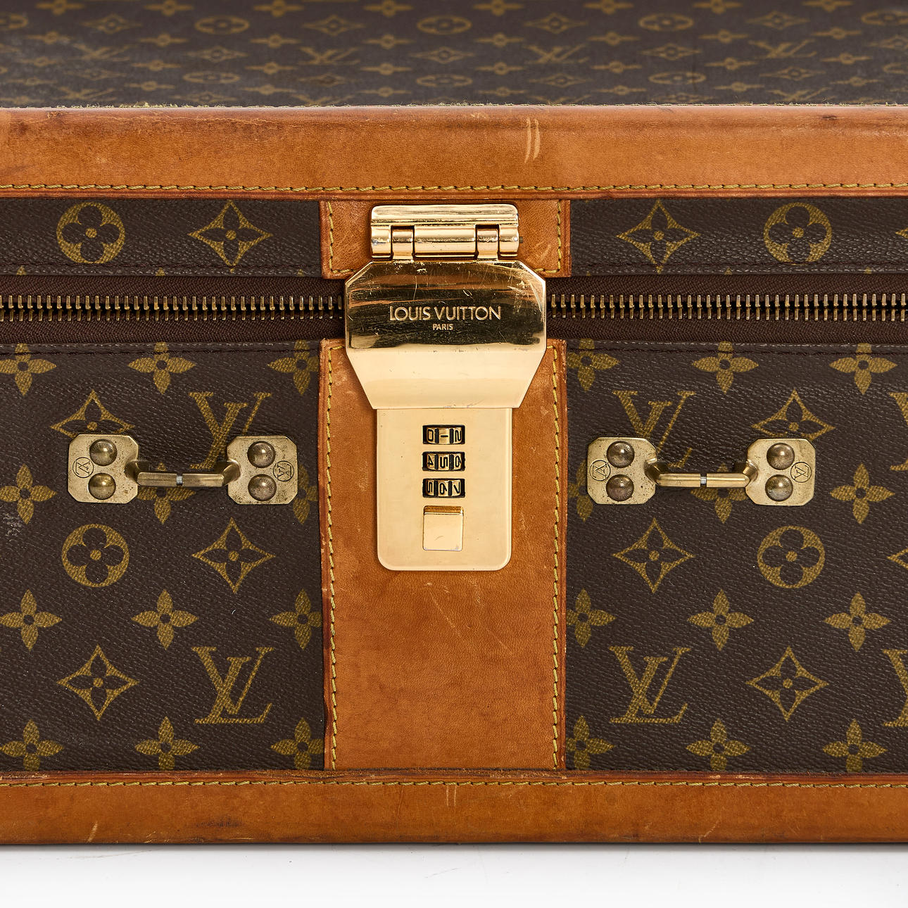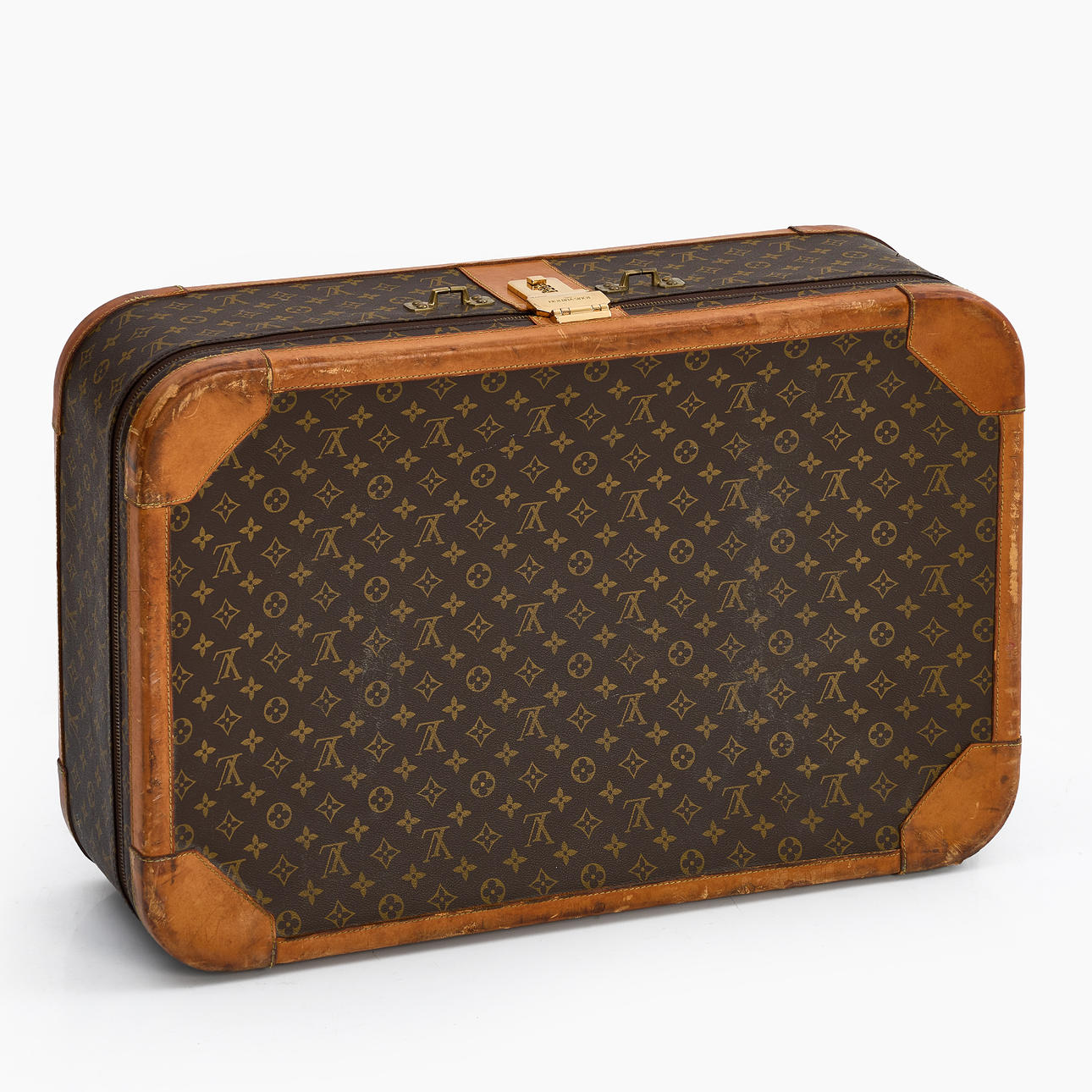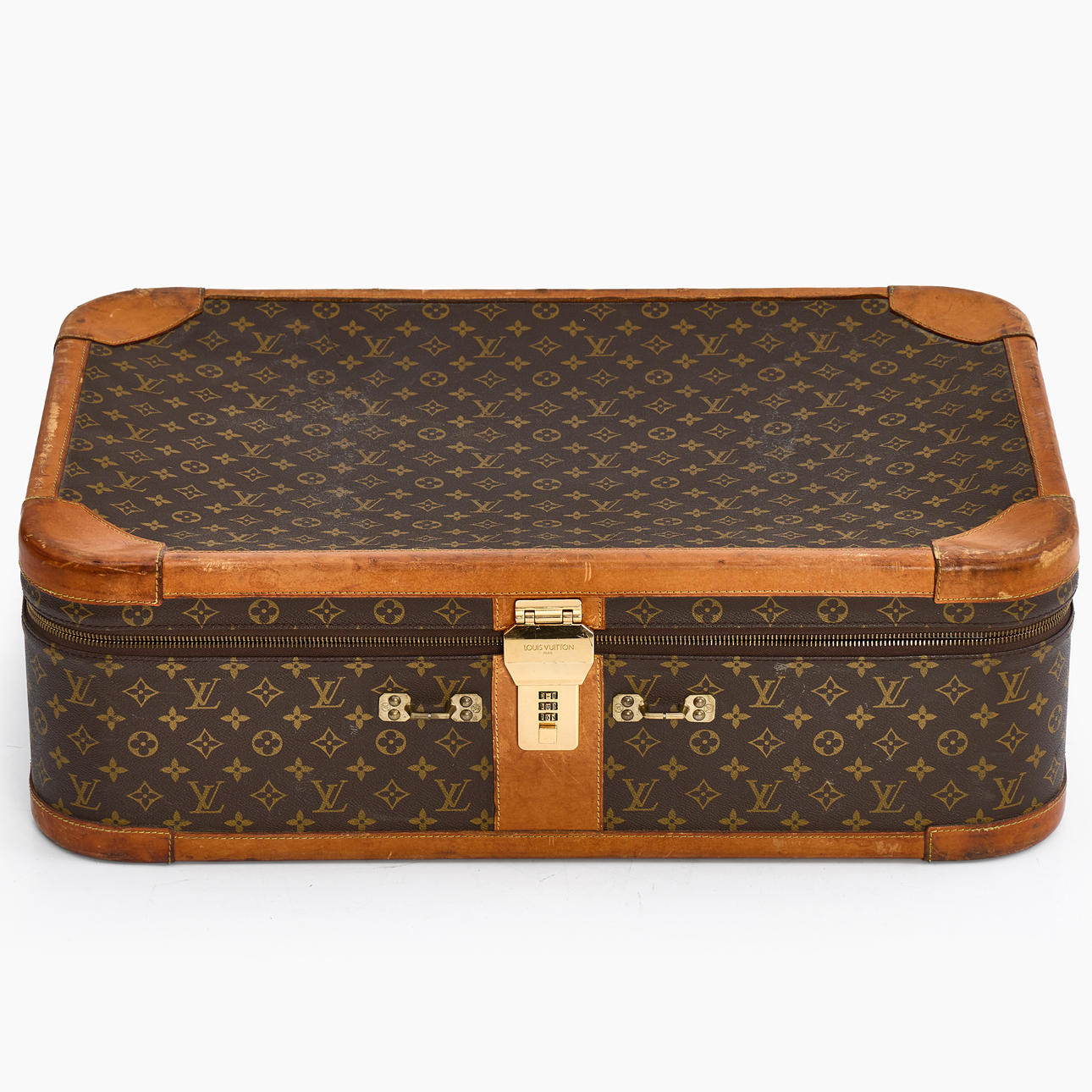 Wear, stains, scratches, marks, chafing. Carrying handle is missing. Locked (unknown code).