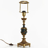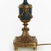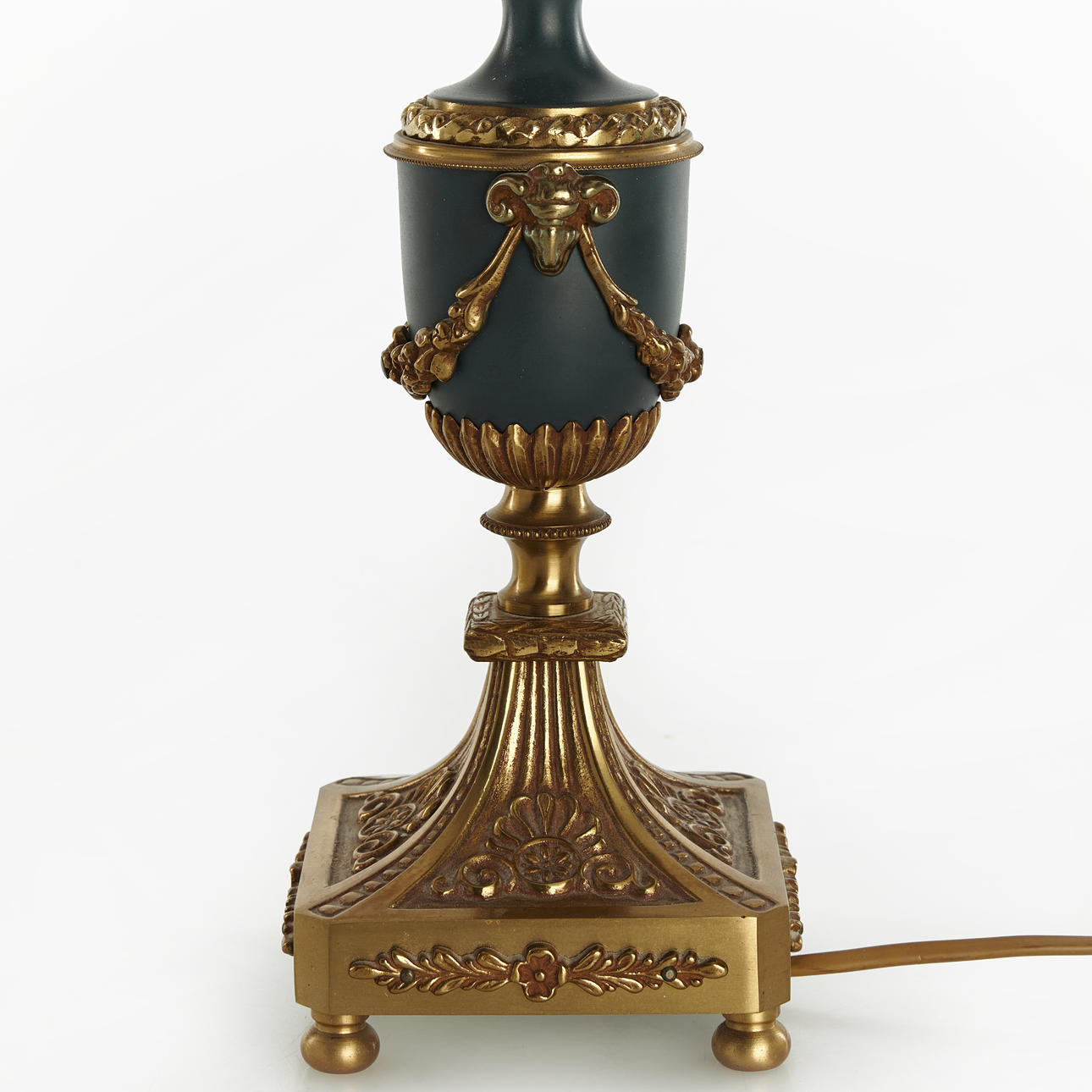 A table lamp, Einar Bäckström, Malmö, model 5656, brass and green lacquered sheet, decor of buck heads and garlands.