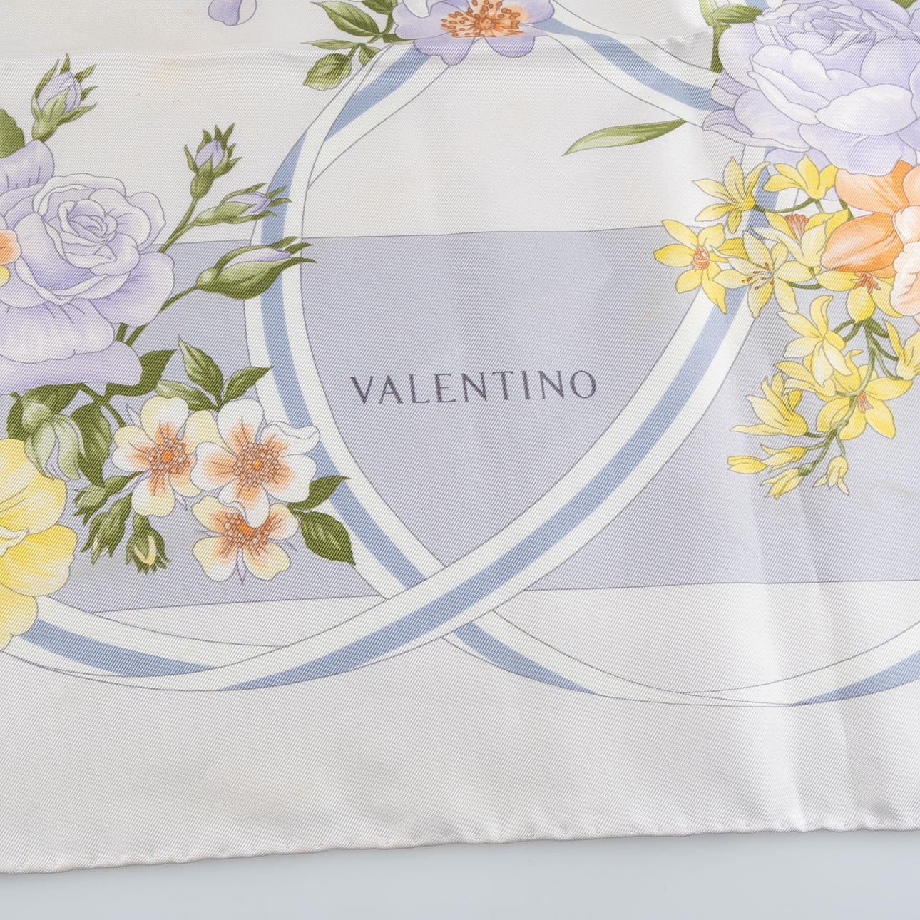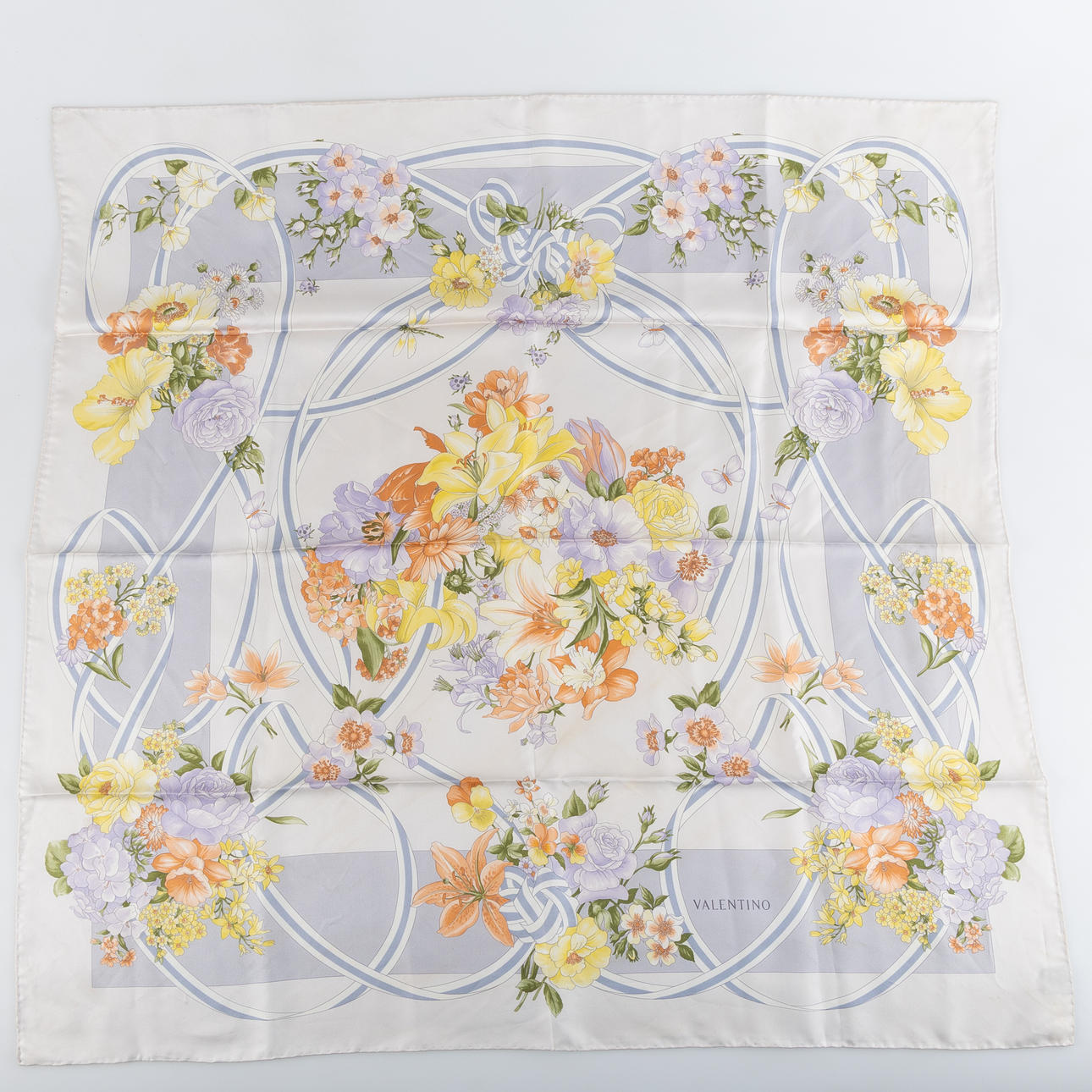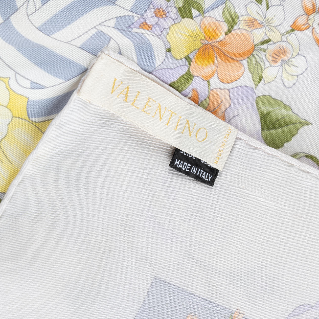 Floral pattern on a cream-white background. Labeled VALENTINO, 100% silk.