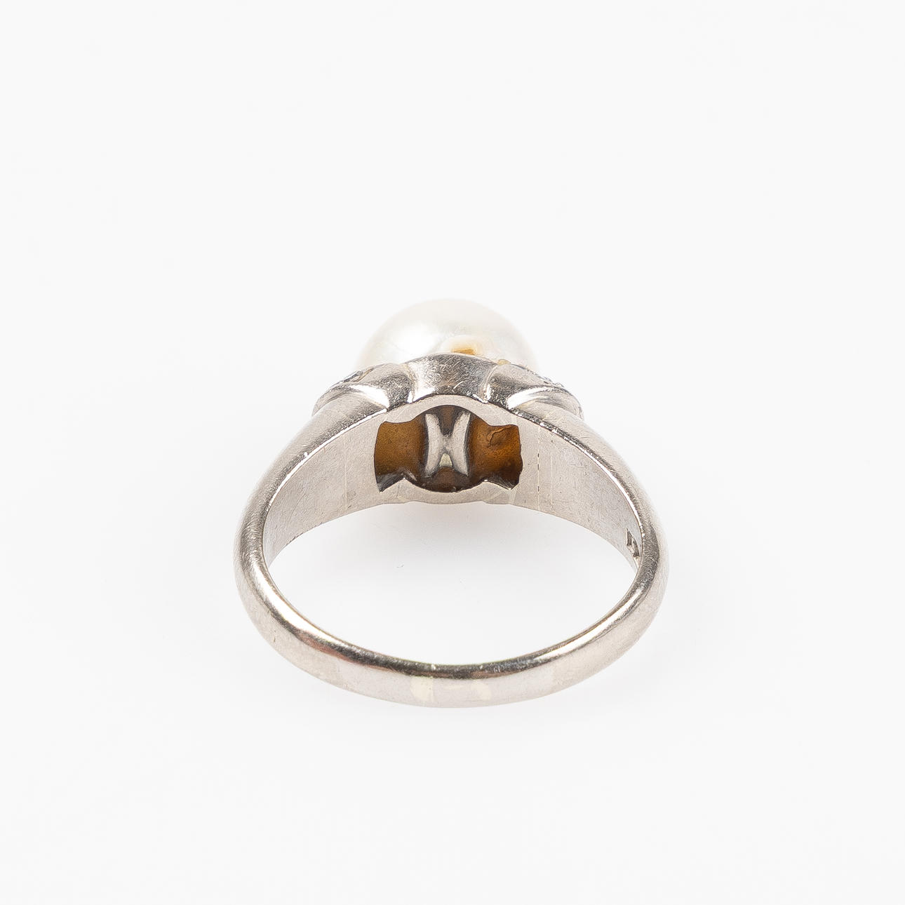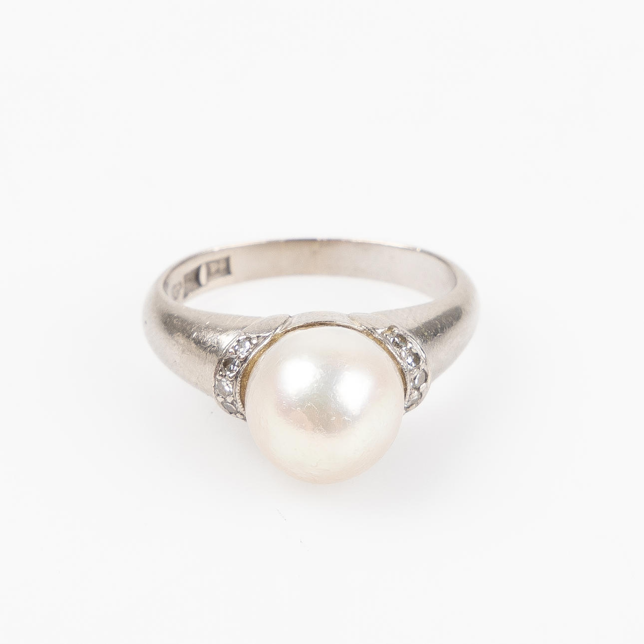 Set with cultured pearl diameter approx. 10 mm. and 10 small octagonal cut diamonds. Ringstrl. about 17.25 mm. Weight about 8.2 grams.