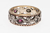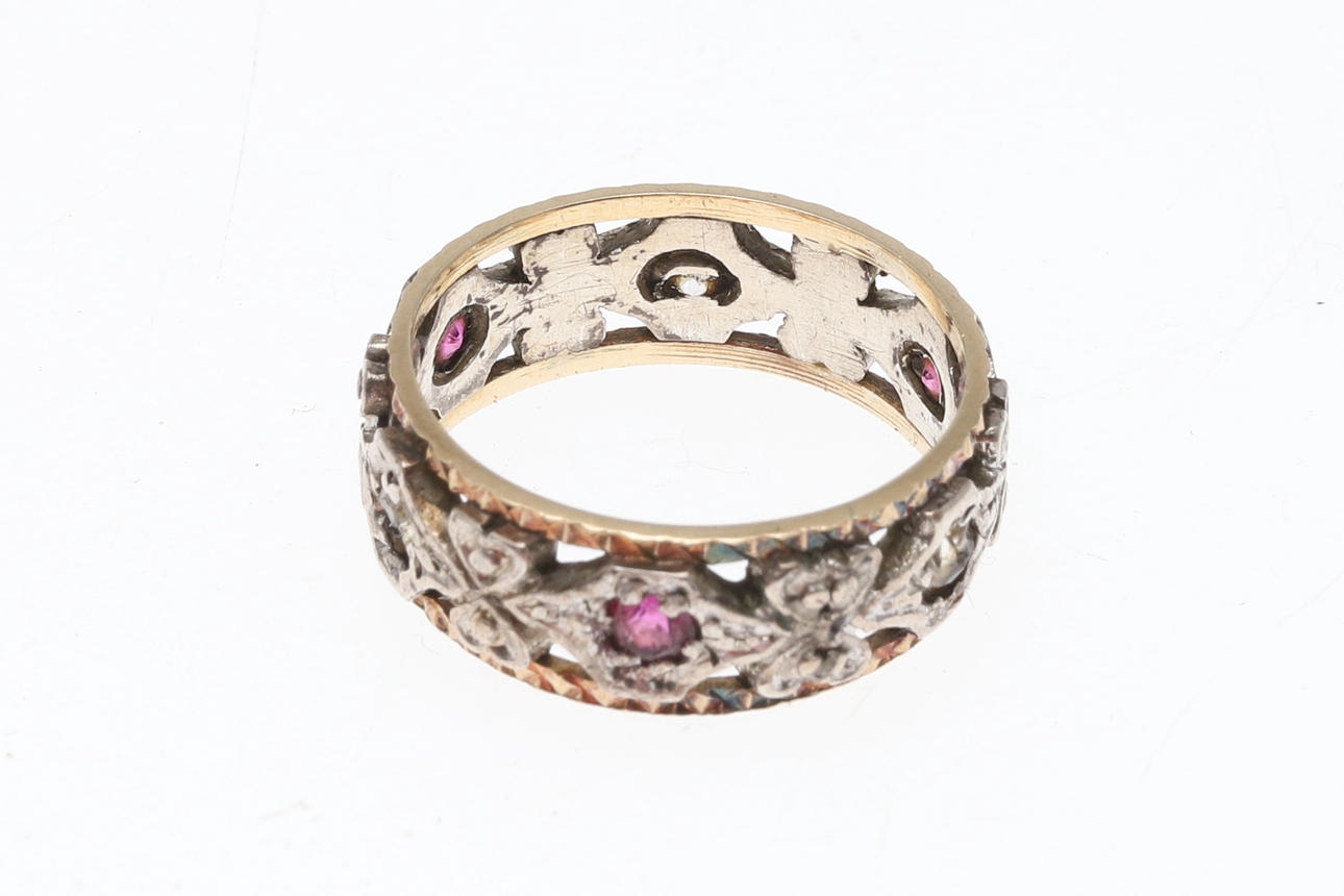 the two colour 9ct gold ring set with red and white stones, size H 1/2, 2.8g.