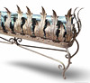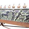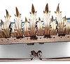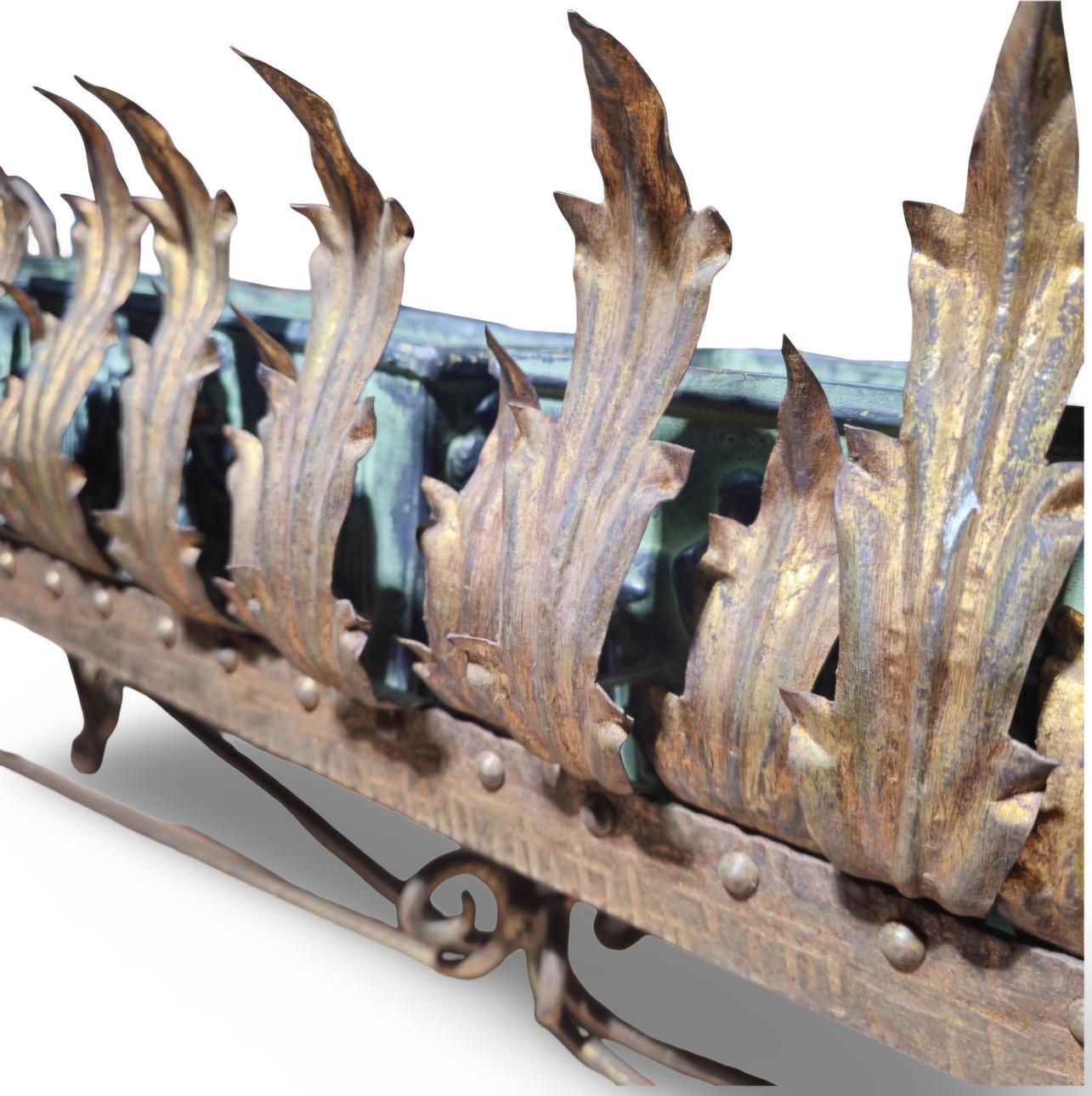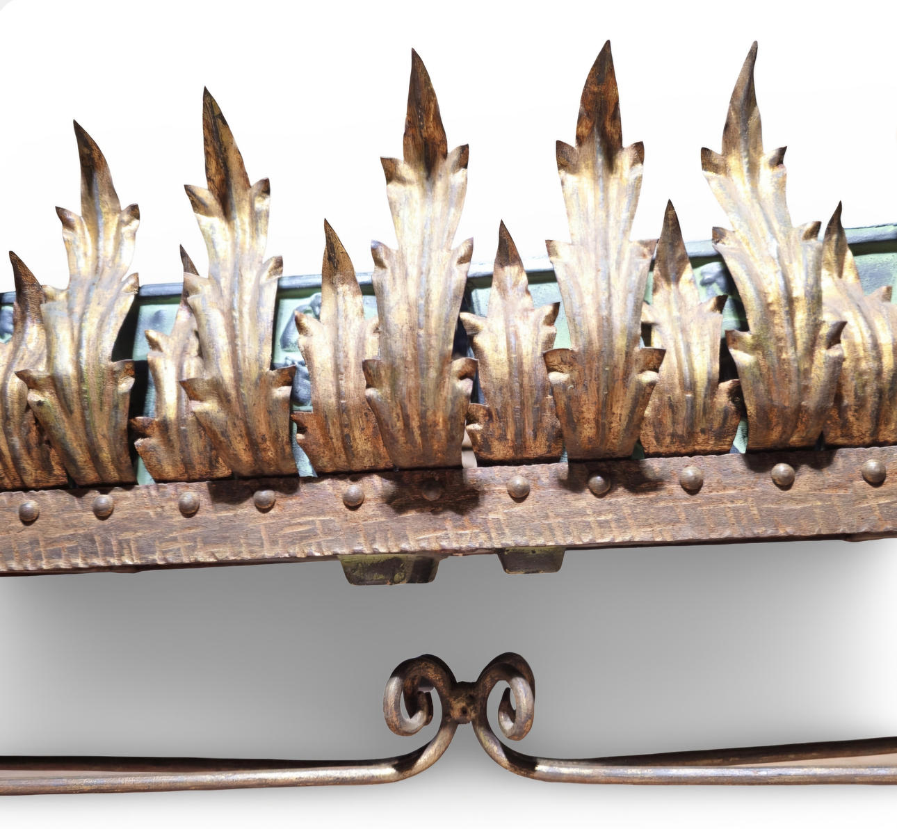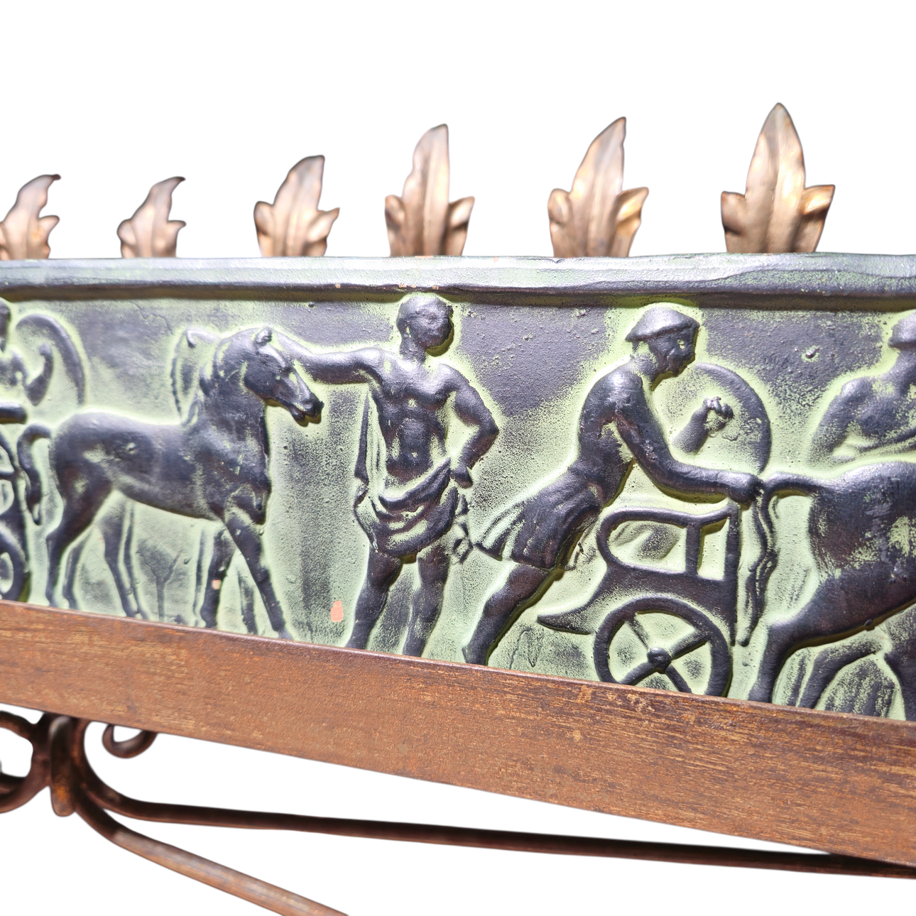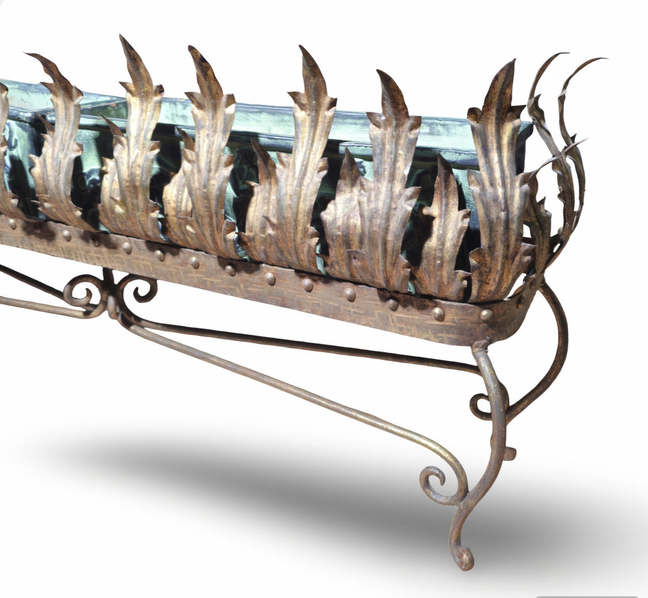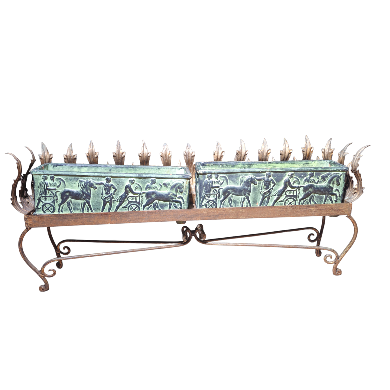 Golden brass structure with acanthus leaves with ceramic planters decorated in a classic style.