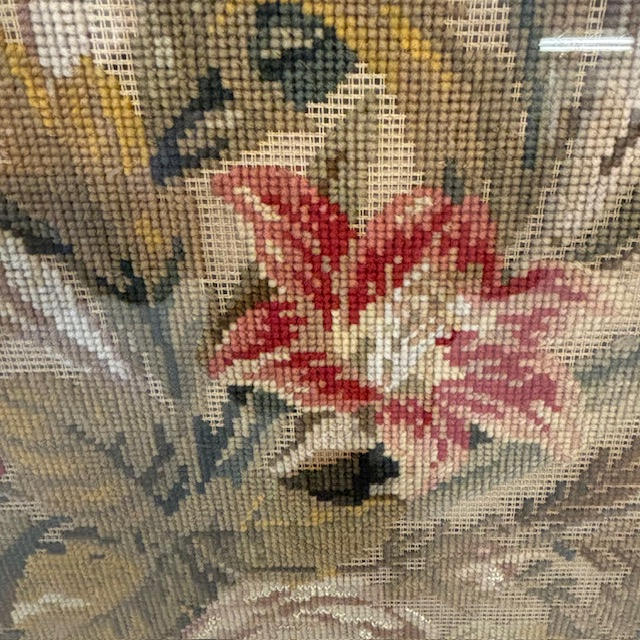 Antique 19th century decorative cross stitch picture depicting flowers, framed and glazed, approximately 61 x 67cm.