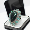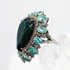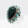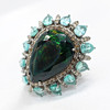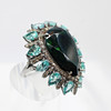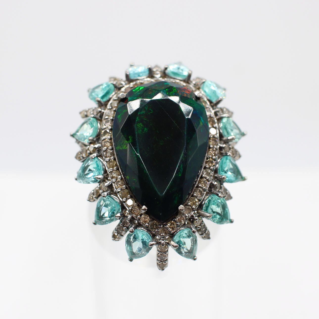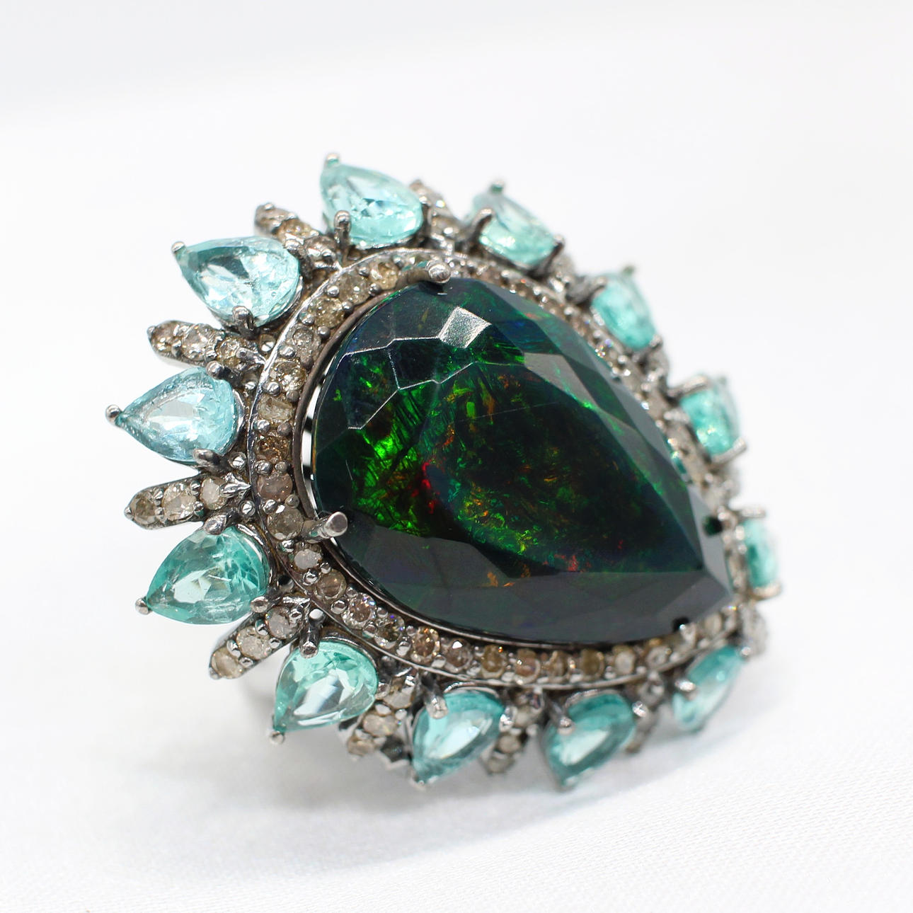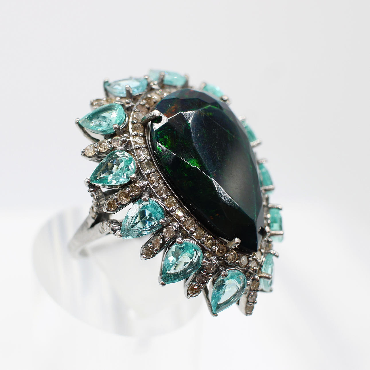 A striking silver (tested as silver, unmarked) large dress ring set with pear shaped dark green/black opal, pear shaped apatite and diamonds.