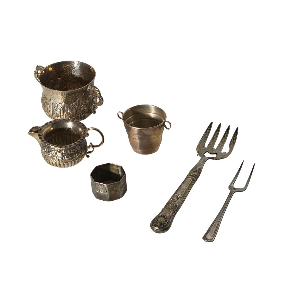 4967385. MISCELLANY OF ENGLISH PUNCHED SILVER OBJECTS.