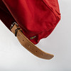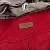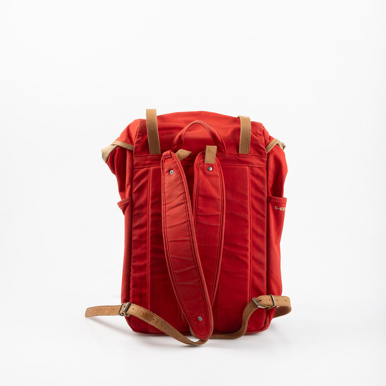 Thermos pocket, laptop compartment, seat cushion. Height approx. 40 cm. Red with leather details.