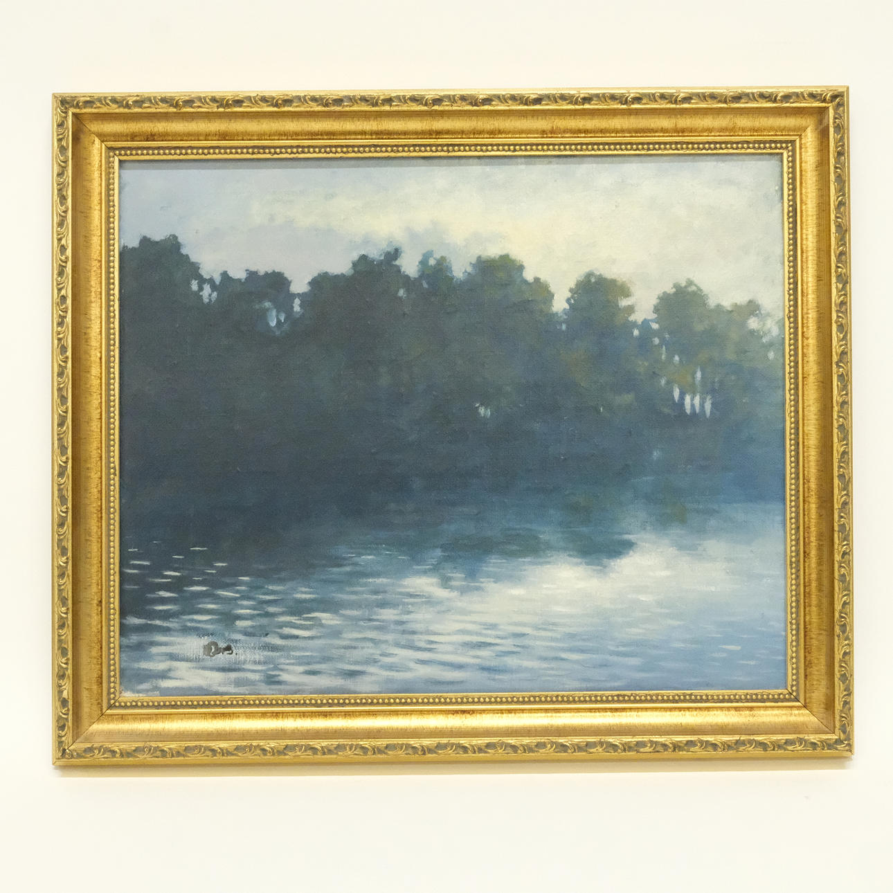 OIDENTIFIERAD KONSTNÄR. WATERCOURSE WITH FOREST, OIL ON CANVAS.