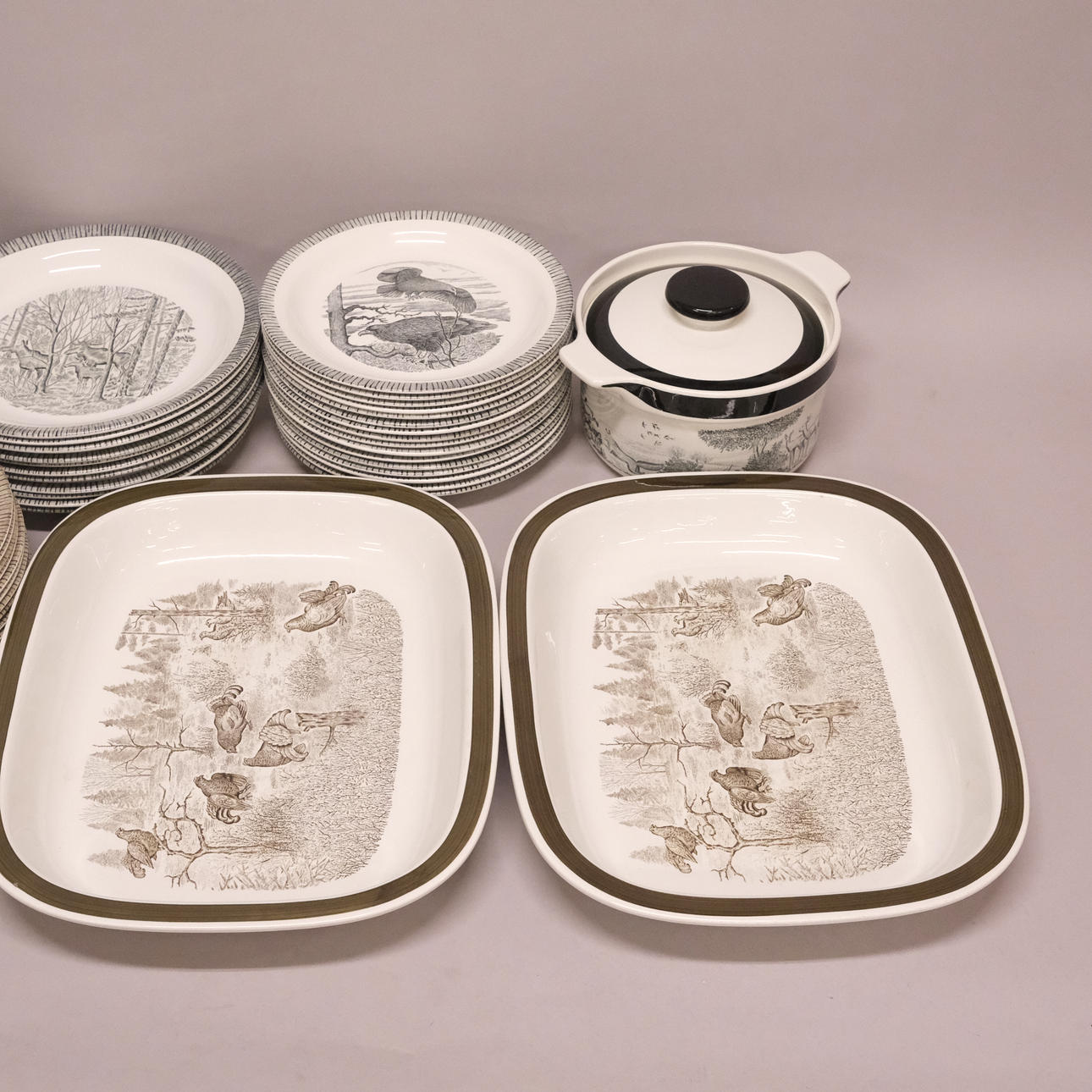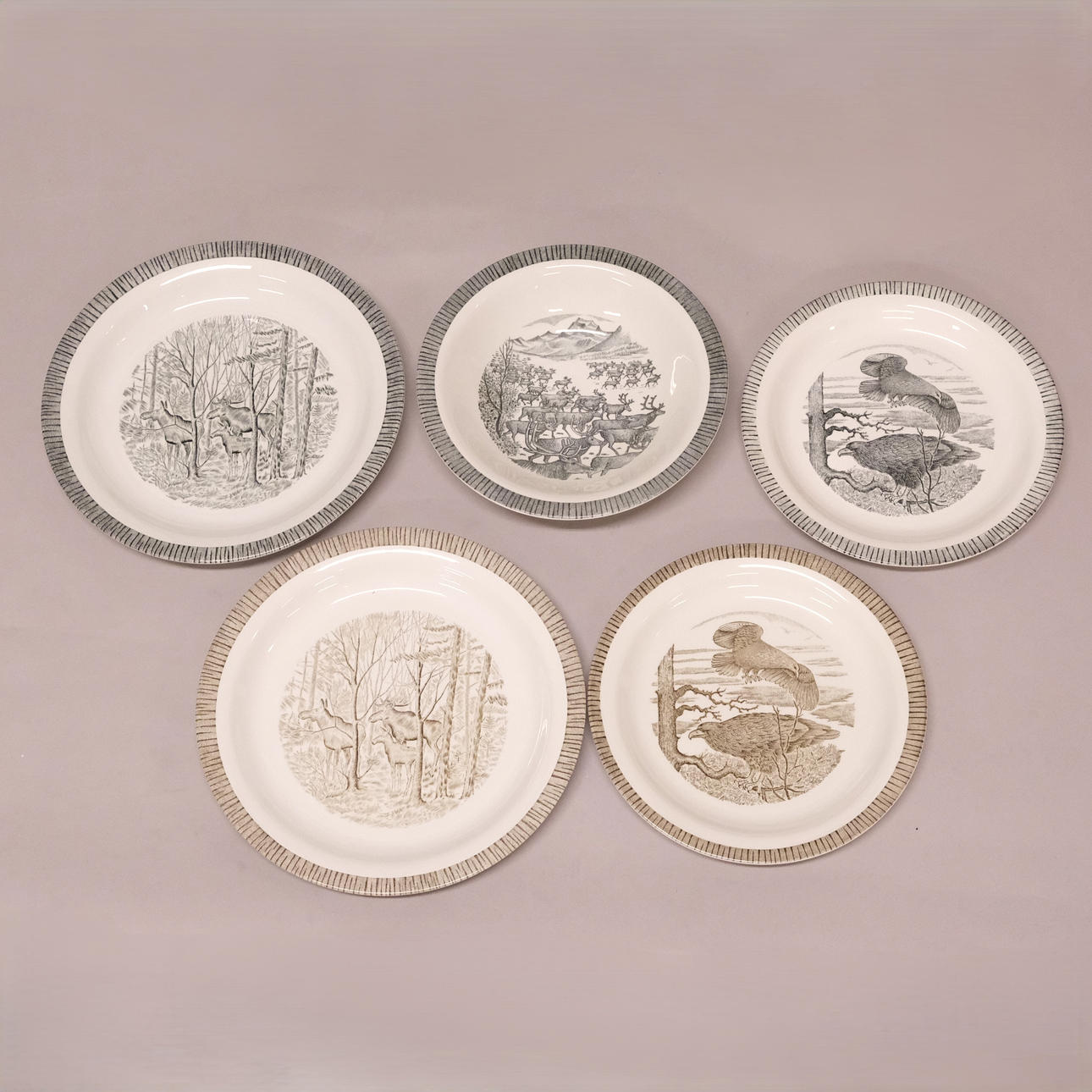 Design in gray: 11 plates, diameter 24 cm, 16 plates, diameter 21 cm, 22 deep plates, diameter 20 cm, 2 carottes, height 11 cm, diameter 18 cm.