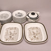 Brown decor: 7 plates, diameter 24 cm, 12 plates, diameter 21 cm and 2 baking dishes, dimensions 29 x 37 cm, height 4,5 cm.