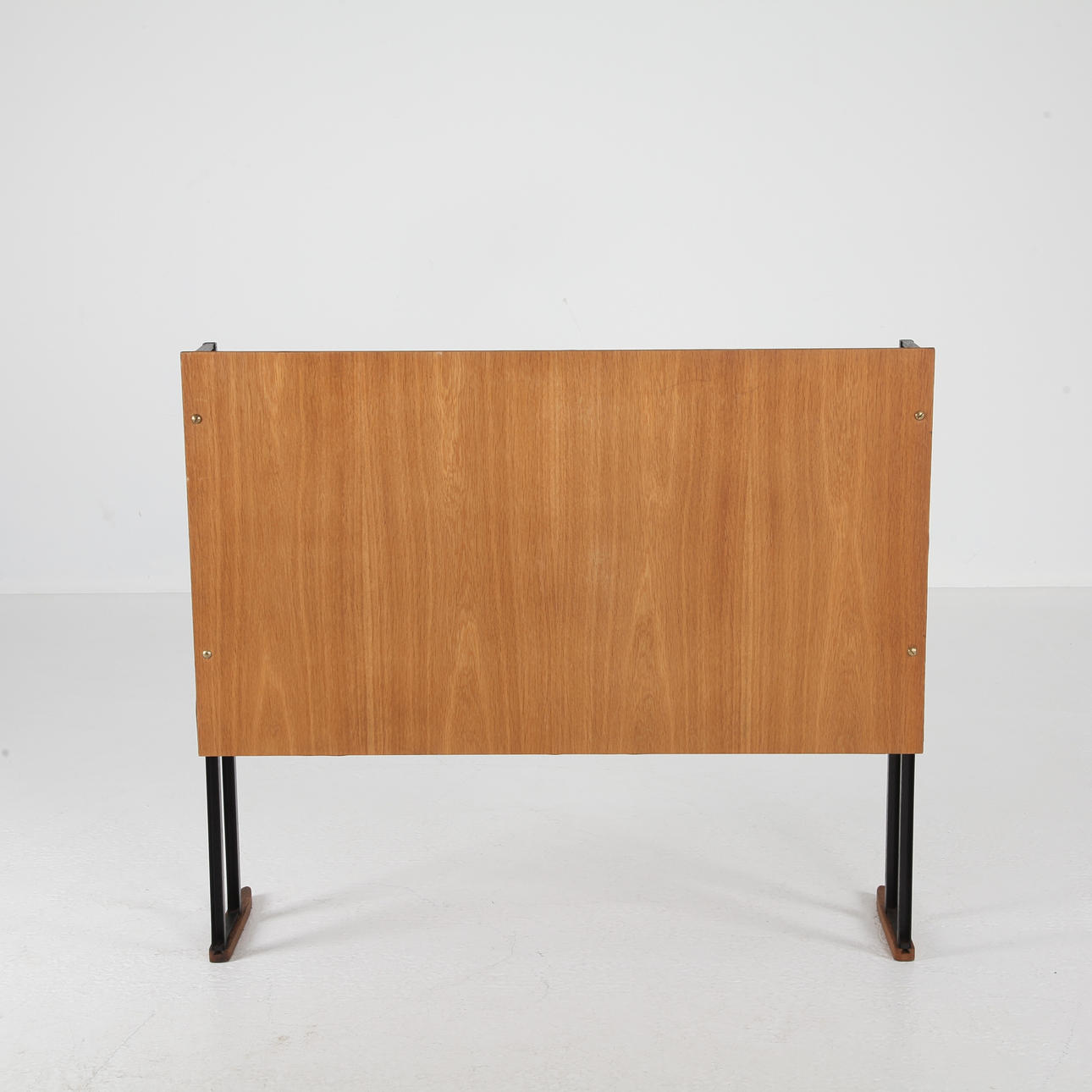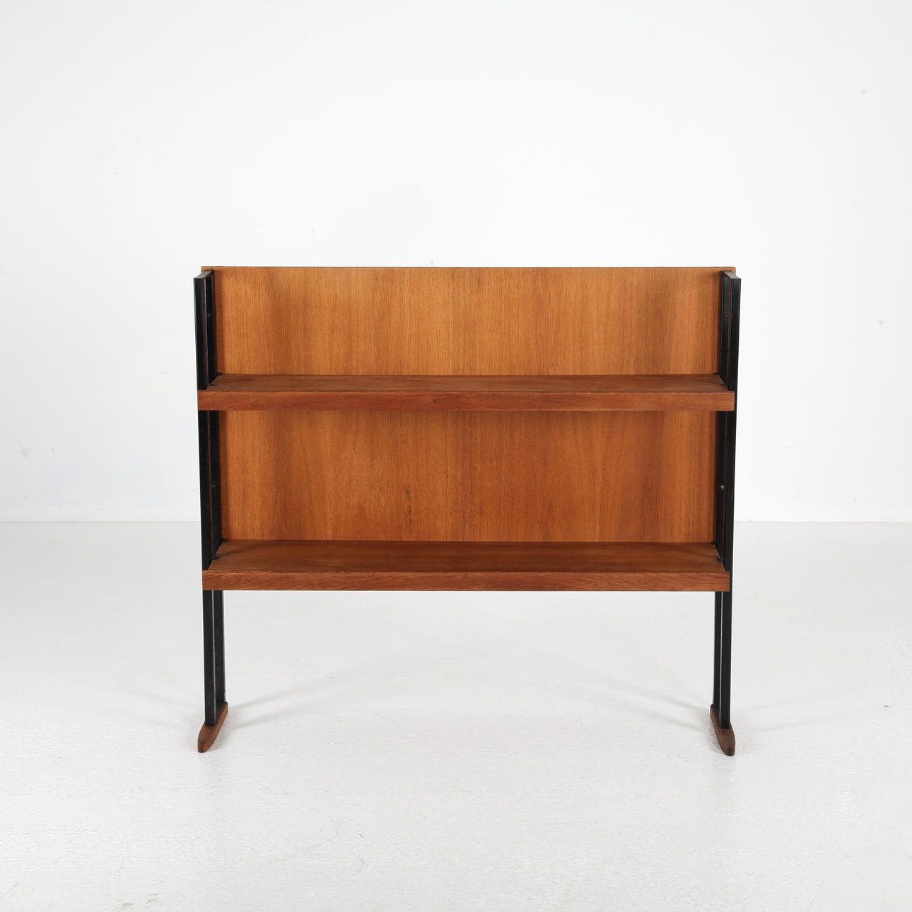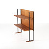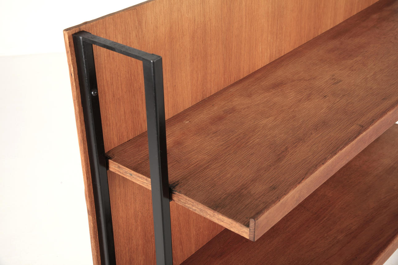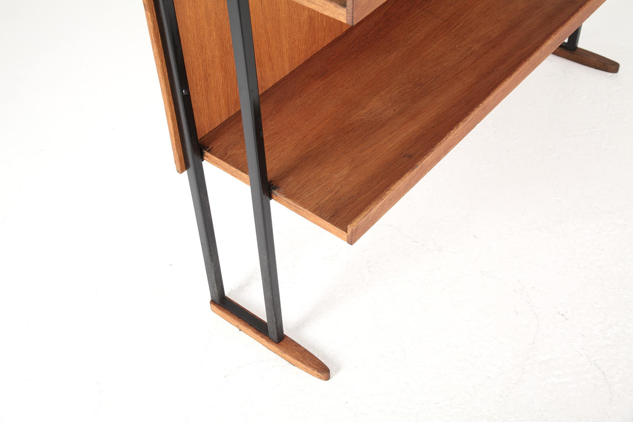 Shelf, stand in black painted iron. Medar, shelves and back cover in oak and oak veneer.