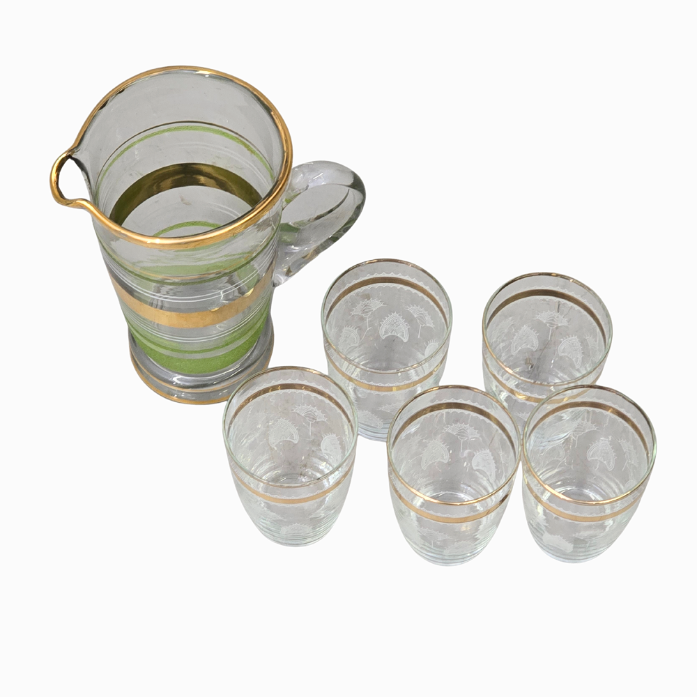 4967822. WATER JUG DECORATED WITH 5 DECORATED GLASSES.