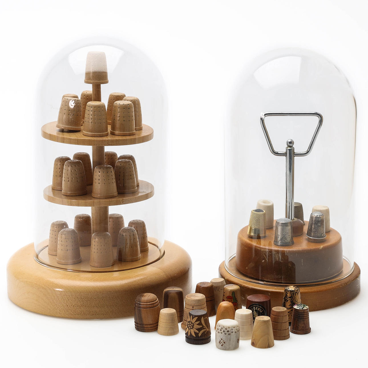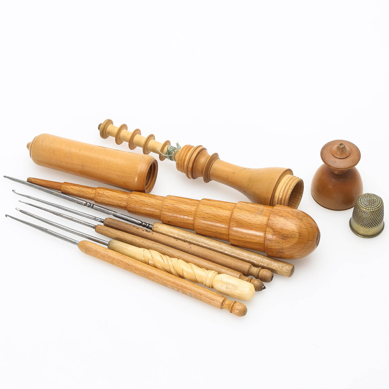 Wood, glass, horn, metal and silver.