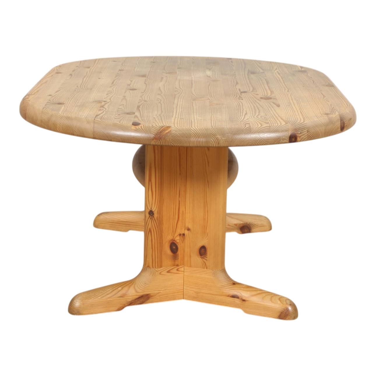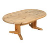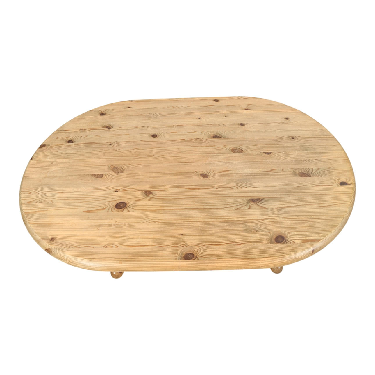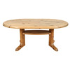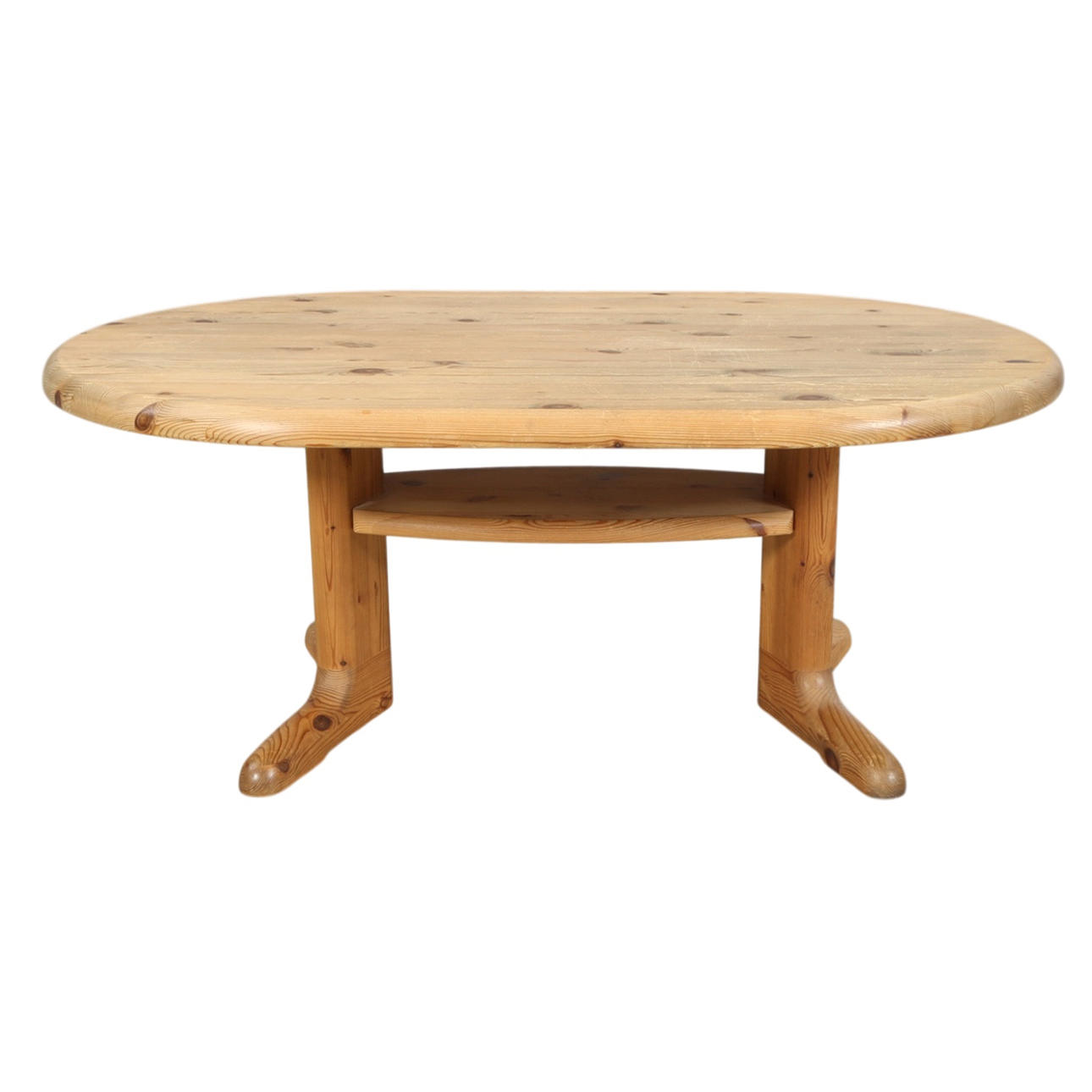 Oval coffee table made of solid pine, frame with sloping shaker legs and a newspaper shelf. 1970s-1980s. H. 53, L. 130, B. 82 cm.