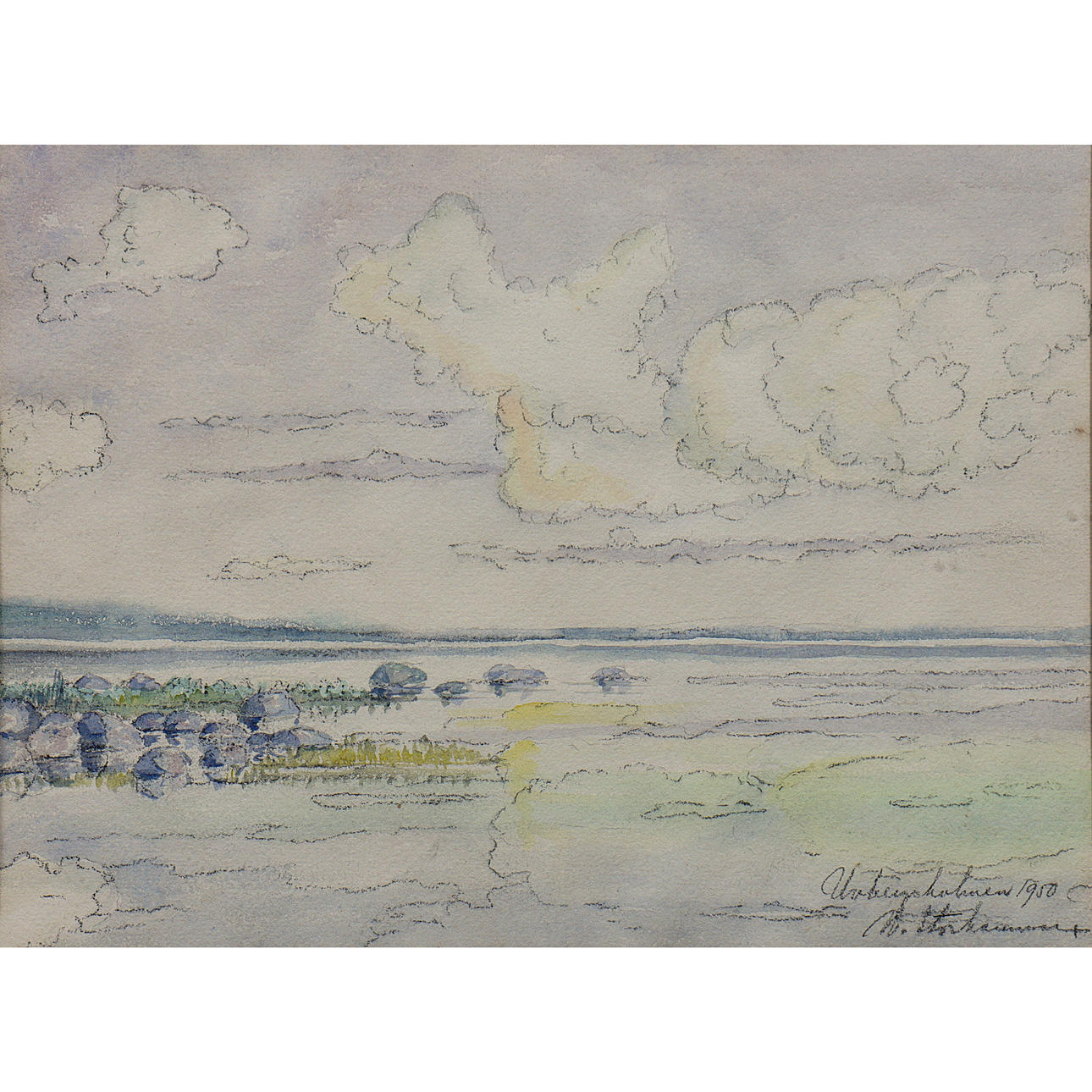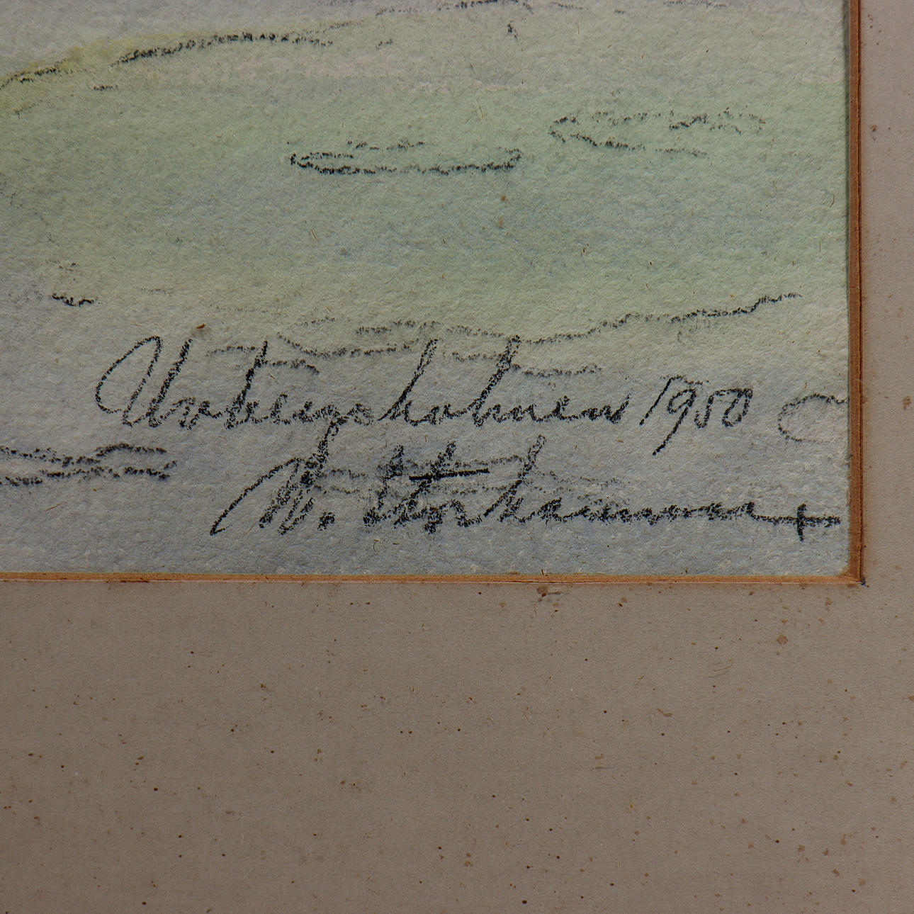 WATERCOLOUR, GLAZED, SIGNED, DATED 1950, UNIDENTIFIED ARTIST.