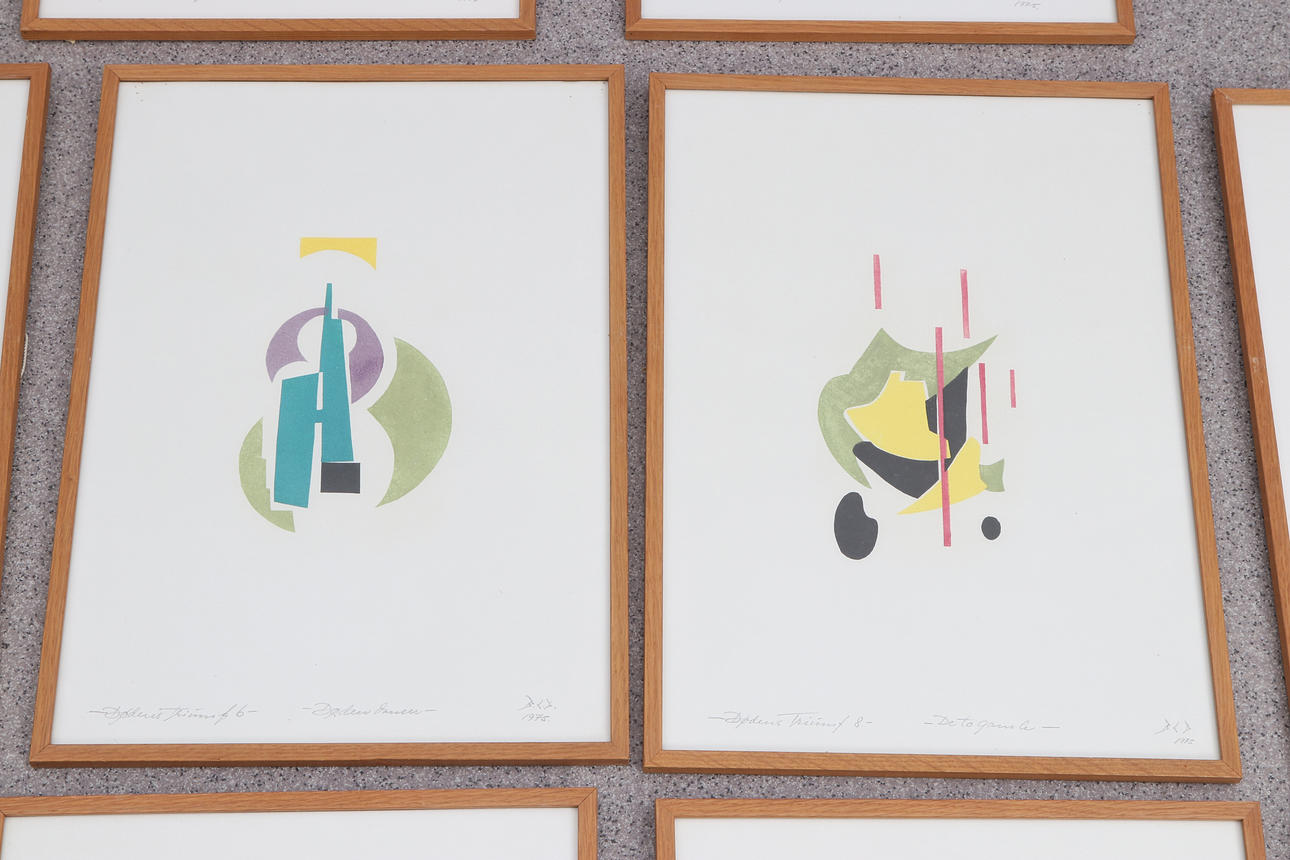 OIDENTIFIERAD DANSK KONSTNÄR. 10 framed graphic sheets. From the folder “Triumph of Death”. Monogram signed B.C.D. and dated 1975. Abstract motifs.
