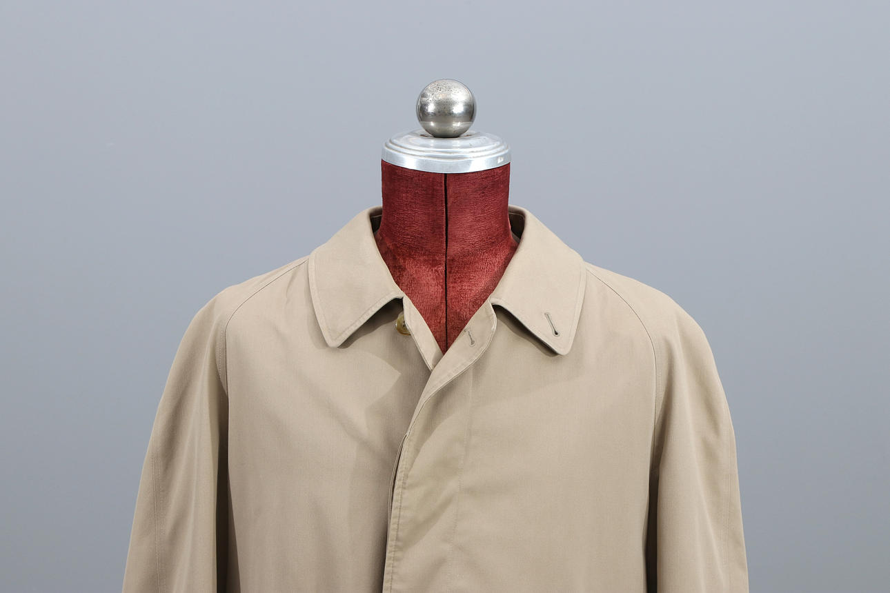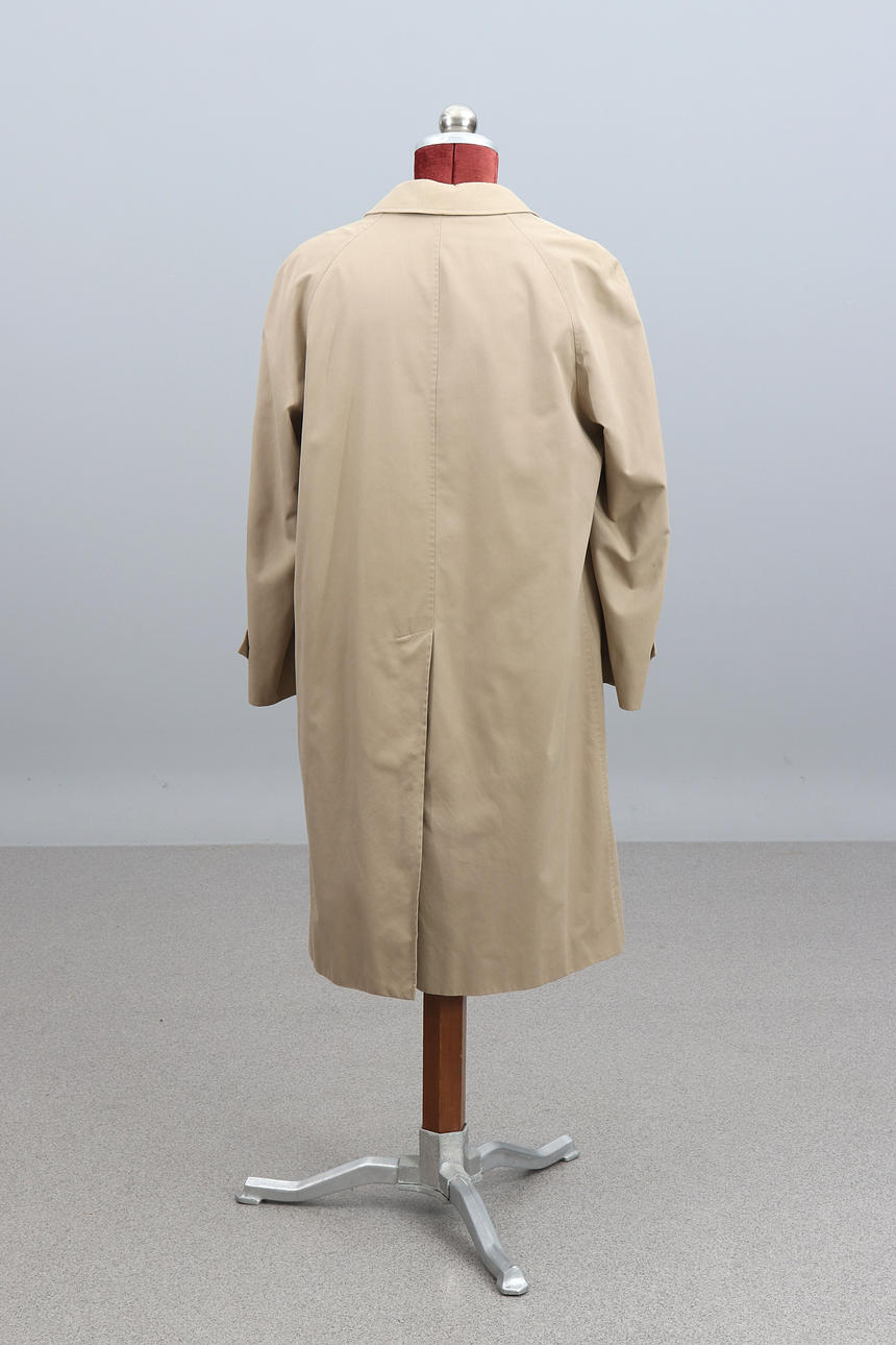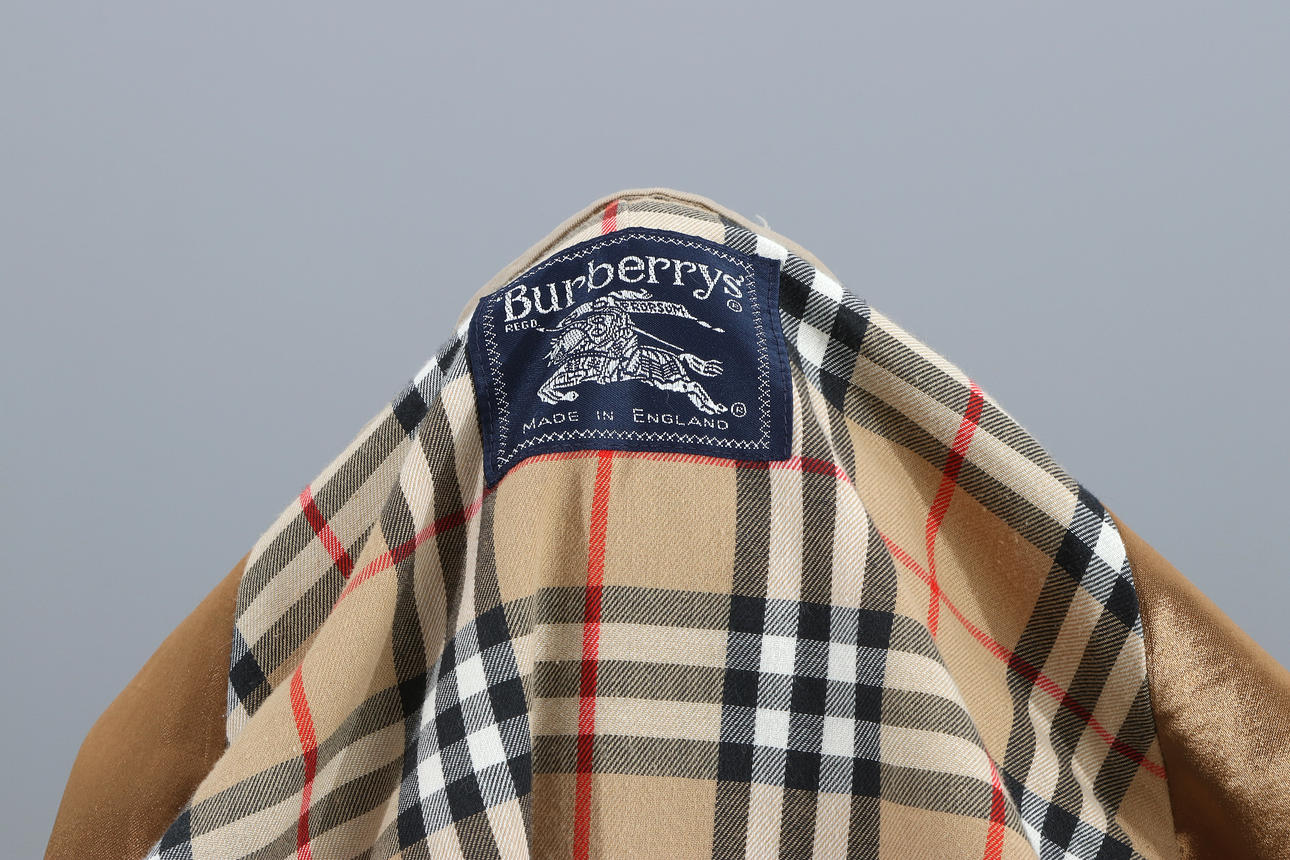 Beige cotton and polyester, inside lined with Burberry checkerboard pattern. Tagged Burberry's Made In England. Back length approx. 108 cm, shoulder to shoulder approx. 46 cm. Size marked 50 Reg C83A.