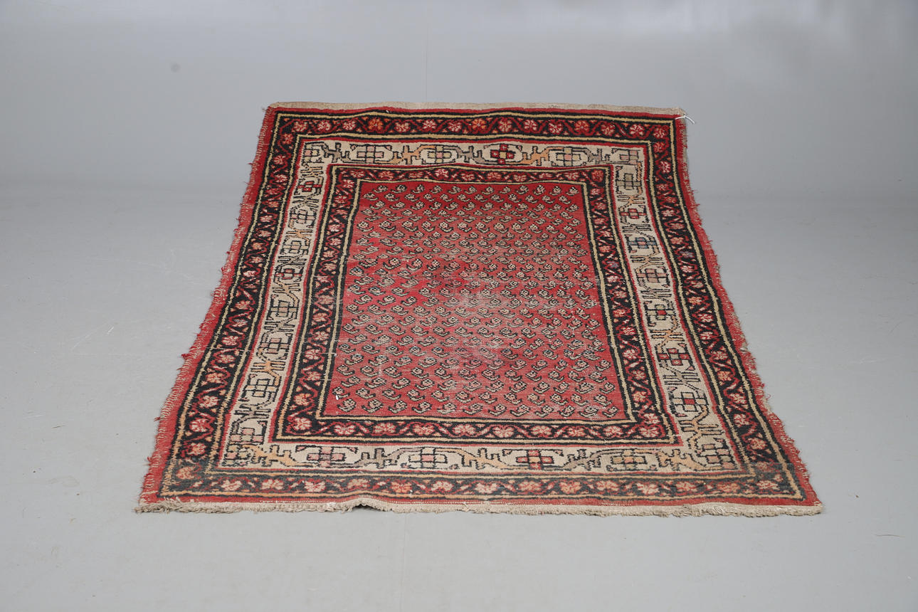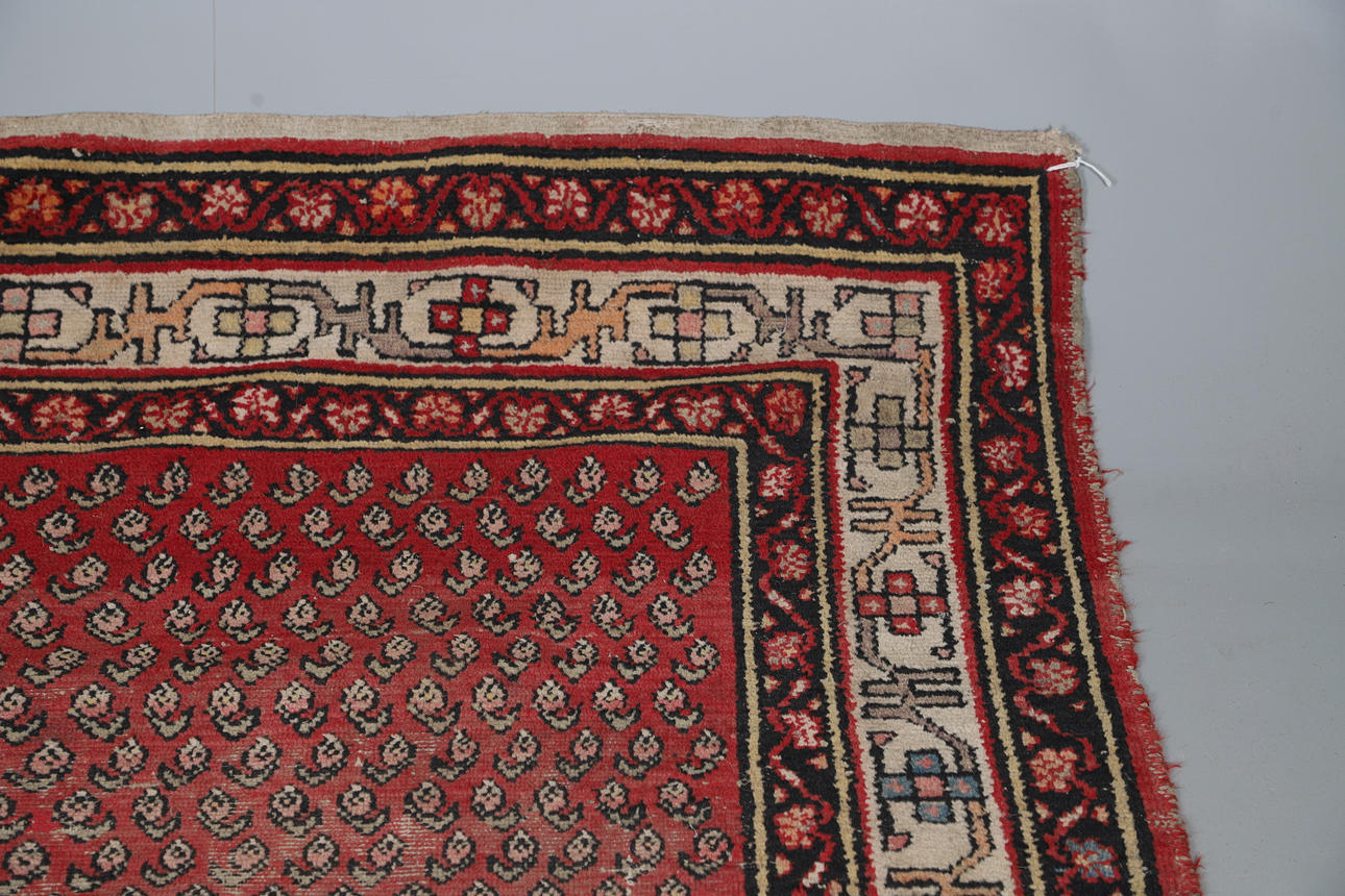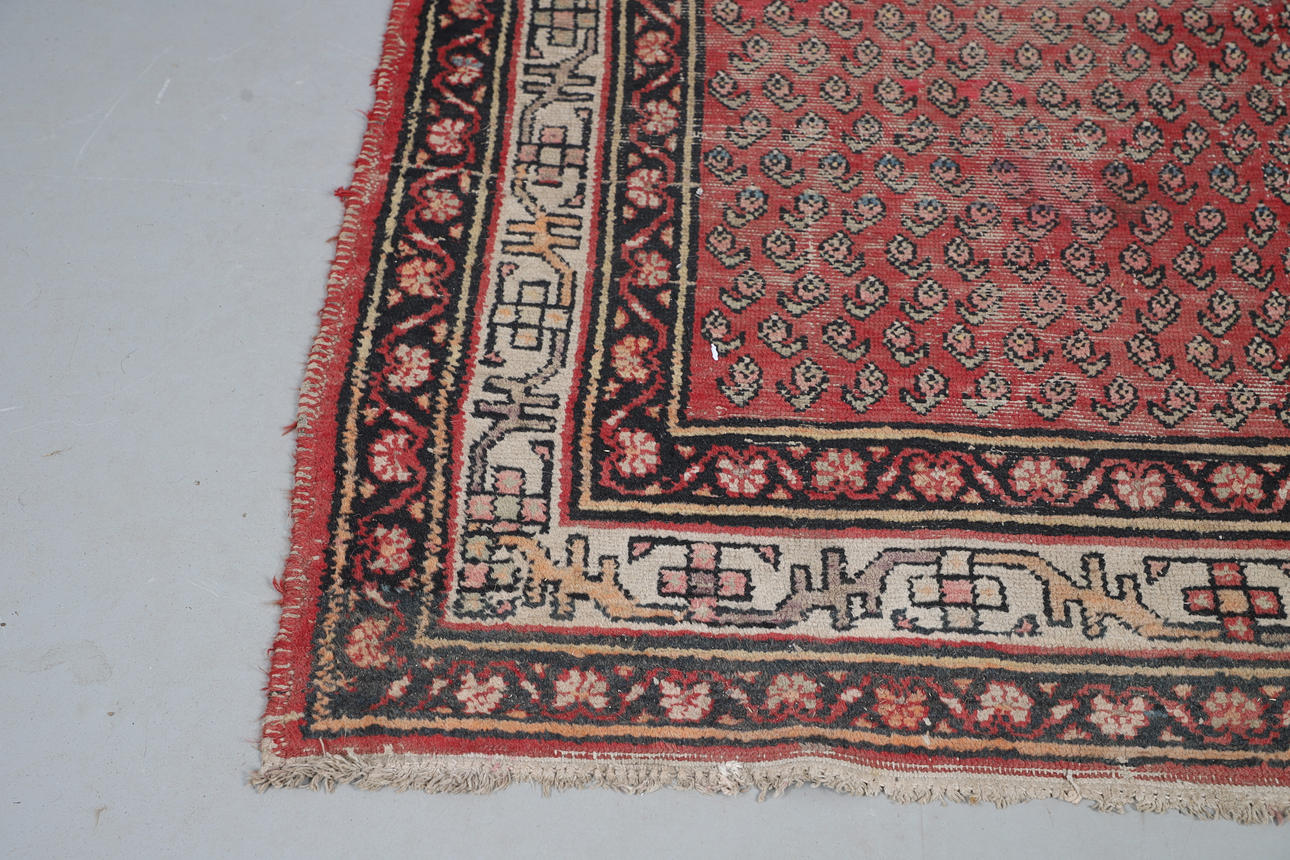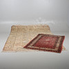 A Melas carpet, the field with a column of medallions enclosed by multiple borders of angular vines and geometric motifs, 290 x 207cm; together with a Serabend Rug, the raspberry field of boteh enclosed by ivory borders of meandering vines, 198 x 122cm.
