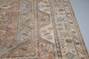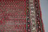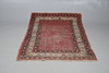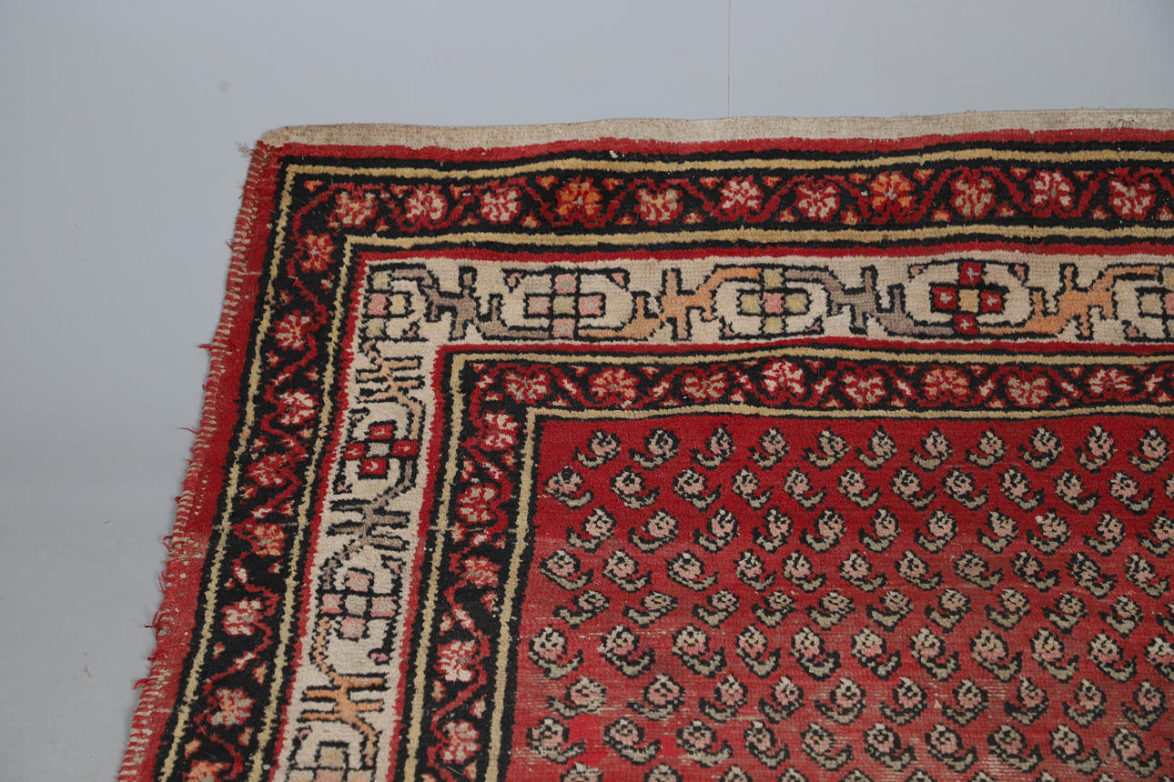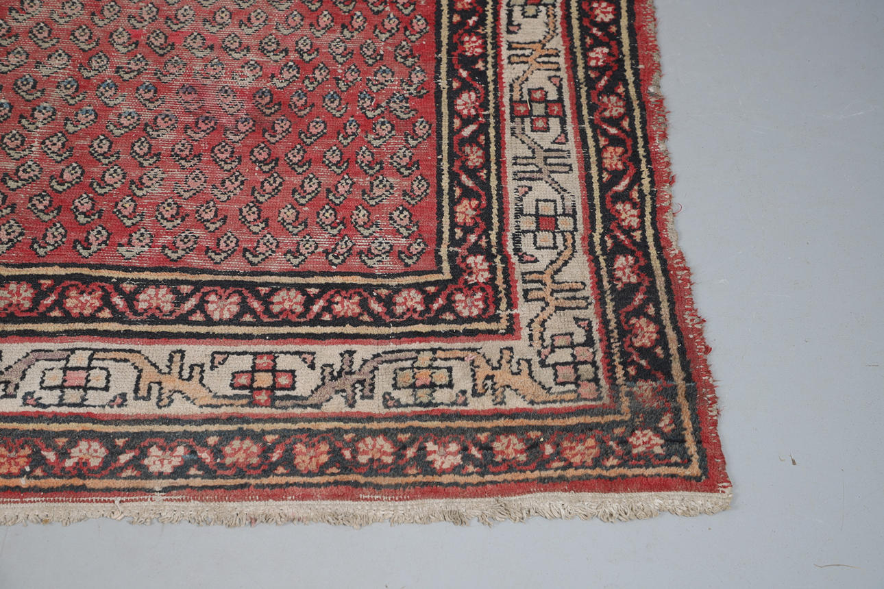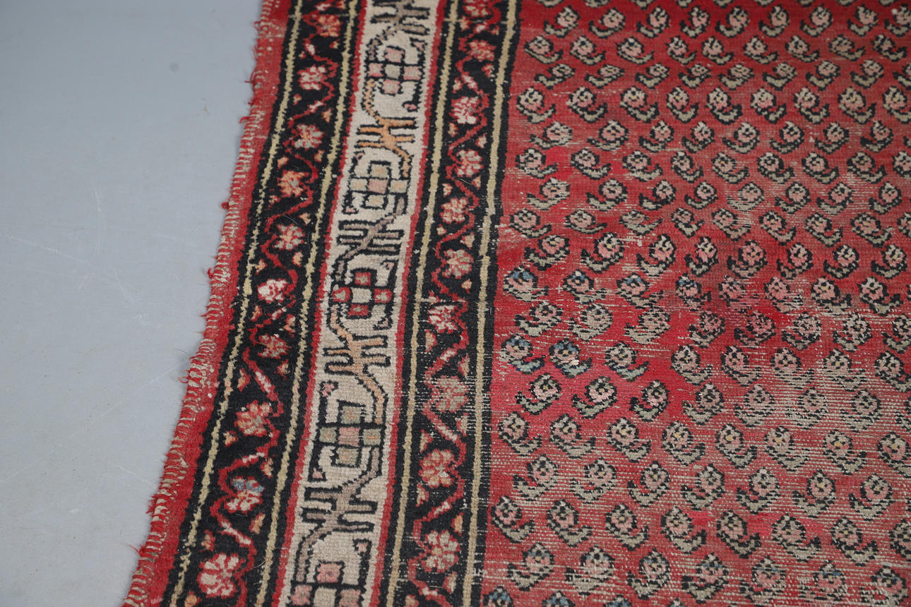 A Melas carpet, the field with a column of medallions enclosed by multiple borders of angular vines and geometric motifs, 290 x 207cm; together with a Serabend Rug, the raspberry field of boteh enclosed by ivory borders of meandering vines, 198 x 122cm.