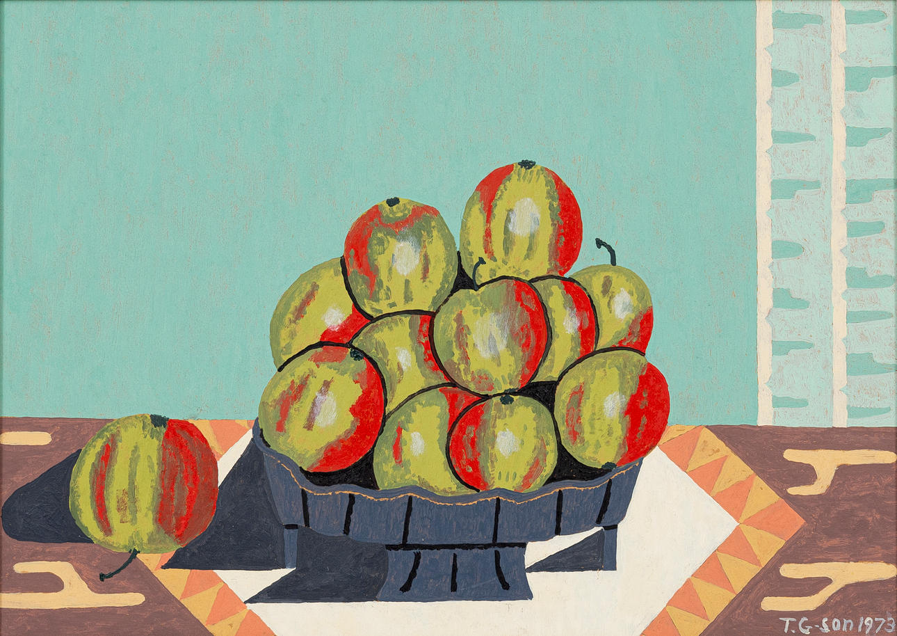OIDENTIFIERAD KONSTNÄR. Still life with apples, oil on panel, signed T.G-son, dated 1973.