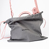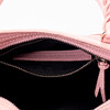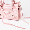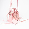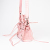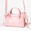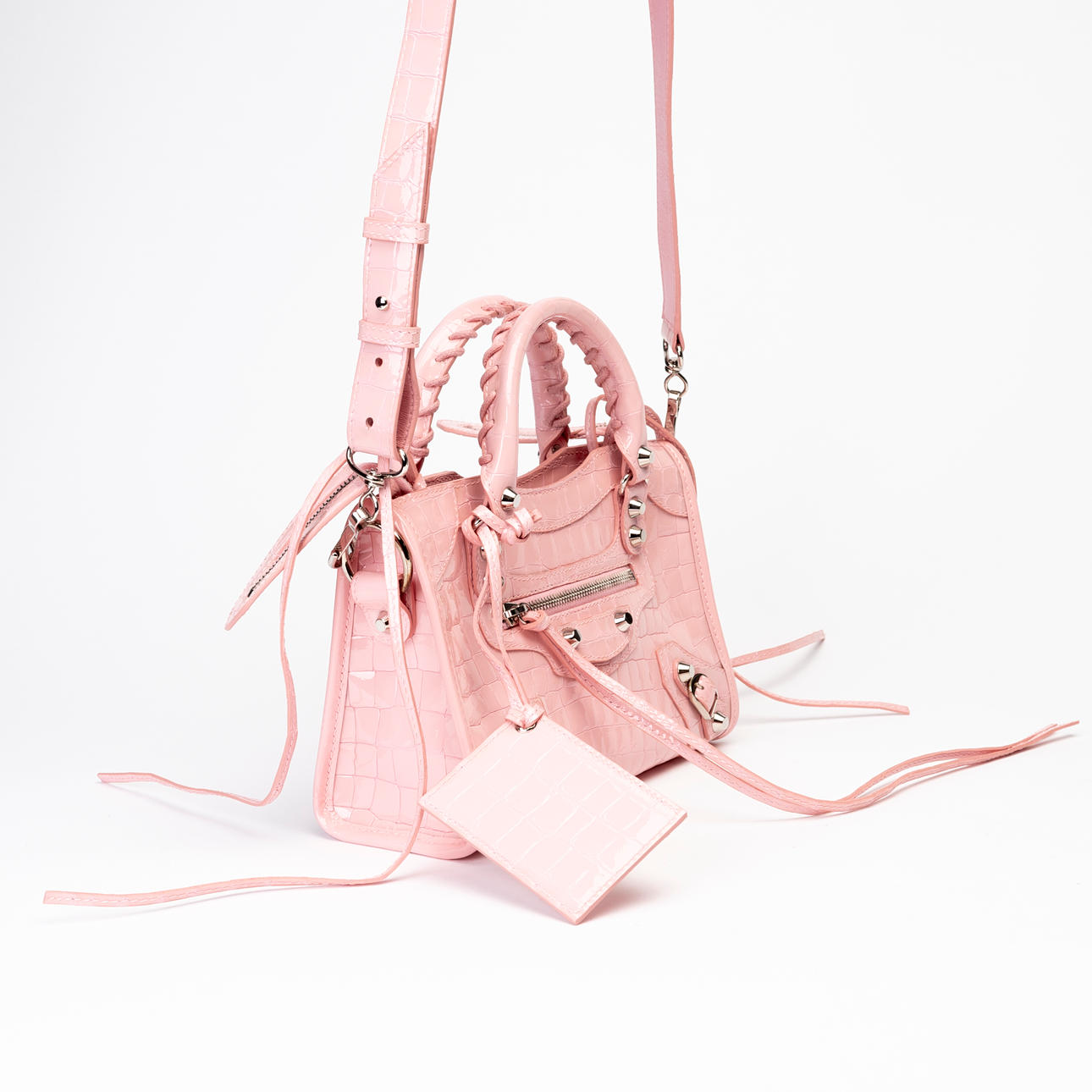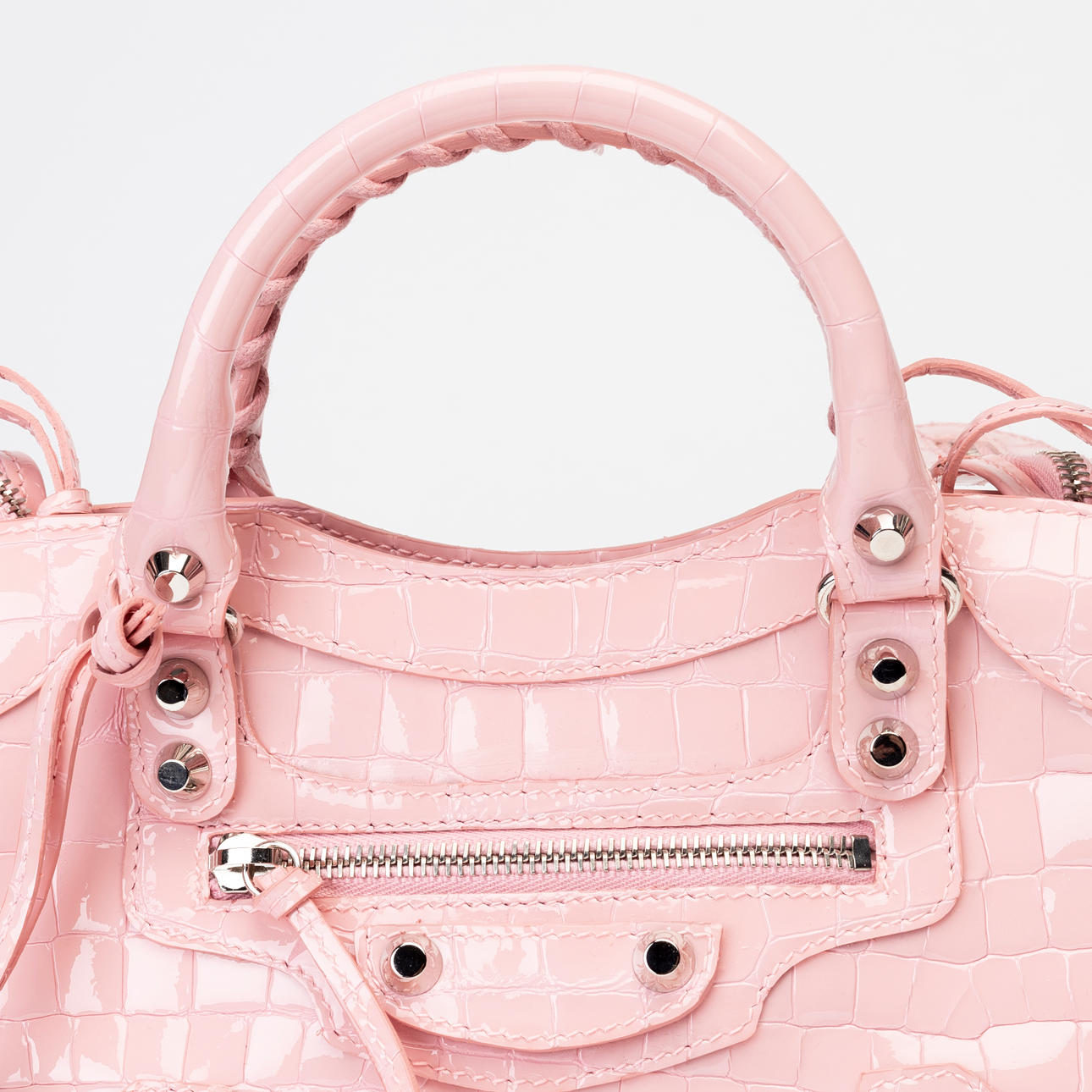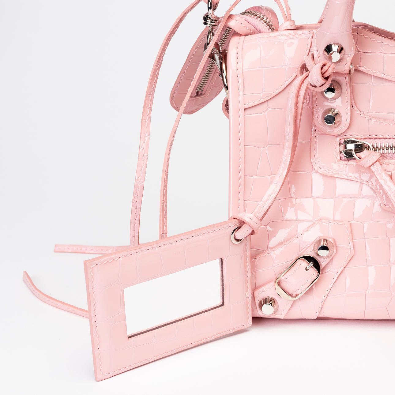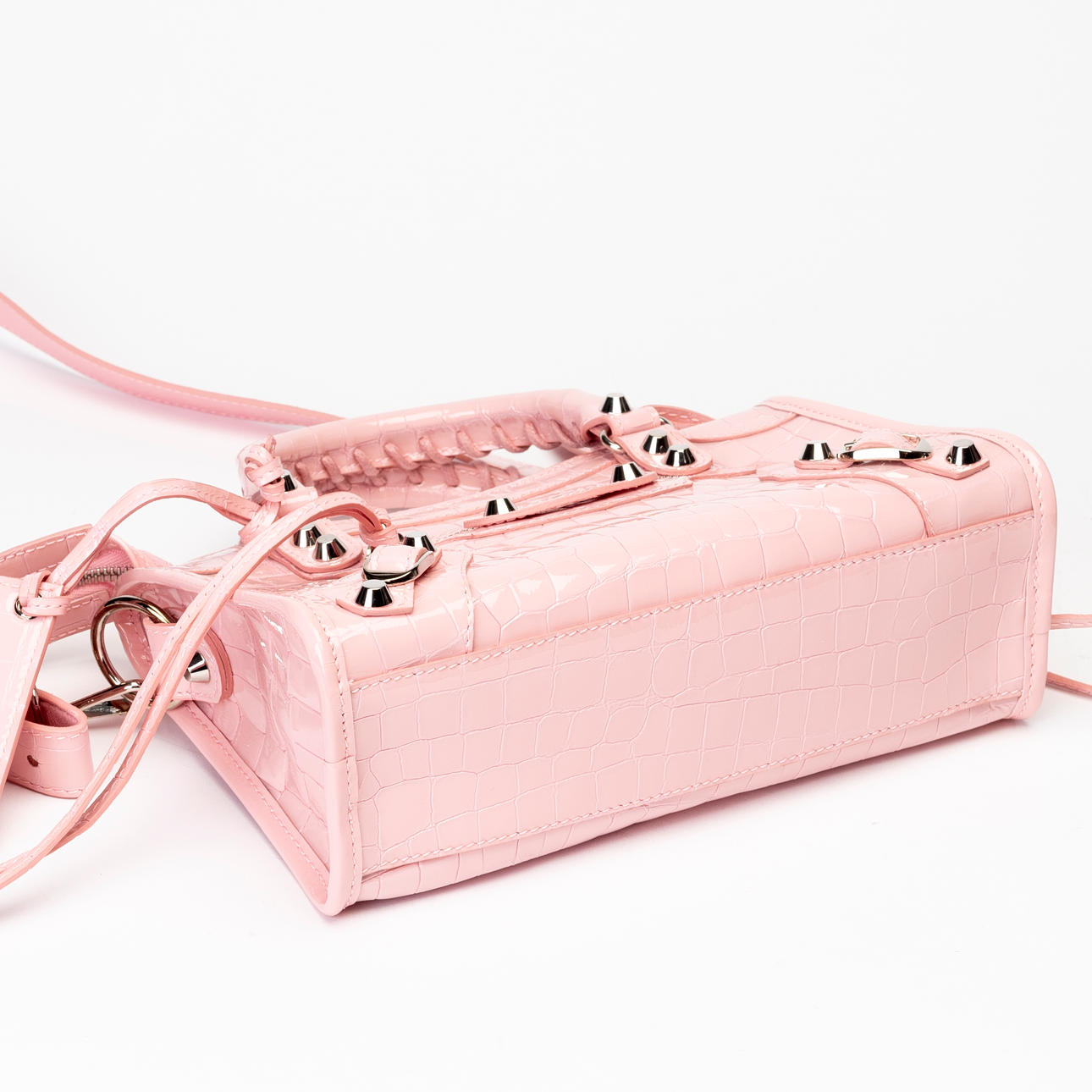 Bubble gum pink lacquered crocodile embossed leather with silver hardware. Front hanging pocket mirror. Lined with black fabric, two compartments, one of which with zipper. Marked “BALENCIAGA MADE IN ITALY” and with serial number.