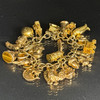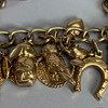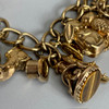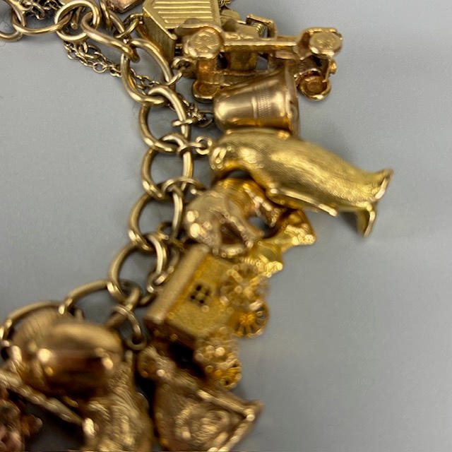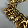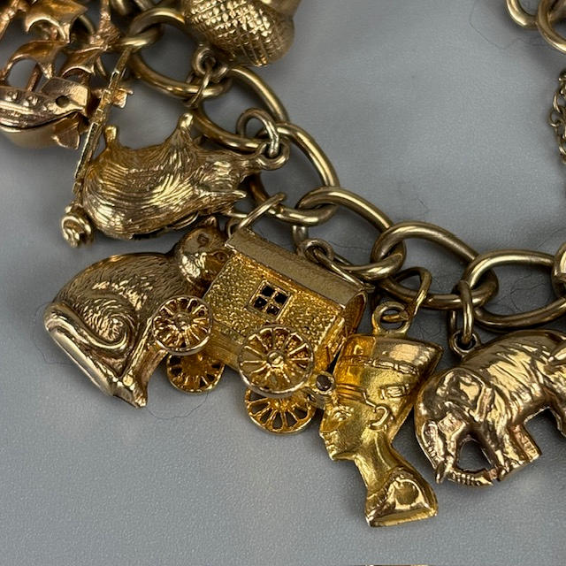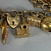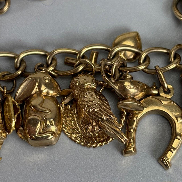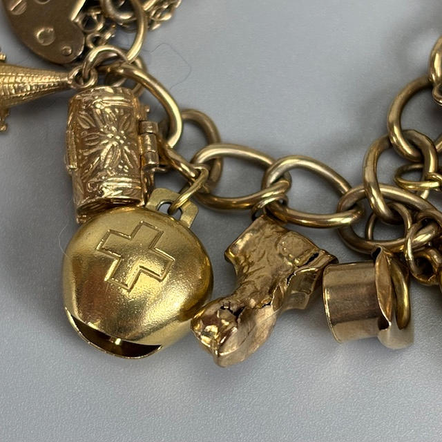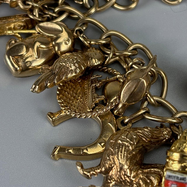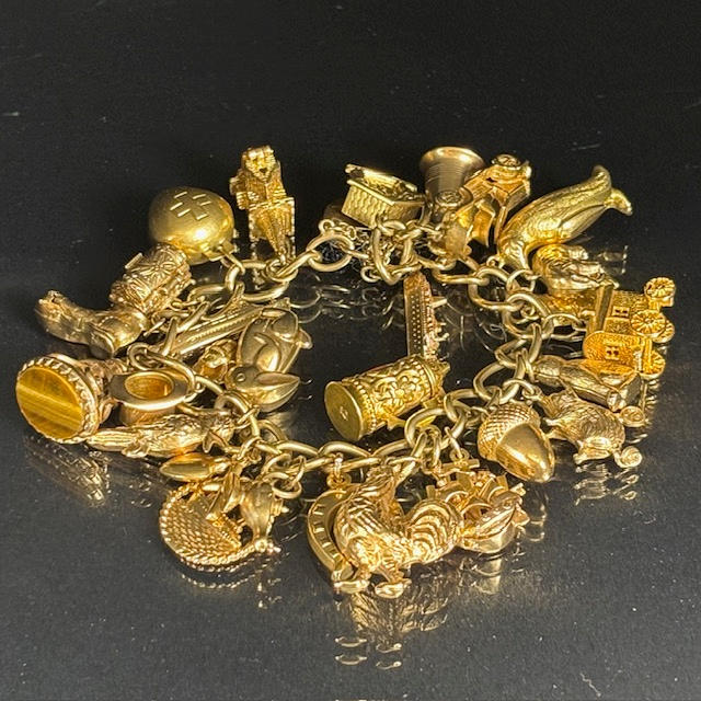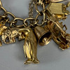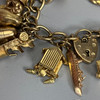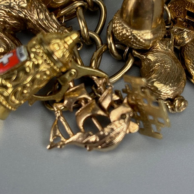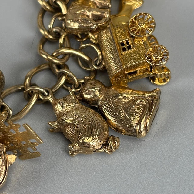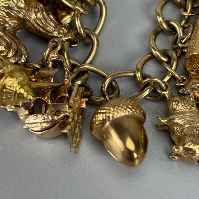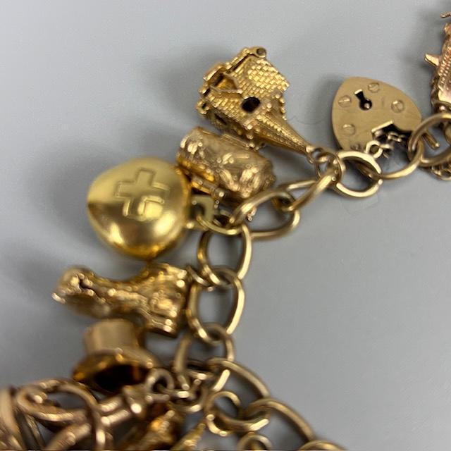 9ct gold charm bracelet with heart lock and an assortment of attached gold charms, to include Cockrel, Acorn, Cruise Liner, Cat, Clock, Vintage Car, Church, Swiss Bell, 29, approximately 66.9g total.