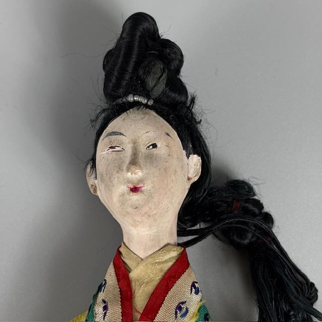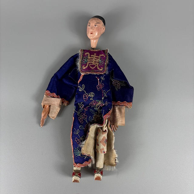 Two Chinese dolls in traditional costumes, one male, one female, approximately 25cm tall.
