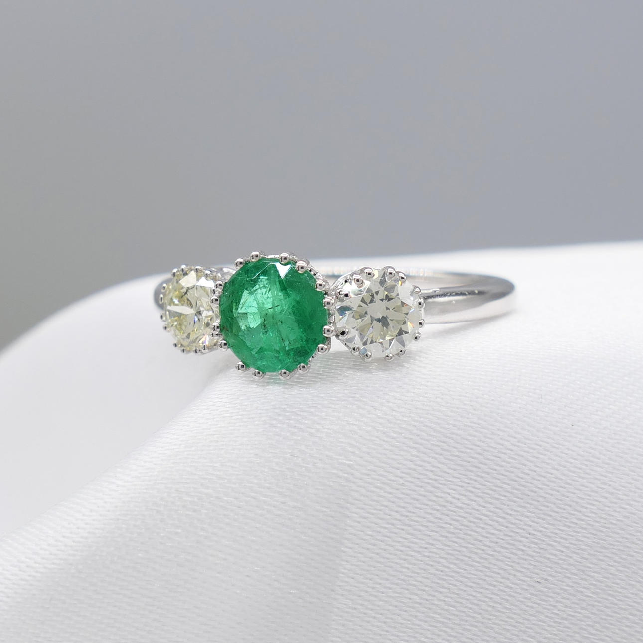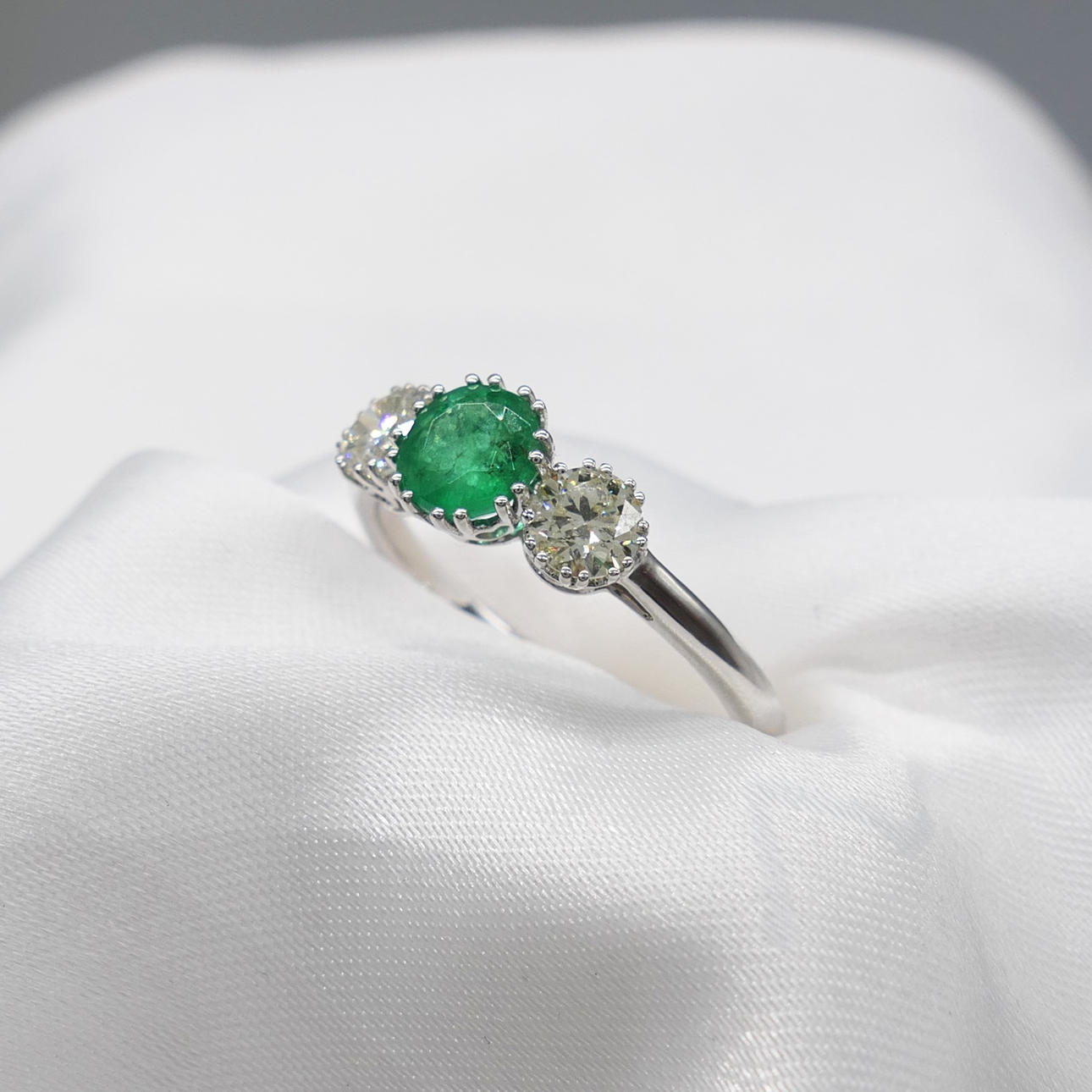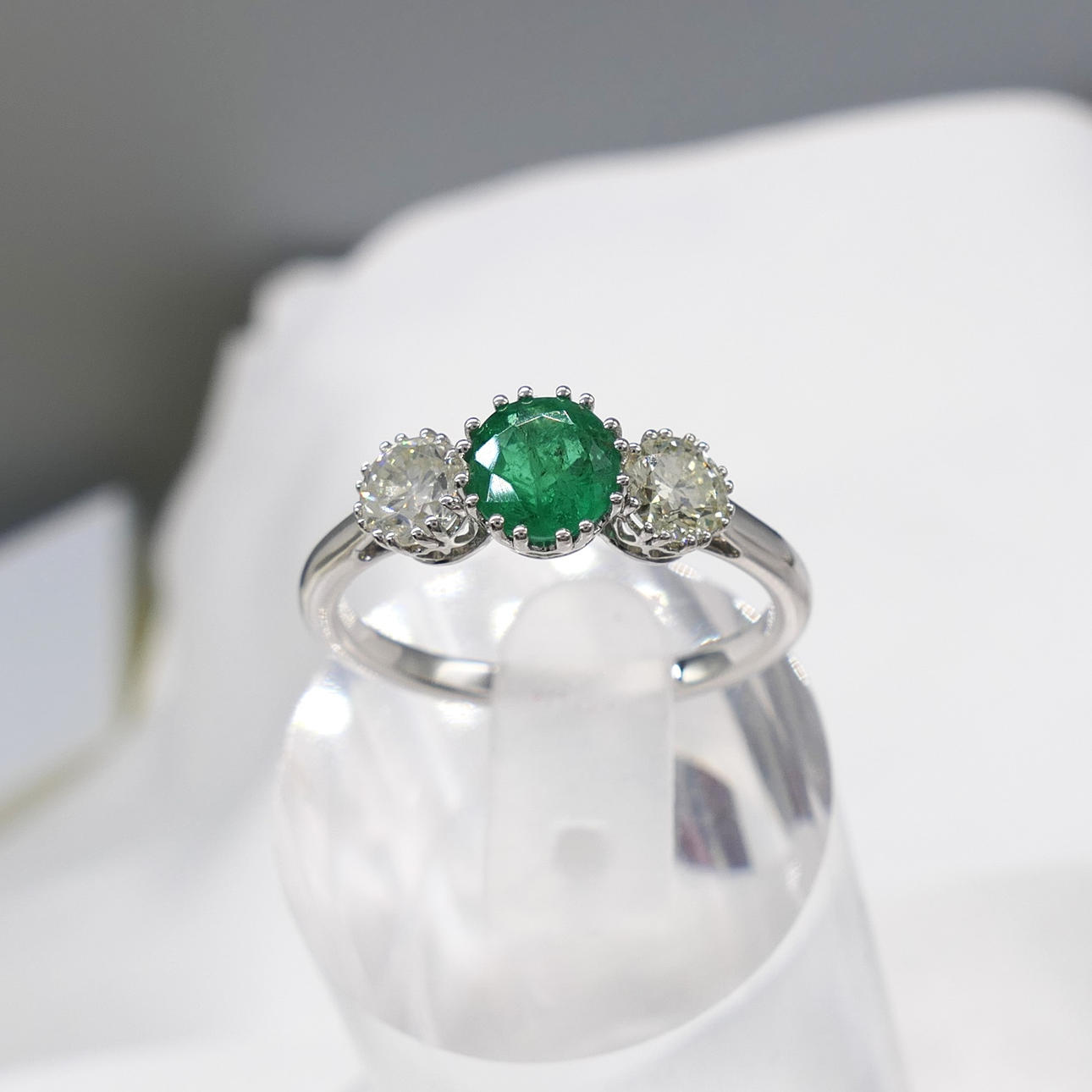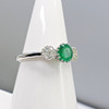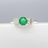 An 18k white gold 3-stone ring set with an emerald and two flanking diamonds, with gift box